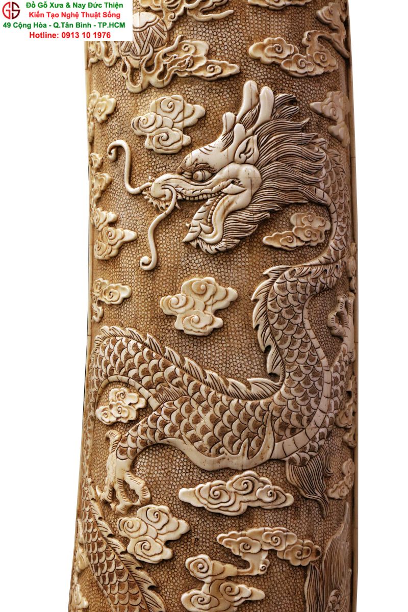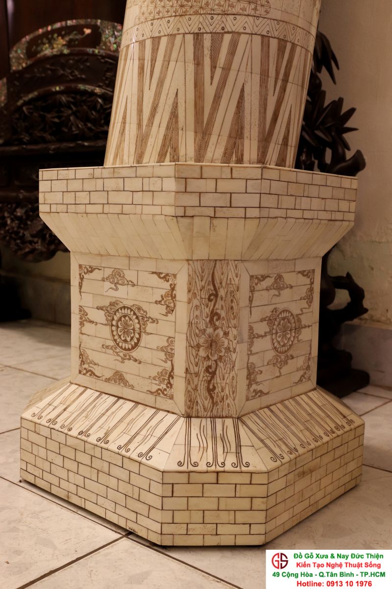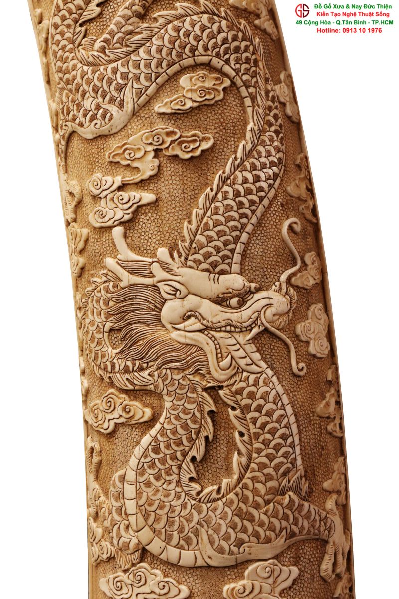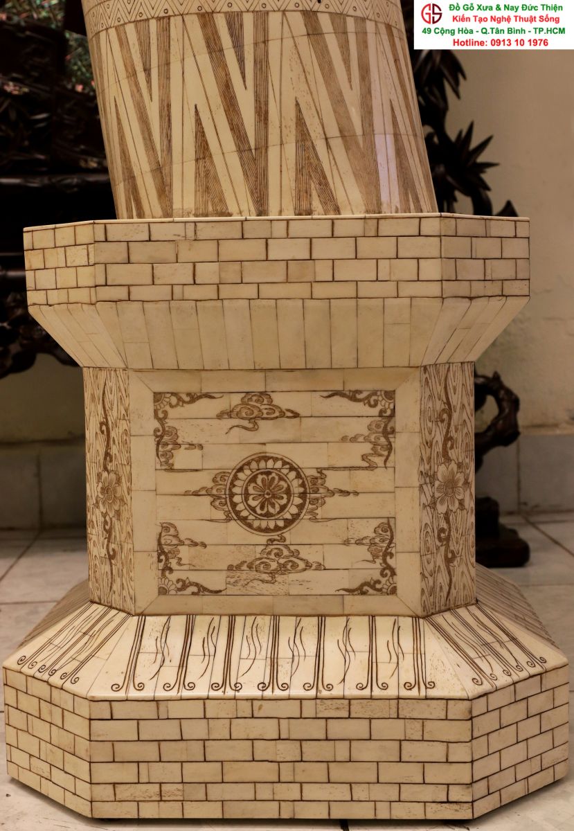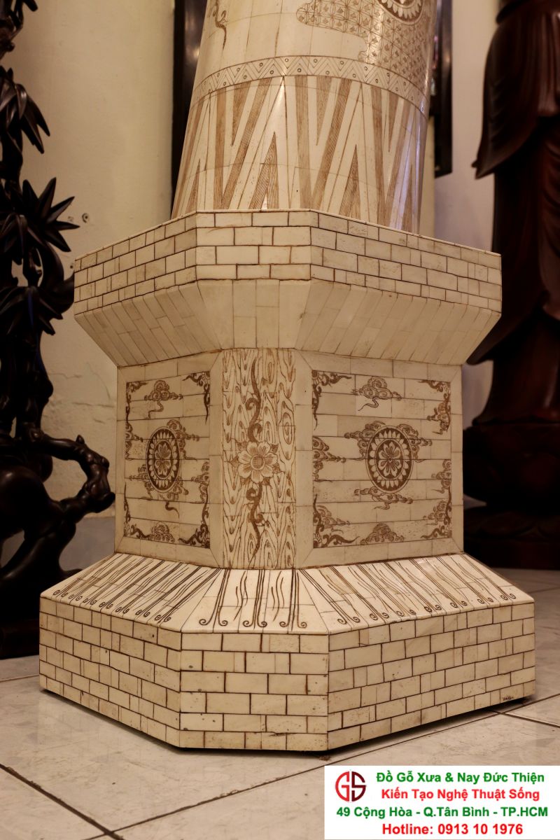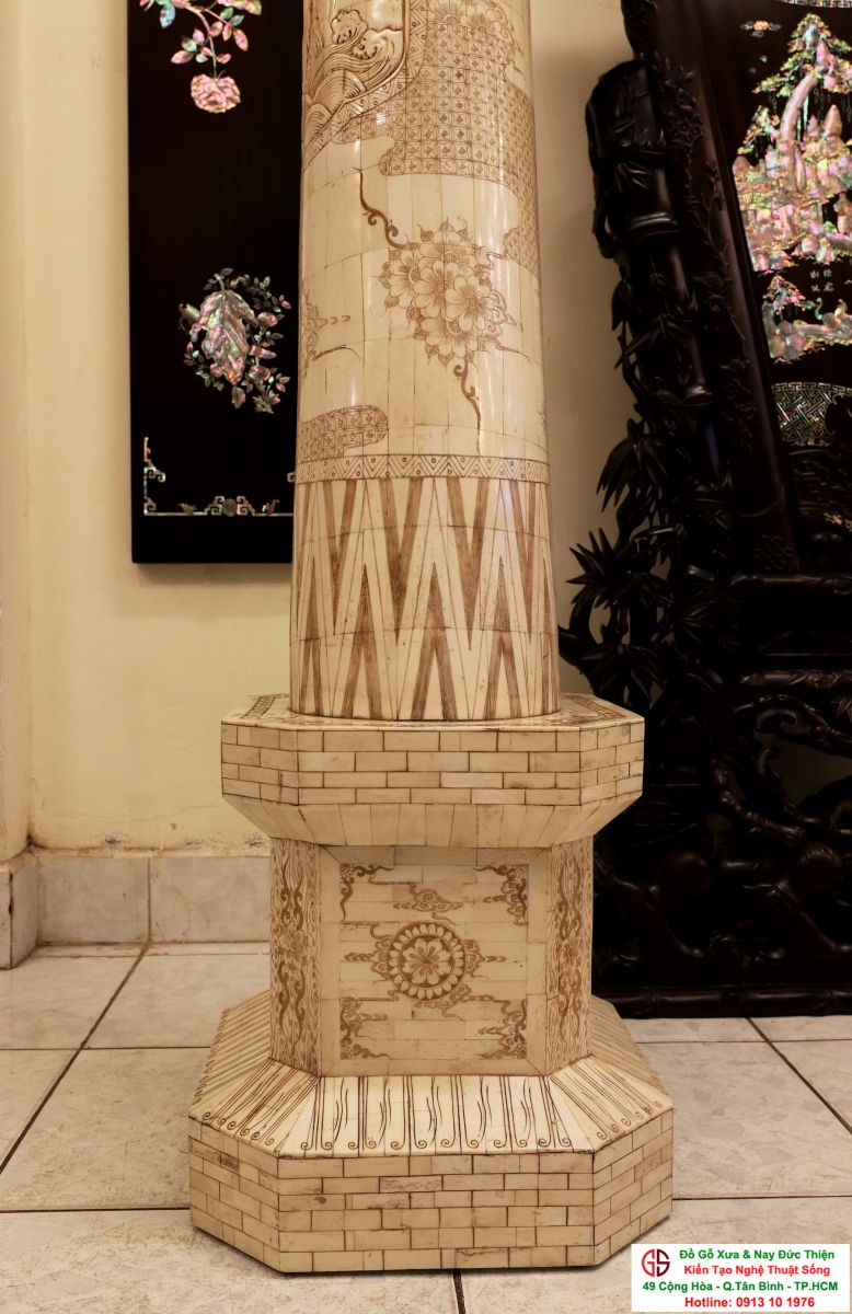 Có lẽ không cần nói nhiều, bạn ắt hẳn cũng đang cảm nhận thấy độ hoành tráng, vẻ đẹp sang trọng của cặp ngà voi được xếp vào hạng :" Siêu To Khổng Lồ " hàng hiếm này nữa. Với chiều cao lên tới 306 cm , chỗ lớn nhất có chiều rộng là 42 cm, những thợ thủ công đã rất khéo léo và tài tình khi sử dụng từng miếng xương nhỏ có kích thước khoảng 2 x 3 cm tạo hình lên một cặp ngà voi lớn, thon thả và cân đối. Không dừng lại ở đó, những người nghệ nhân còn tỉ mỉ gọn dũa, chạm khắc những hình tượng Long Ẩn - Long Cuốn thủy, những đường nét hoa văn mang dấu ấn cung đình, hoàng tộc quý phái.
