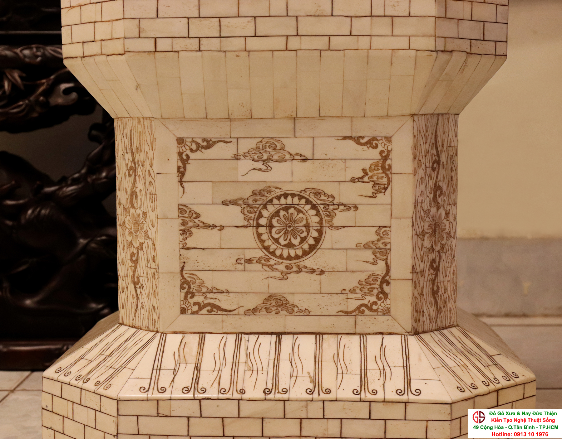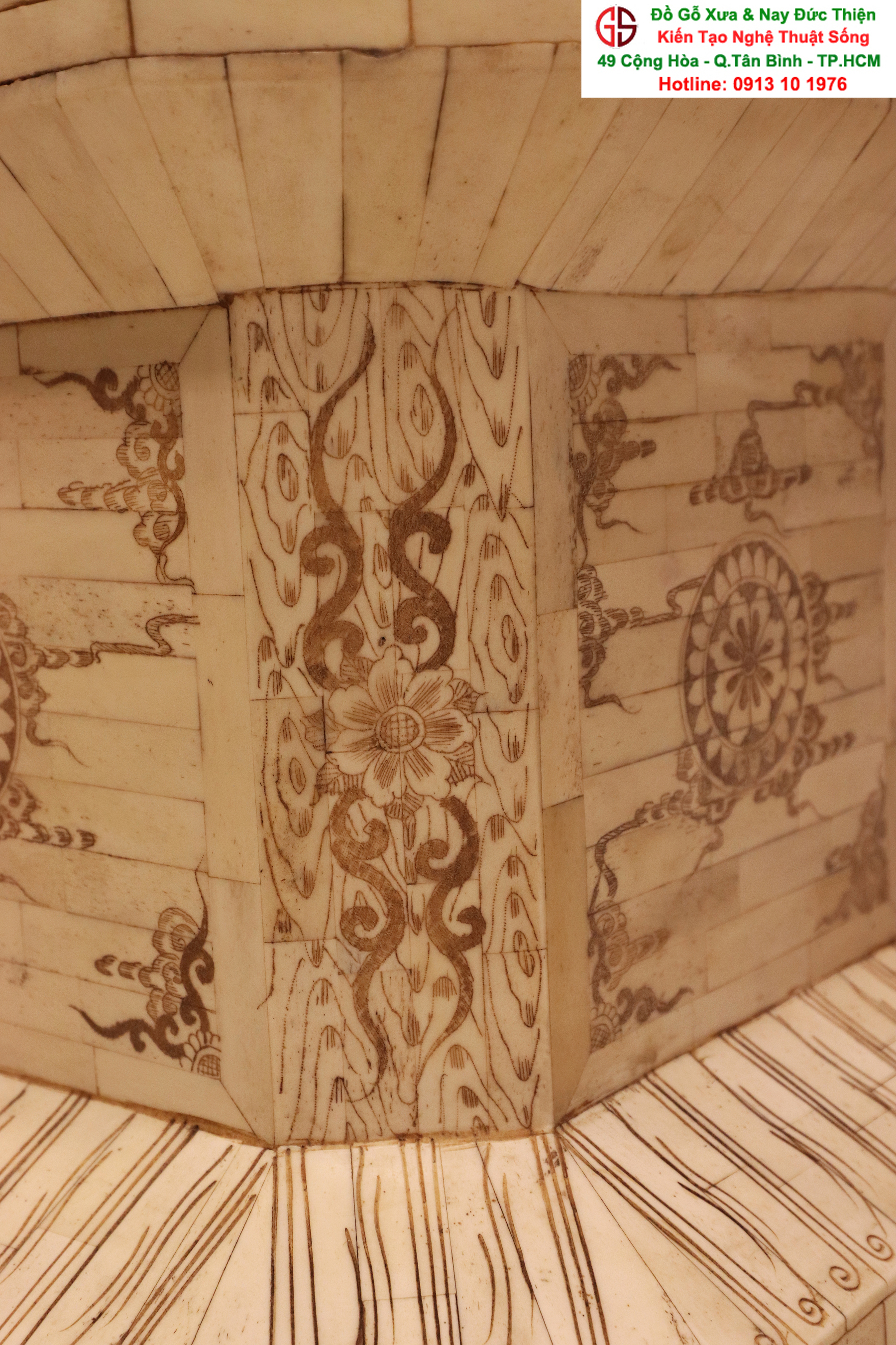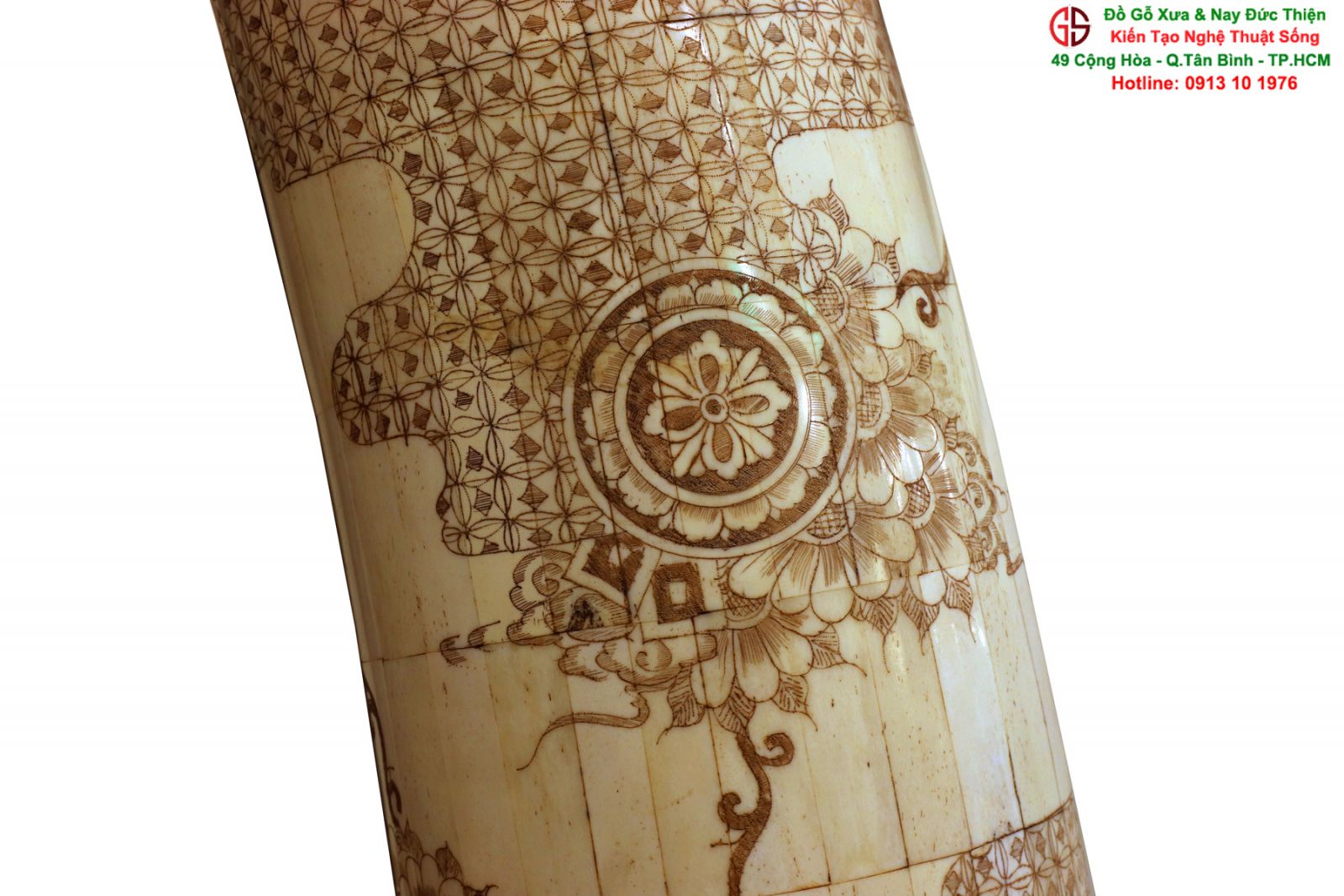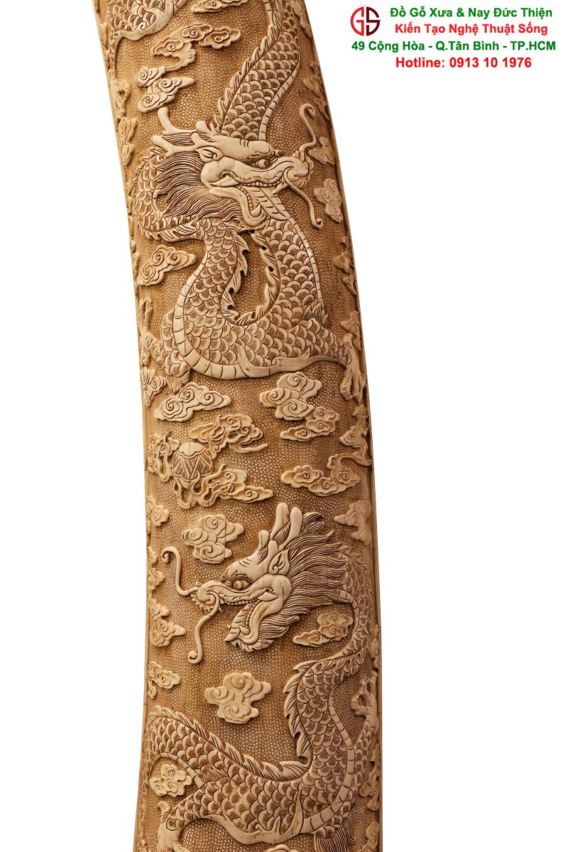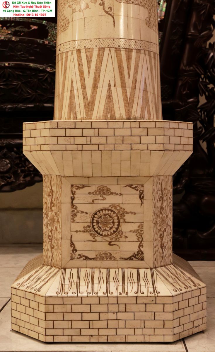 Có lẽ không cần nói nhiều, bạn ắt hẳn cũng đang cảm nhận thấy độ hoành tráng, vẻ đẹp sang trọng của cặp ngà voi được xếp vào hạng :" Siêu To Khổng Lồ " hàng hiếm này nữa. Với chiều cao lên tới 306 cm , chỗ lớn nhất có chiều rộng là 42 cm, những thợ thủ công đã rất khéo léo và tài tình khi sử dụng từng miếng xương nhỏ có kích thước khoảng 2 x 3 cm tạo hình lên một cặp ngà voi lớn, thon thả và cân đối. Không dừng lại ở đó, những người nghệ nhân còn tỉ mỉ gọn dũa, chạm khắc những hình tượng Long Ẩn - Long Cuốn thủy, những đường nét hoa văn mang dấu ấn cung đình, hoàng tộc quý phái.