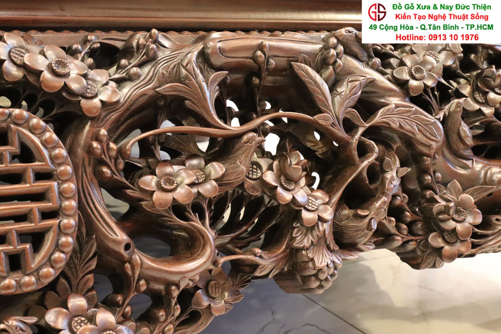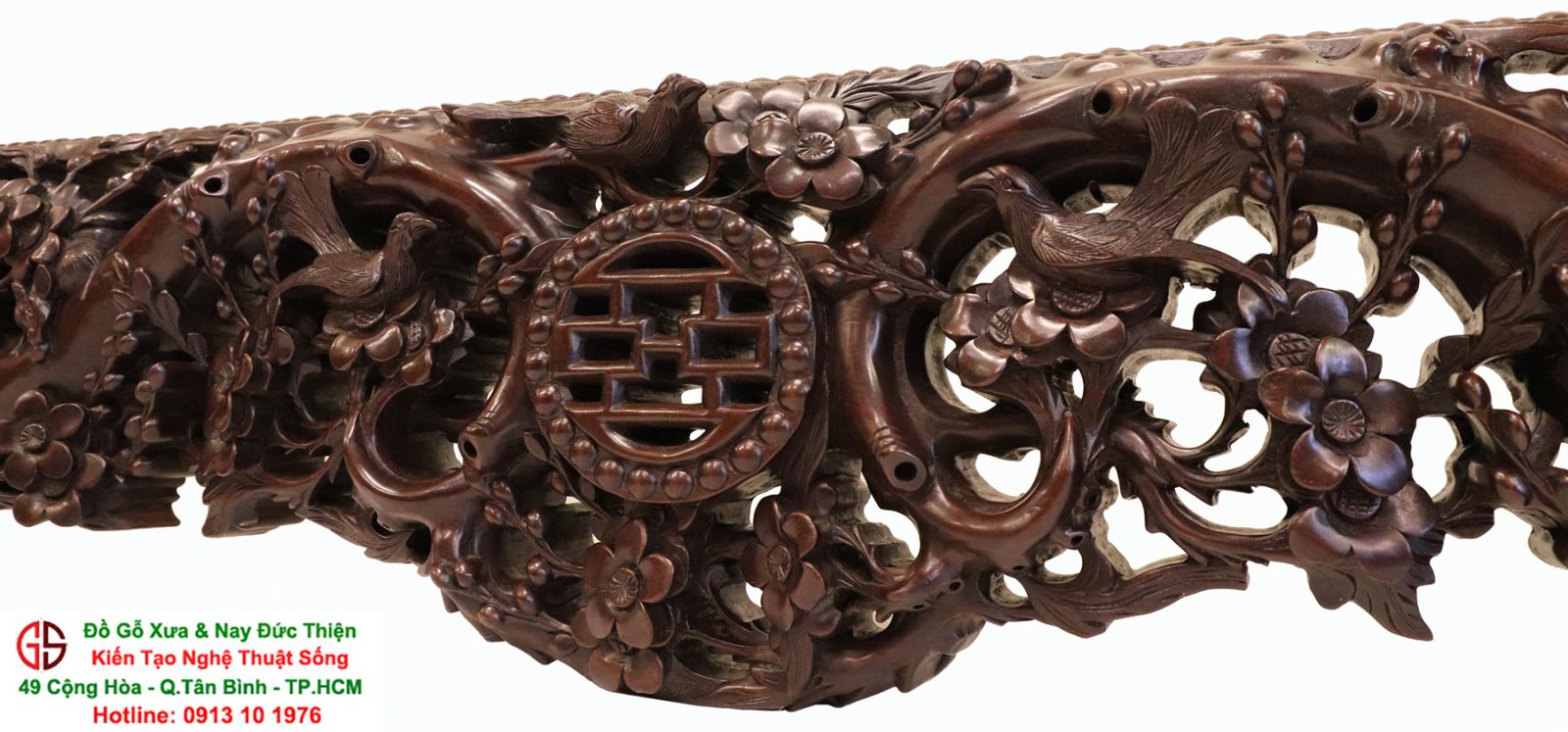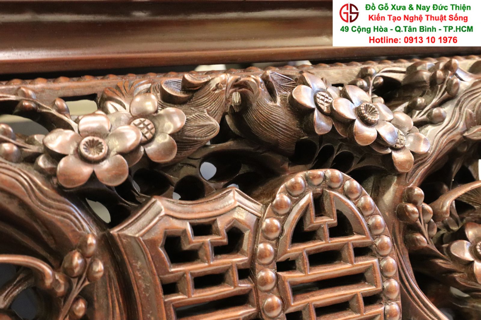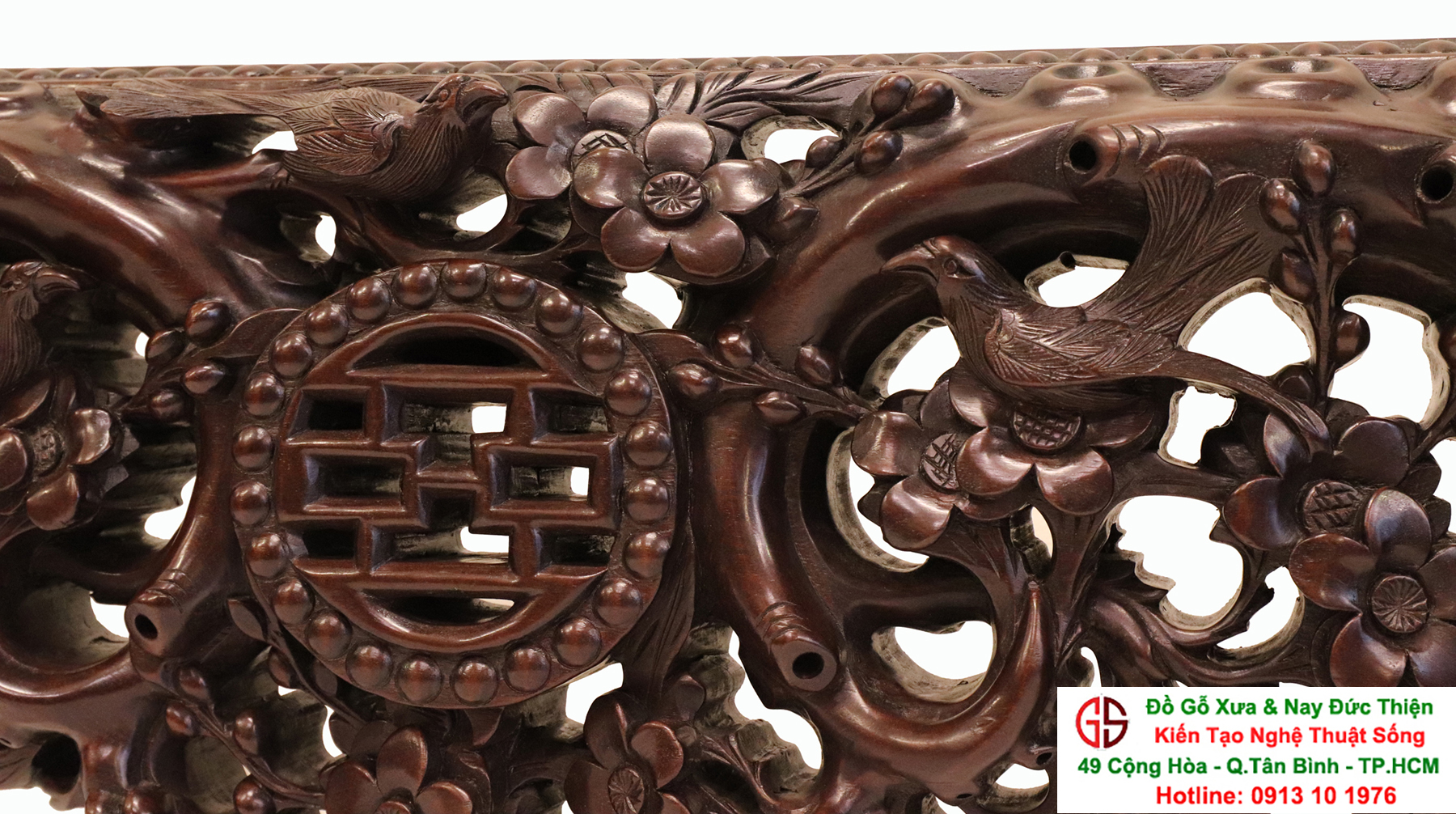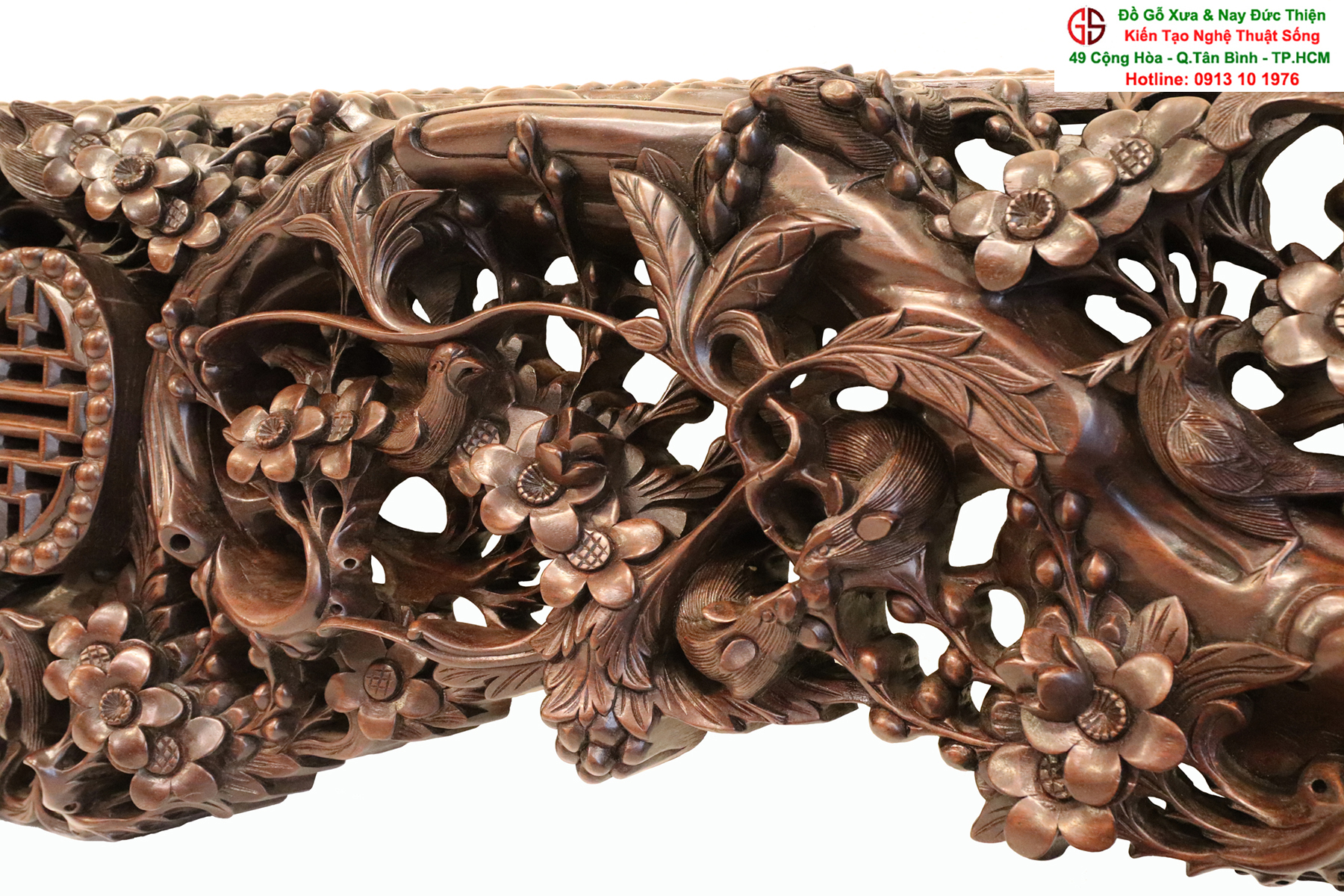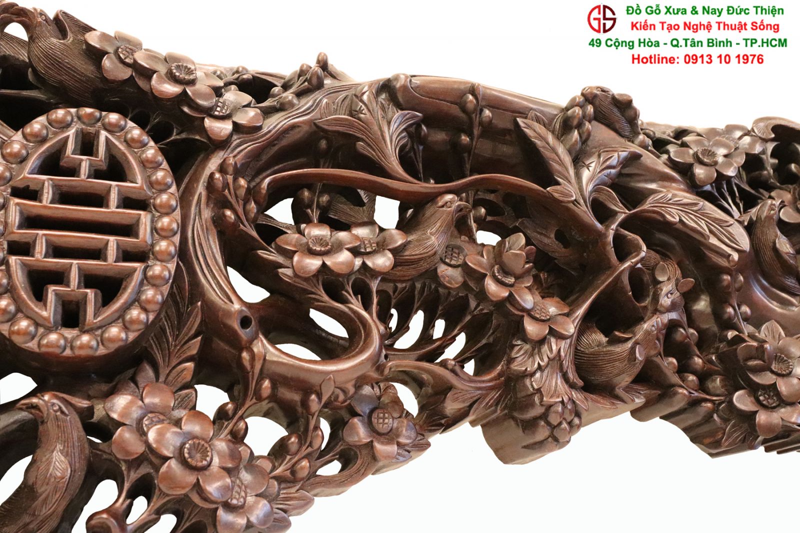 Hình ảnh chi tiết mẫu sập Mai Điểu với những hình chạm khắc tinh tế đầy tinh xảo: