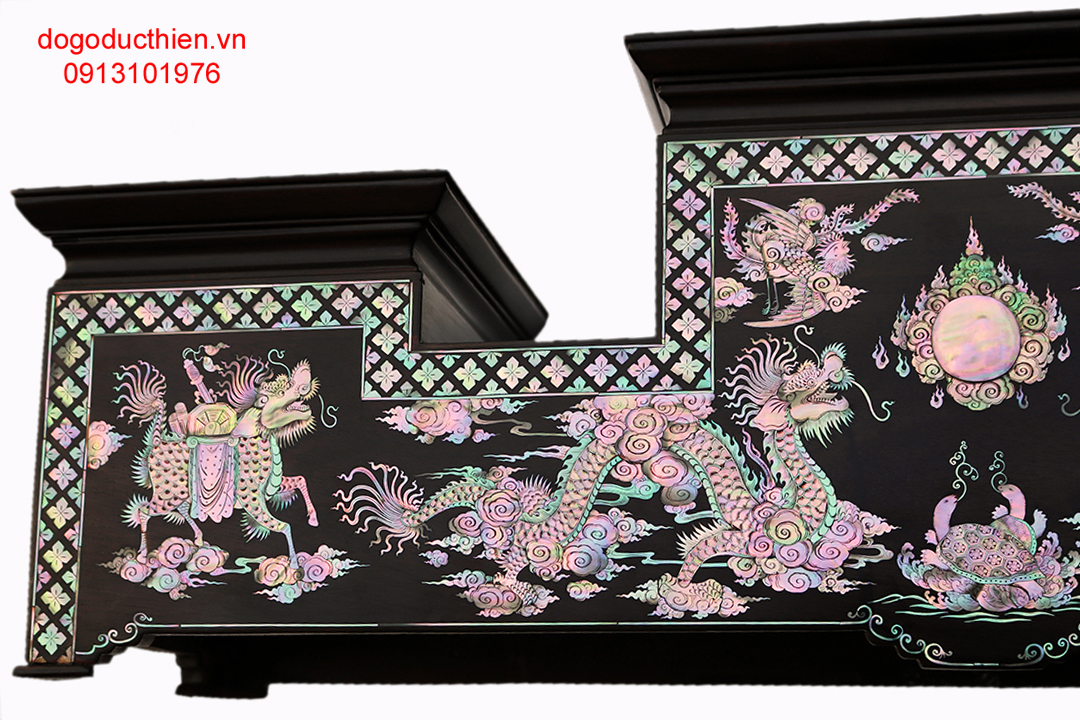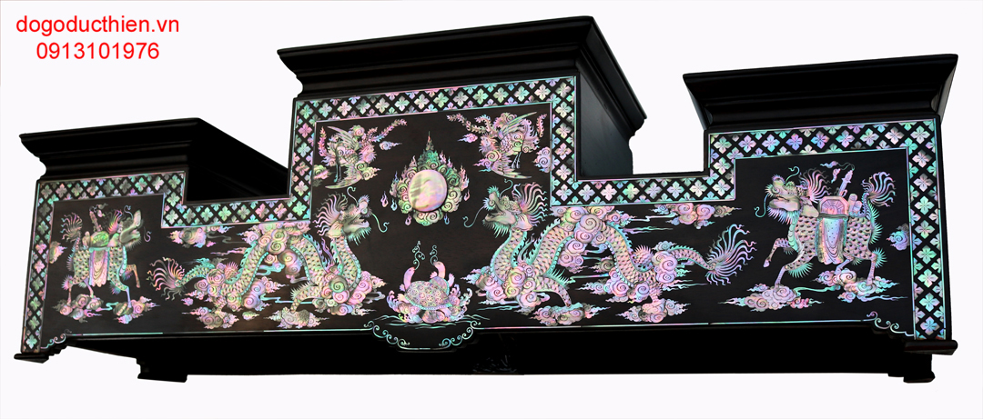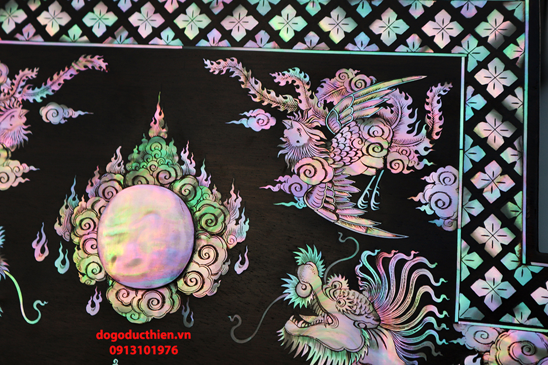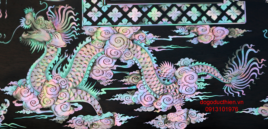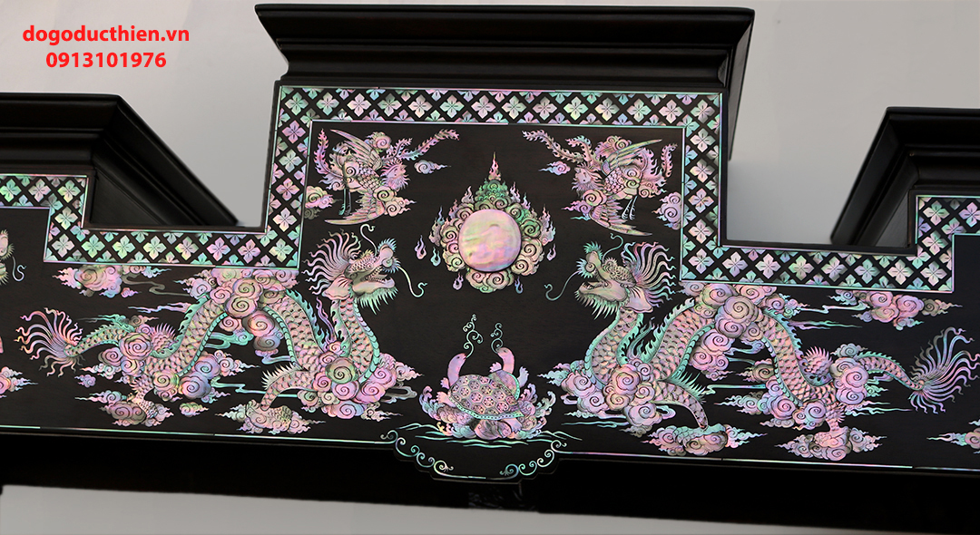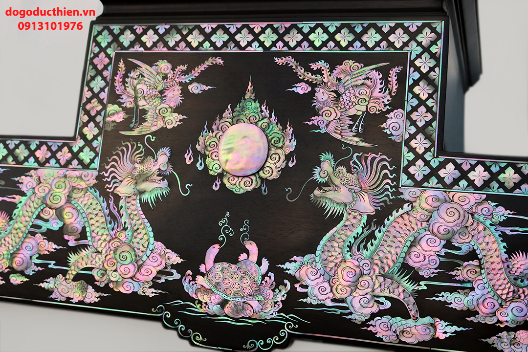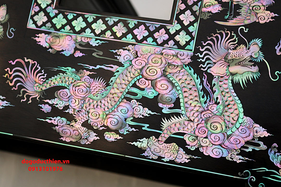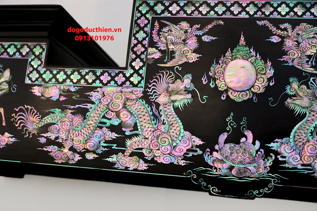 Chất Liệu: Gỗ Gụ, khảm ốc sà cừ đỏ lửa vàng chanh, hàng sen lọng kỹ.