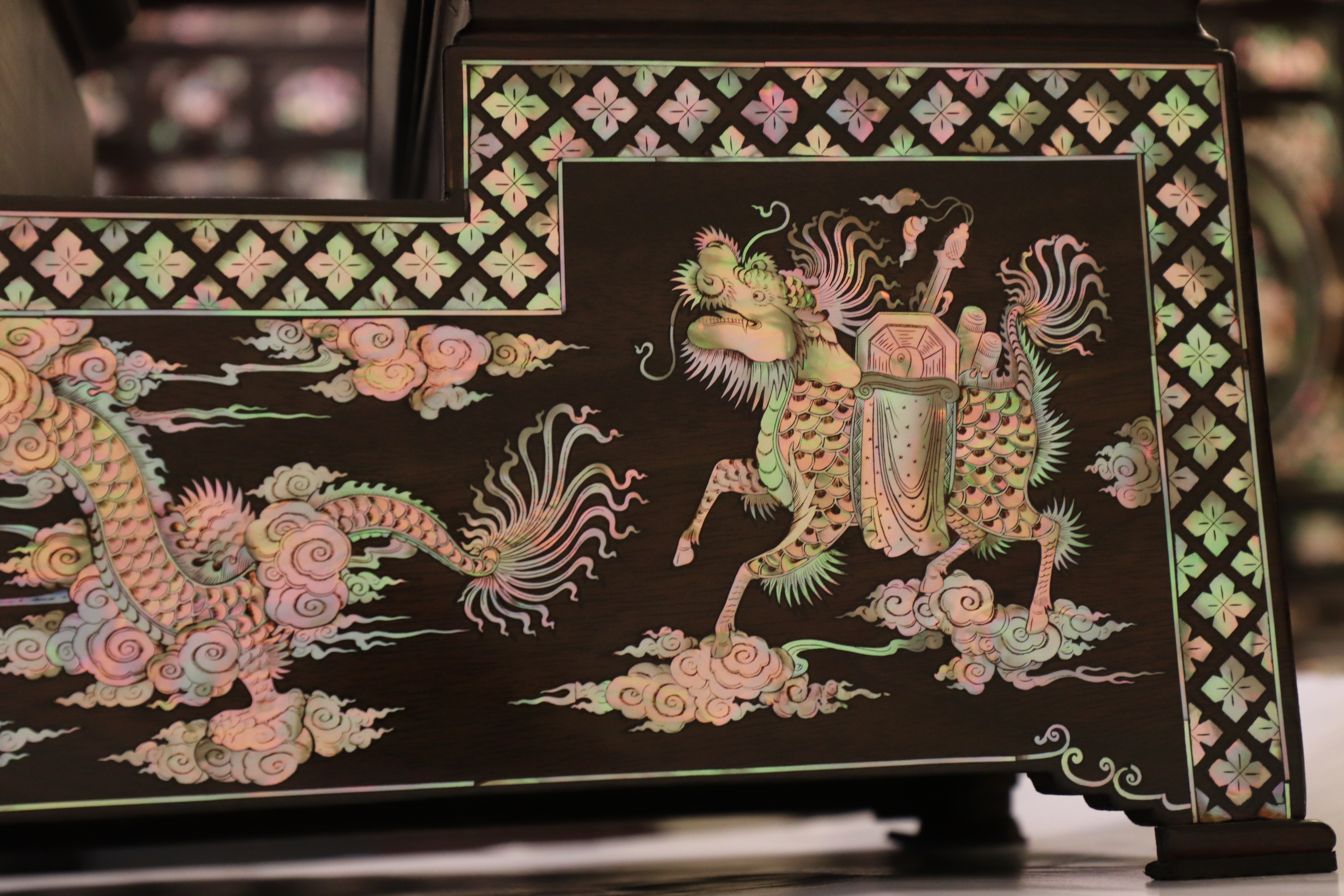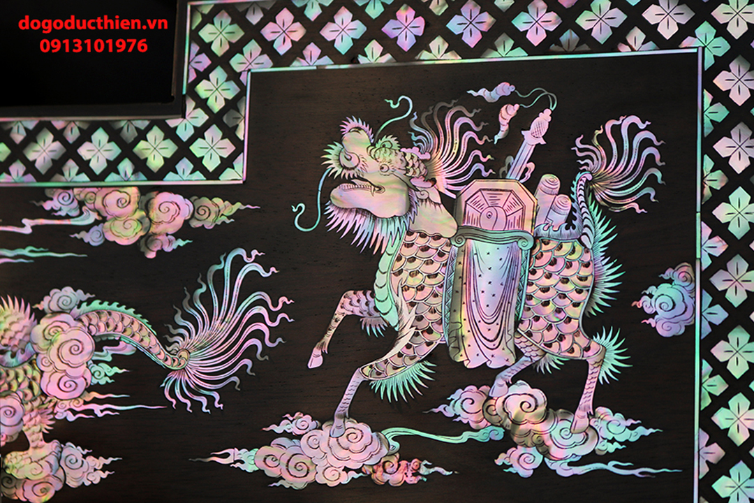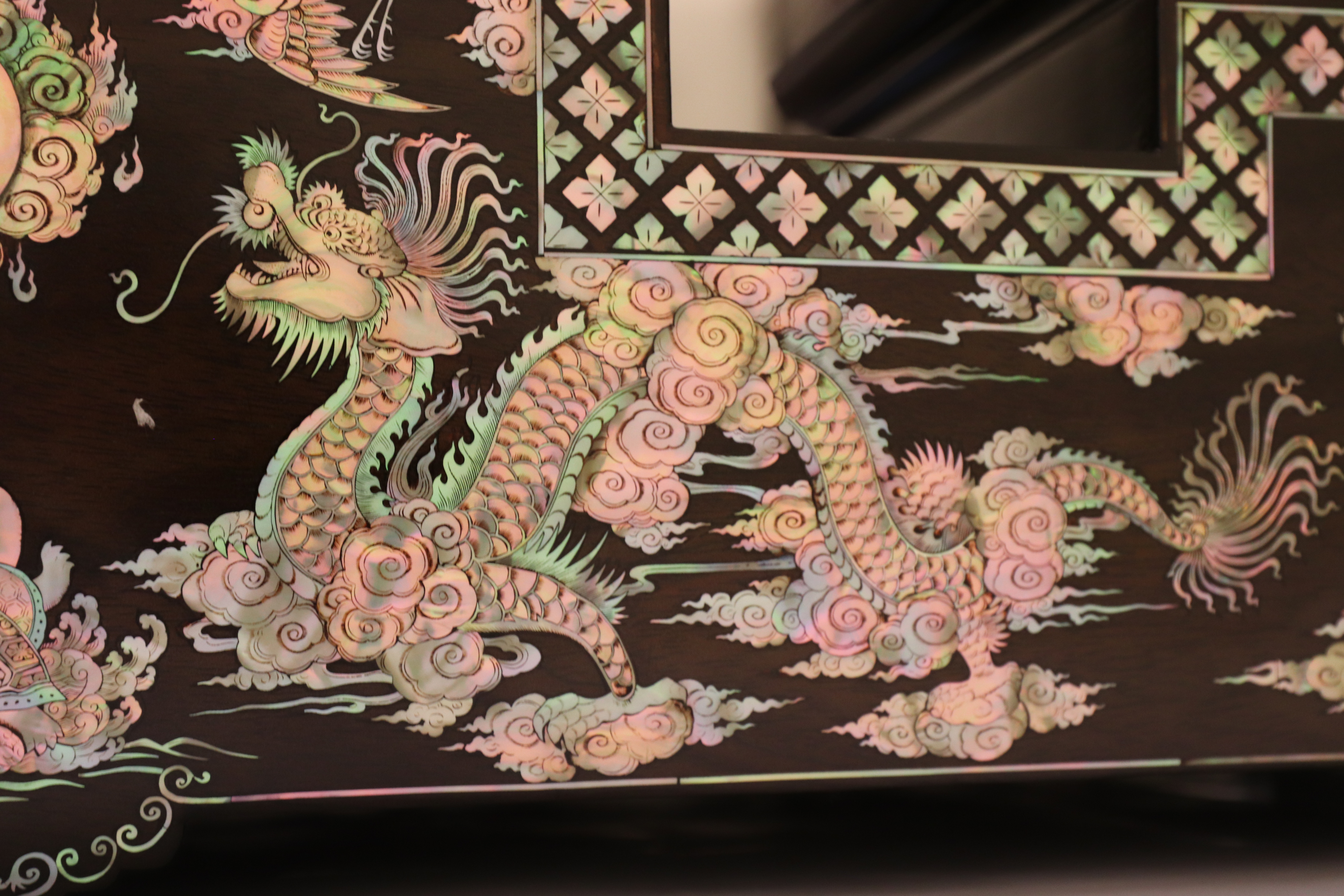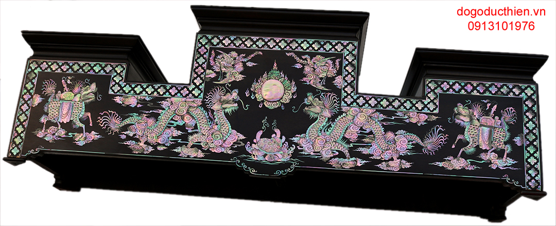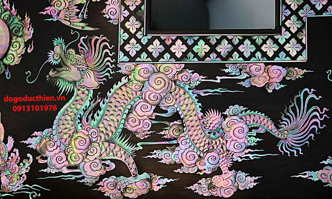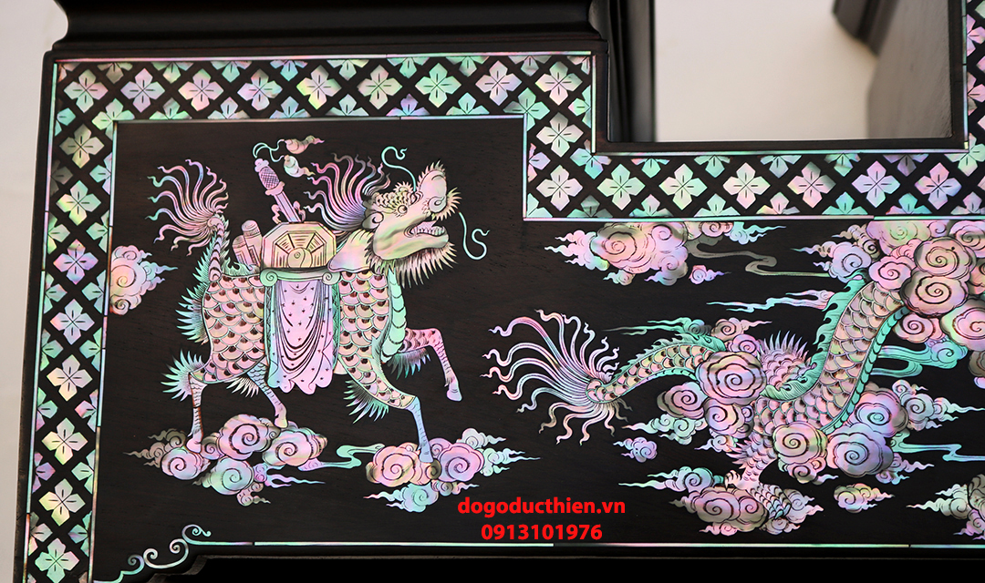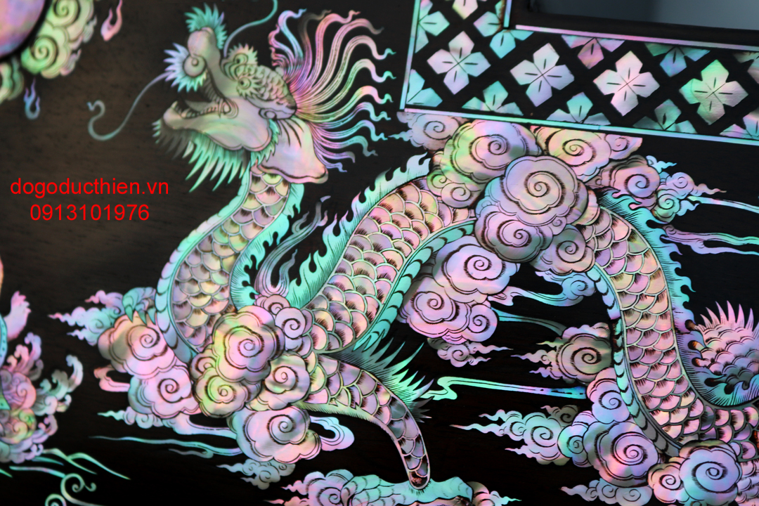 Chất Liệu: Gỗ Gụ, khảm ốc sà cừ đỏ lửa vàng chanh, hàng sen lọng kỹ.