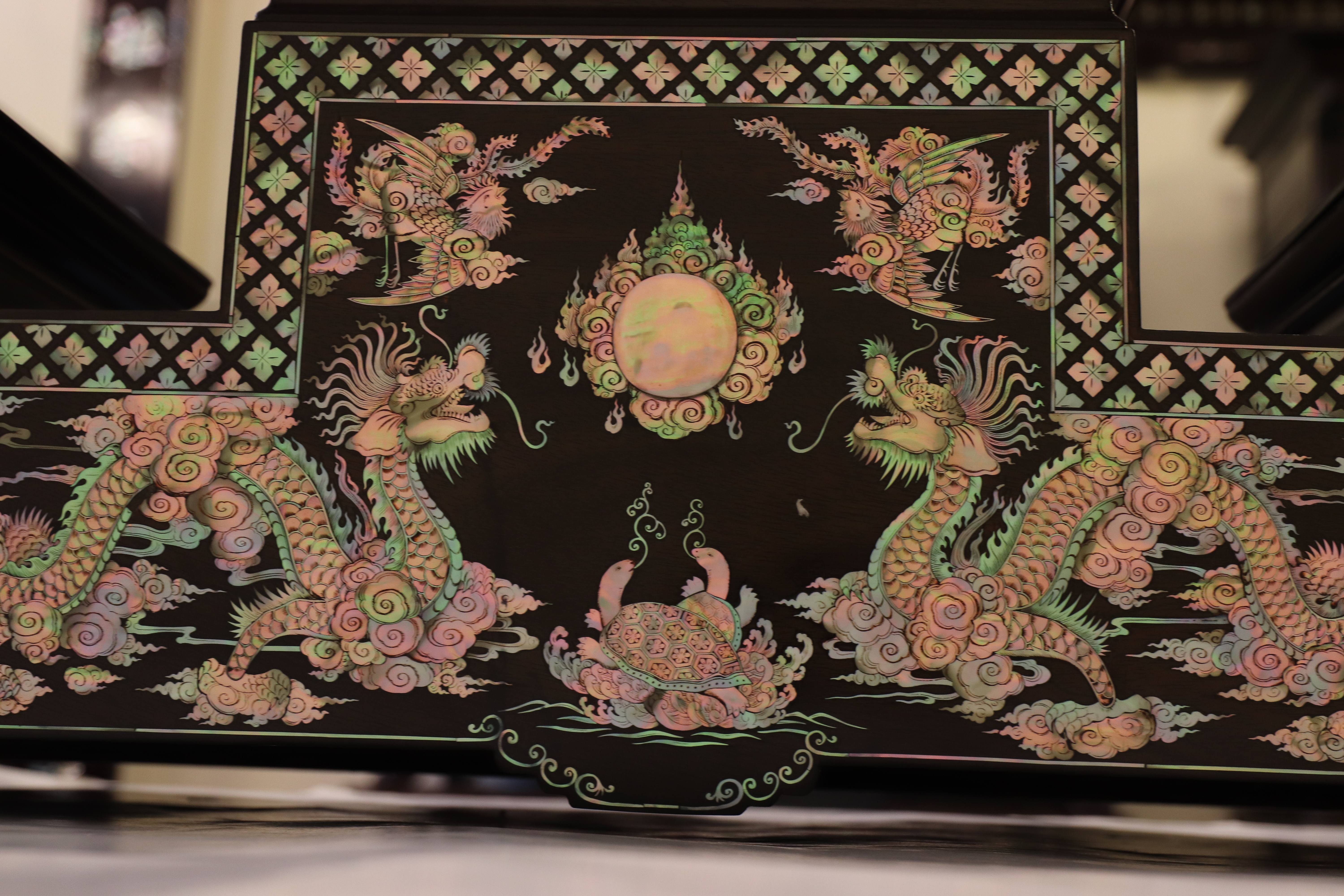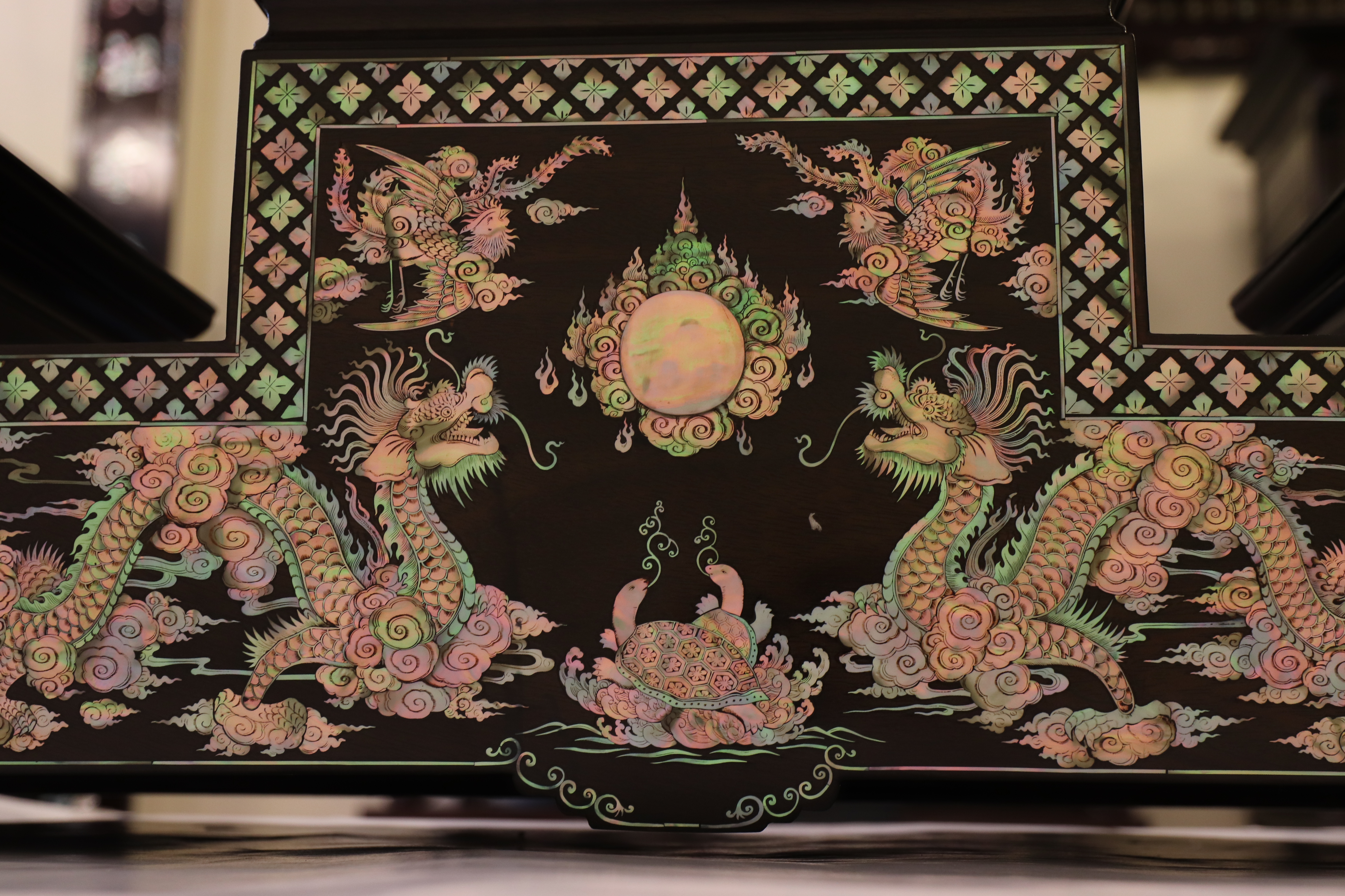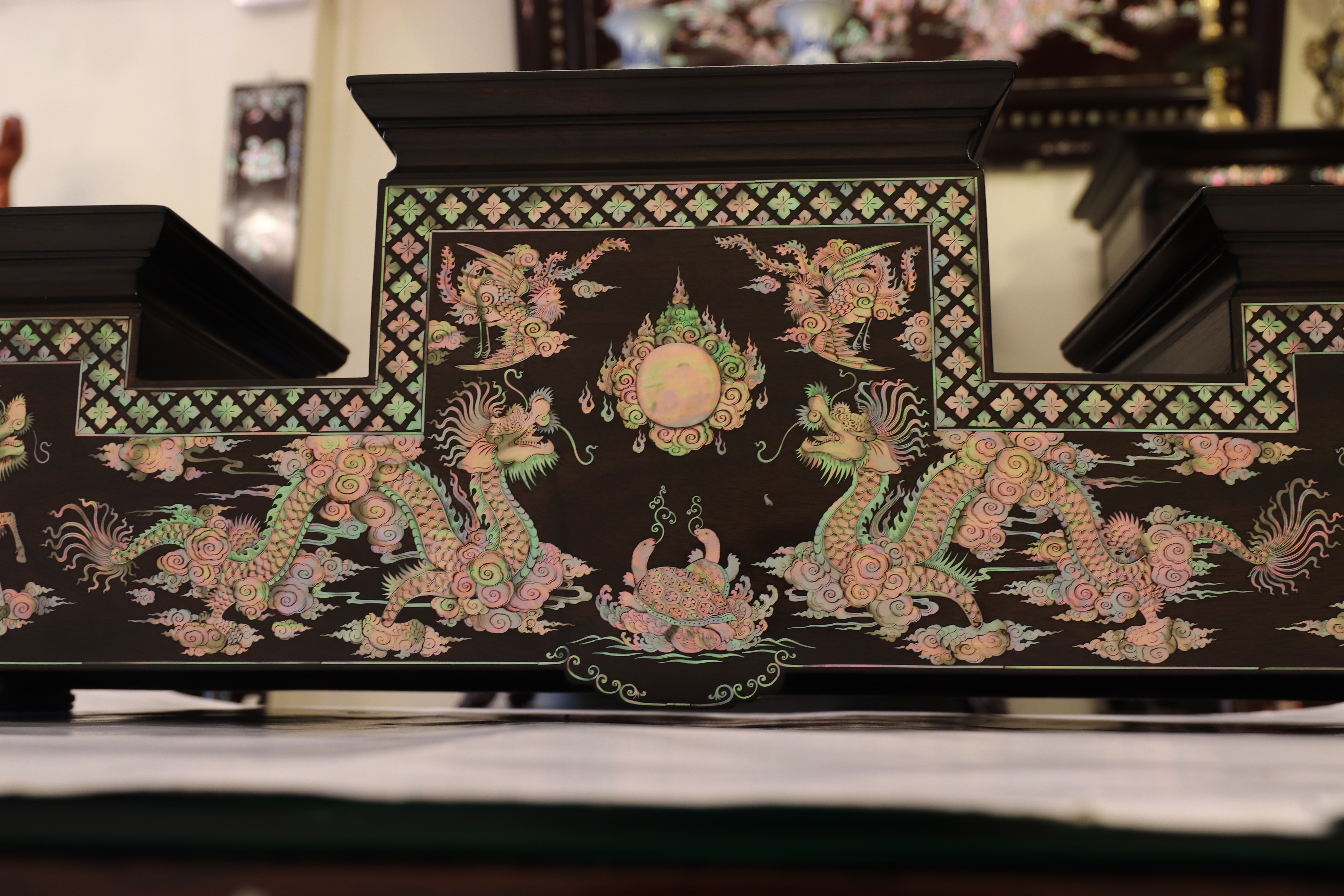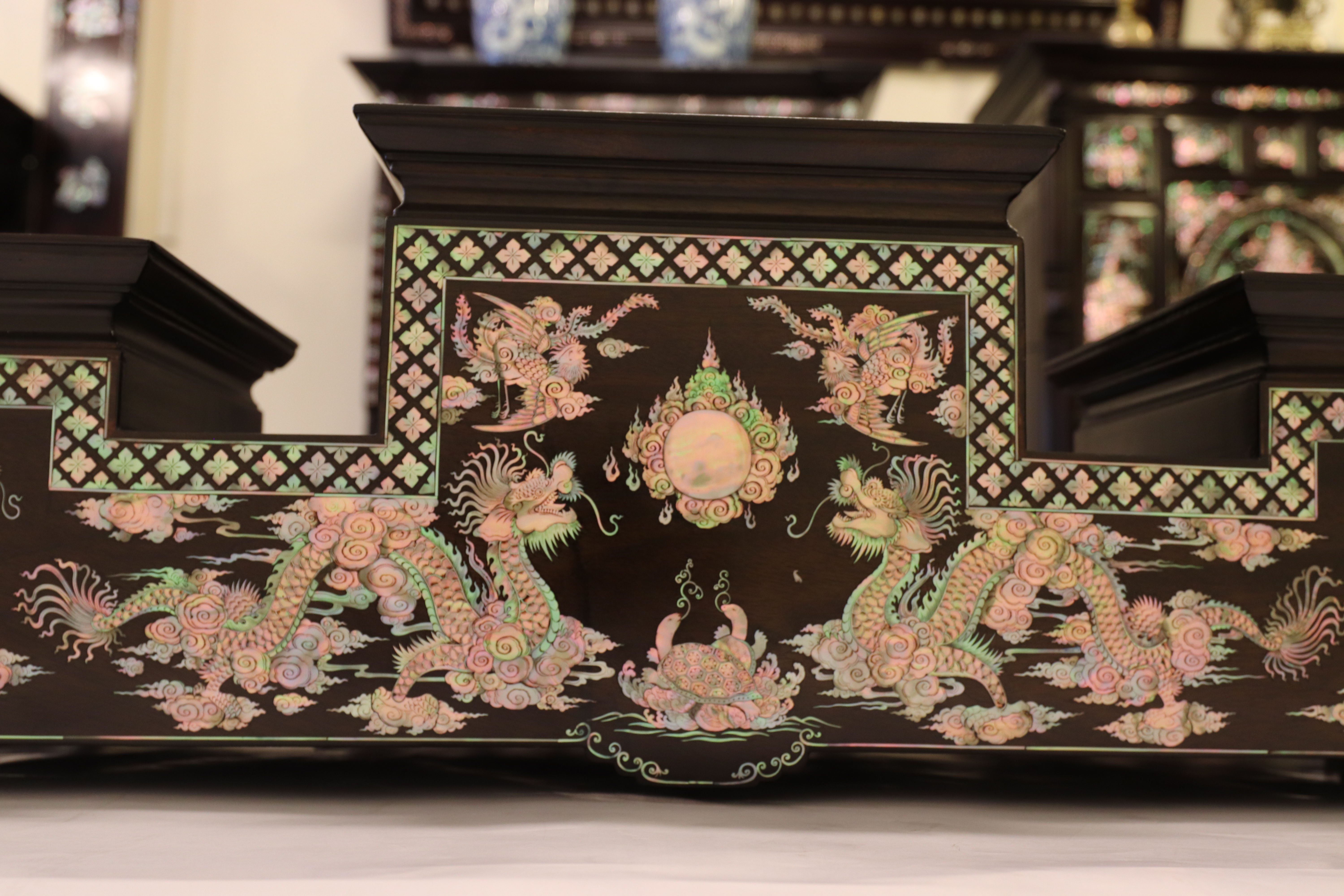 Chất Liệu: Gỗ Gụ, khảm ốc sà cừ đỏ lửa vàng chanh, hàng sen lọng kỹ.