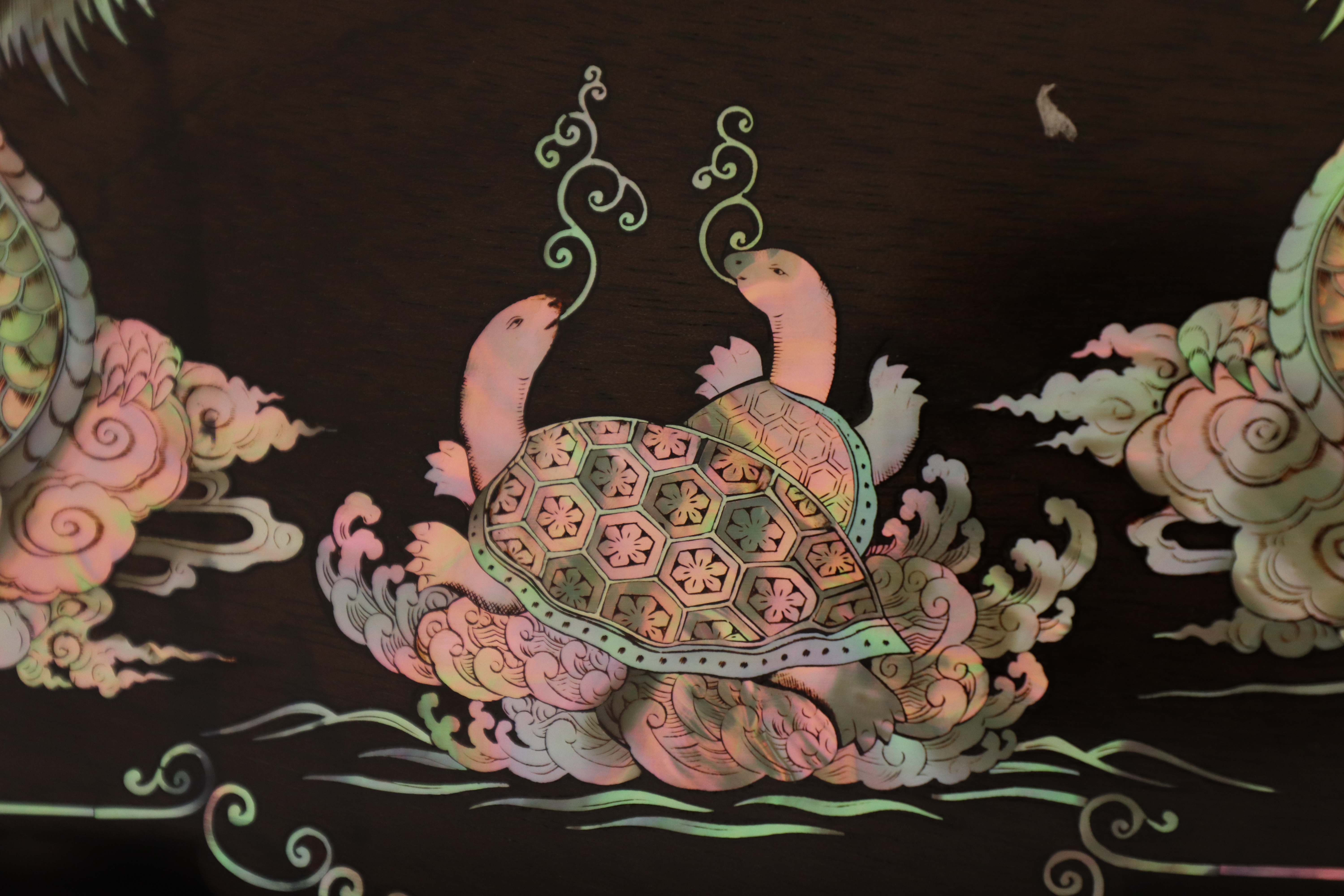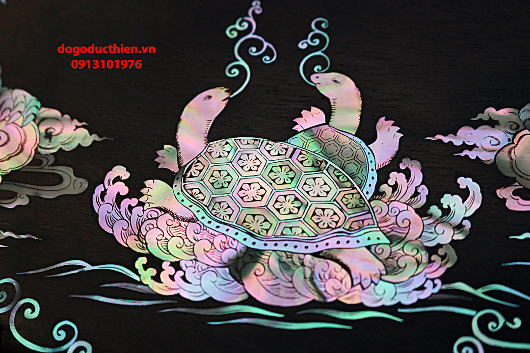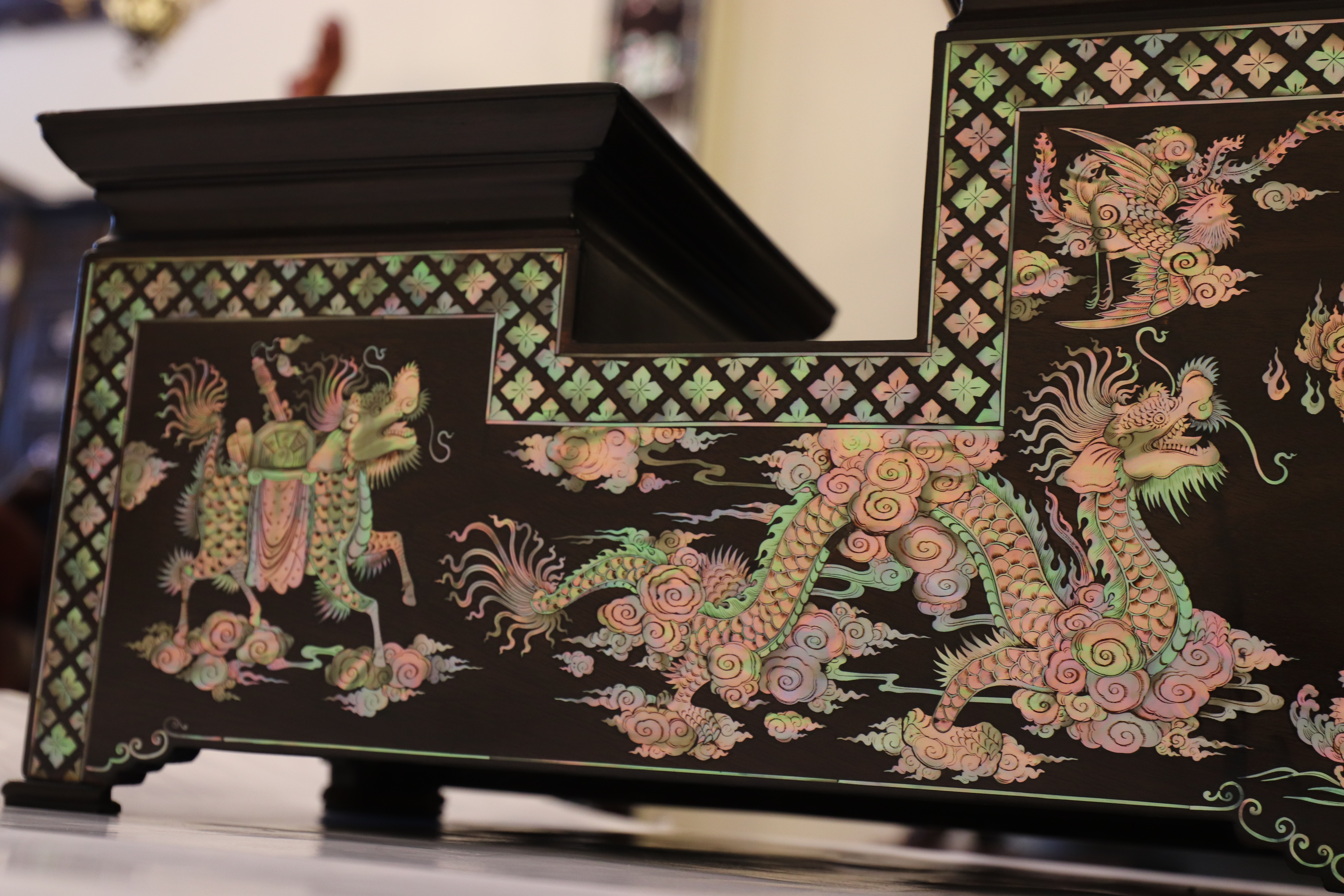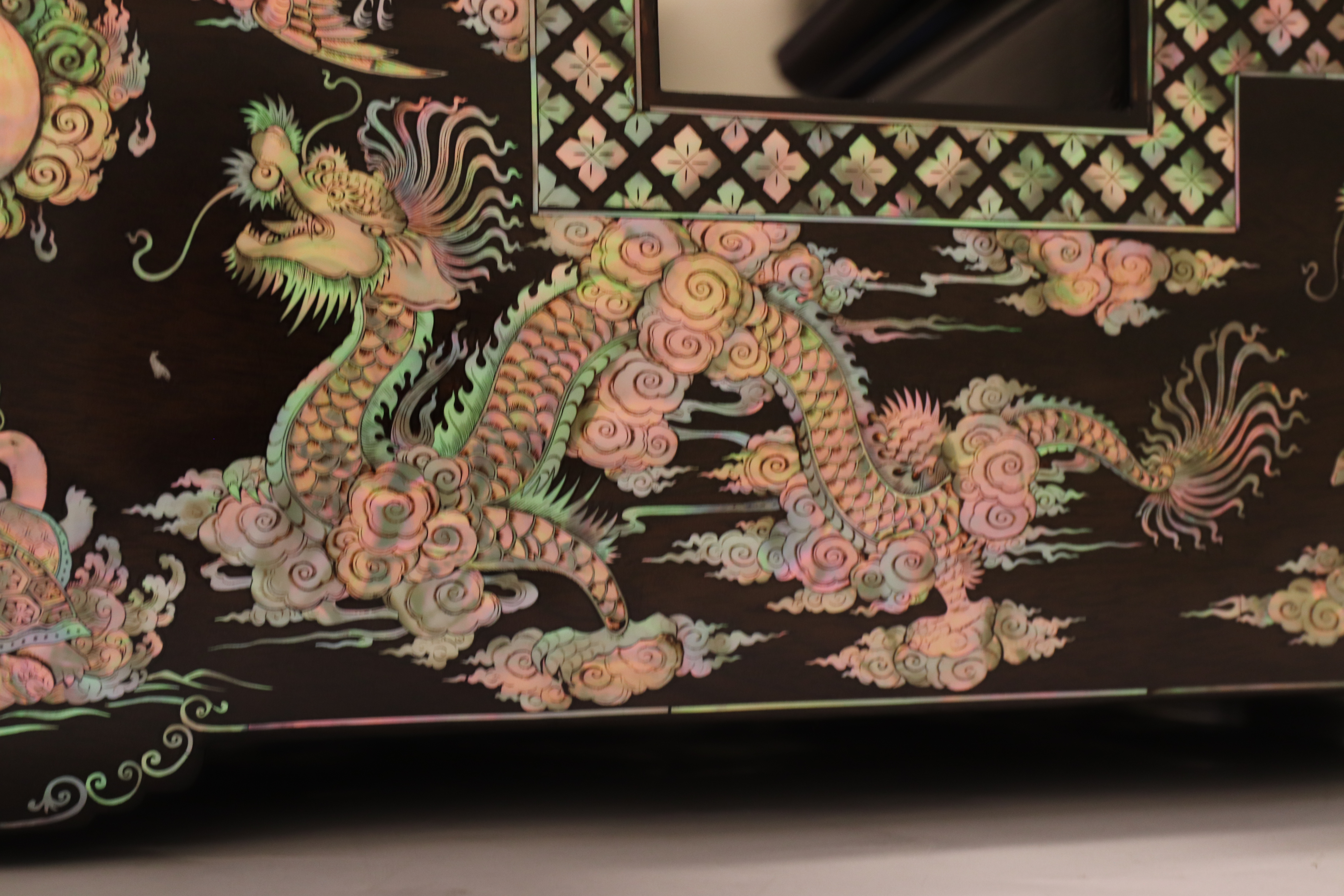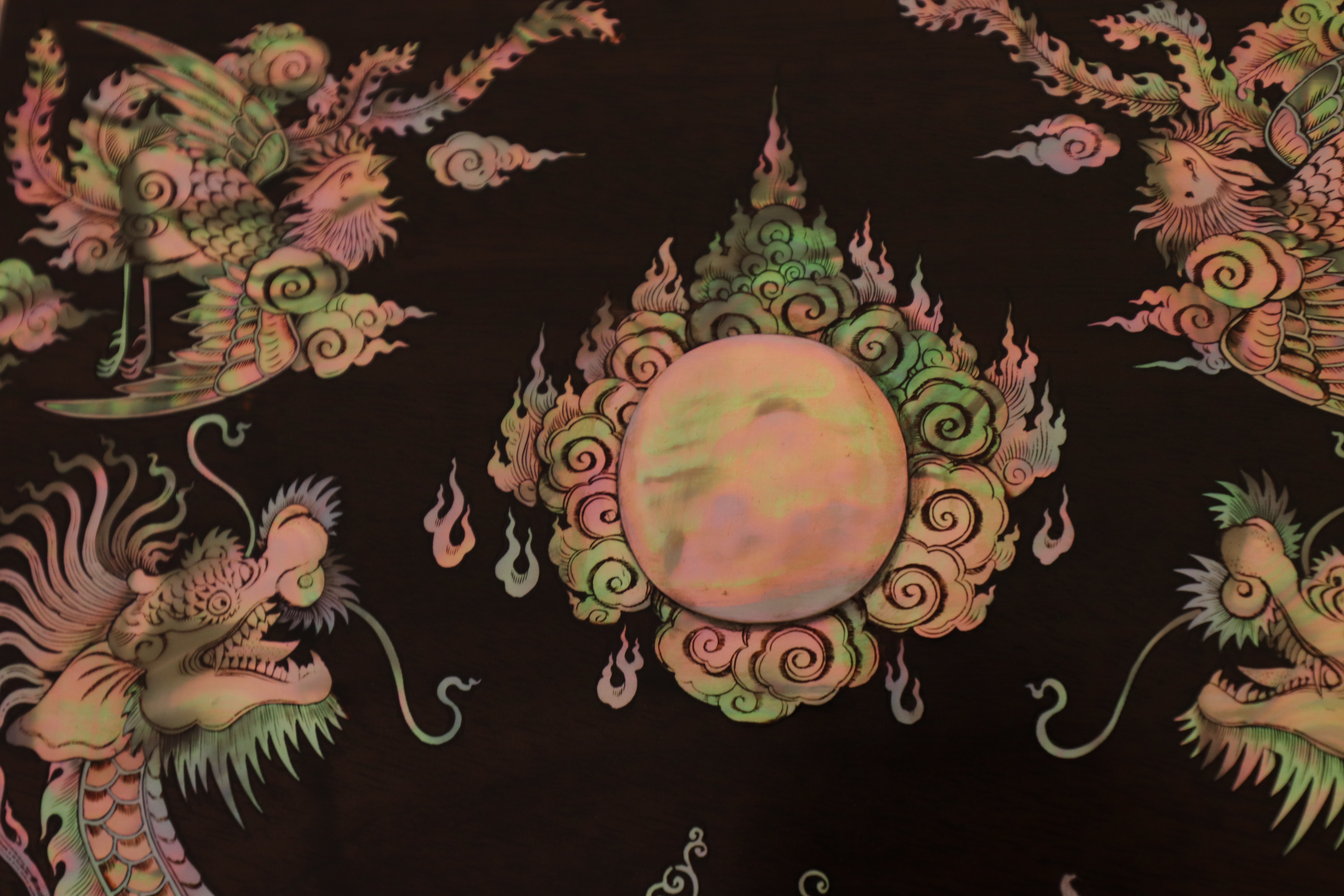 Chất Liệu: Gỗ Gụ, khảm ốc sà cừ đỏ lửa vàng chanh, hàng sen lọng kỹ.