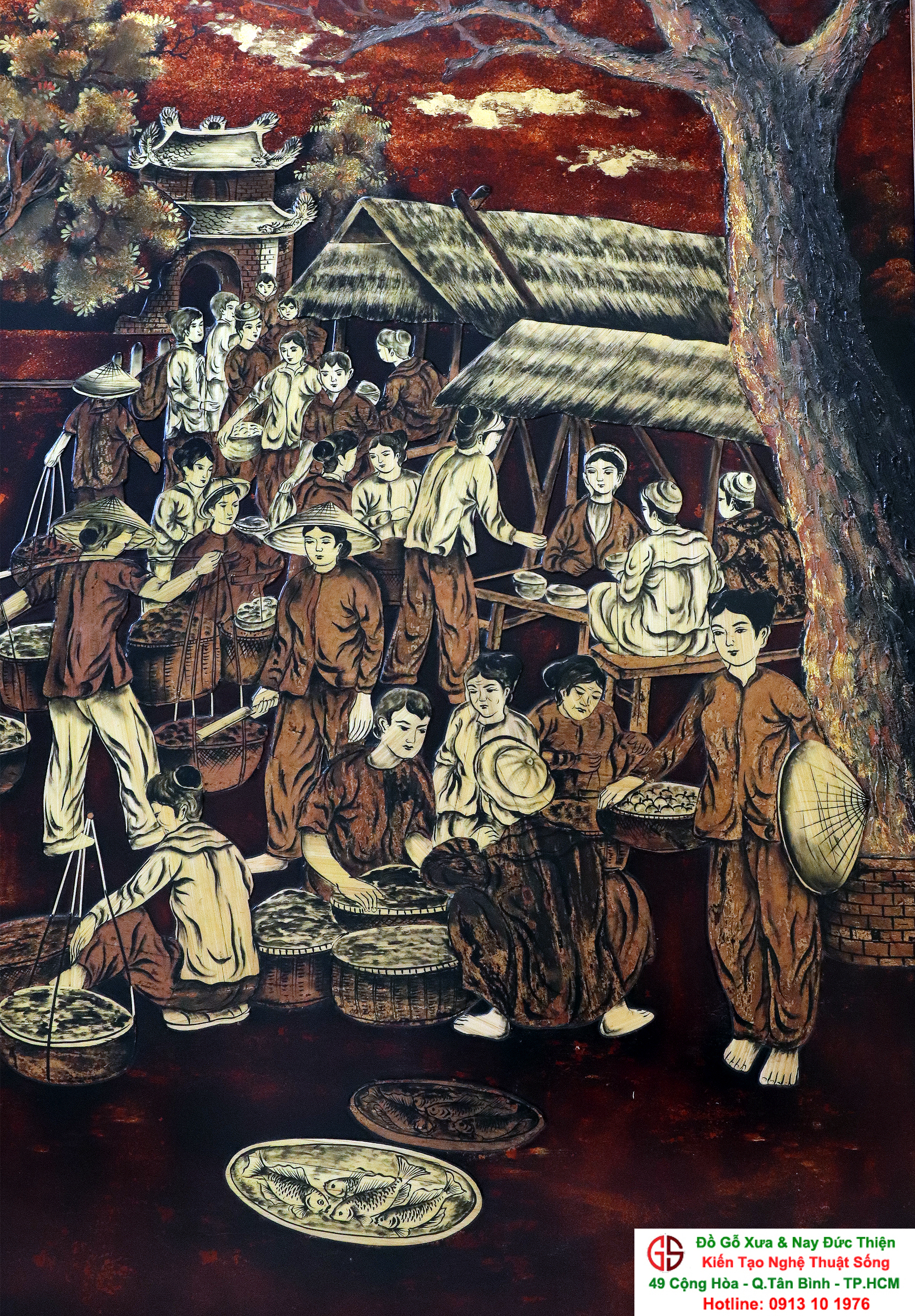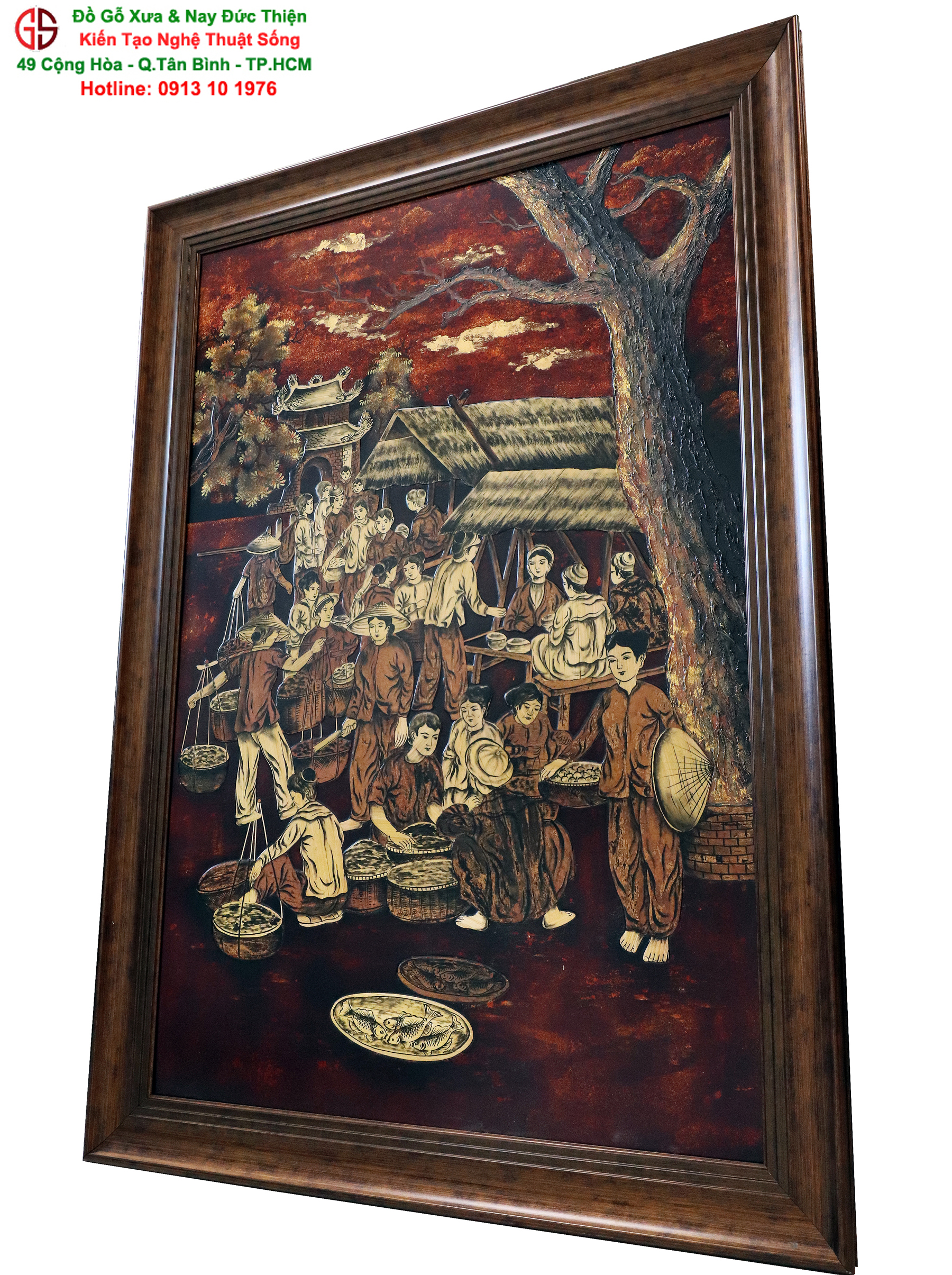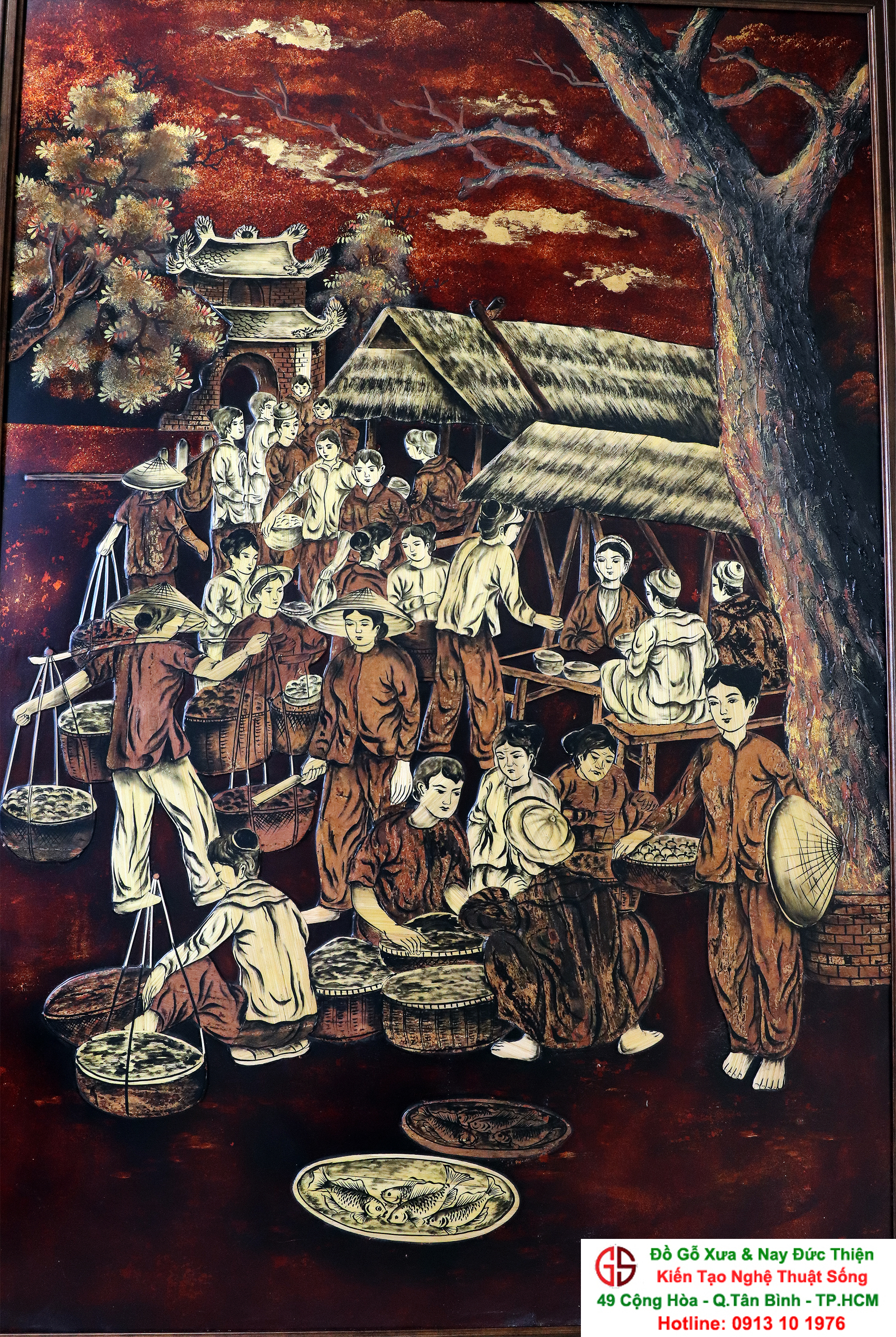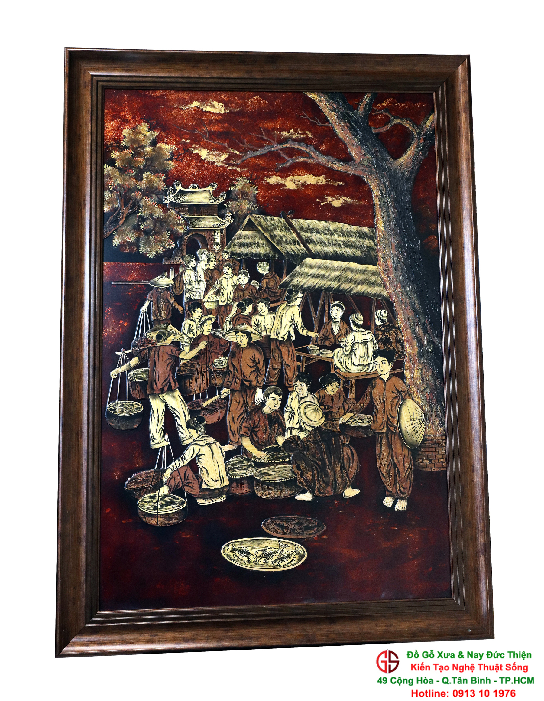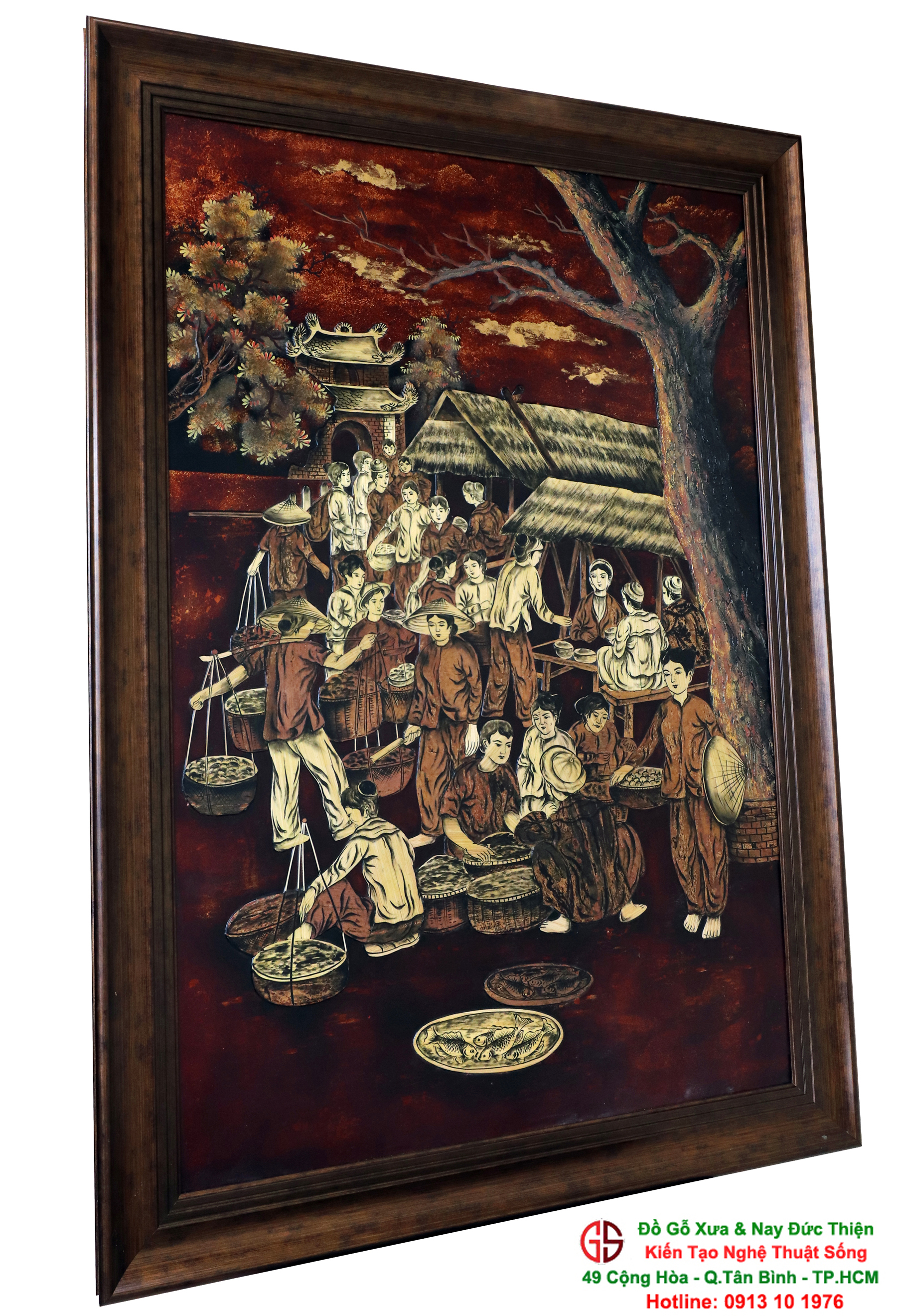 Tấm tranh đề tài chợ quê thiếp vàng, khảm gỗ