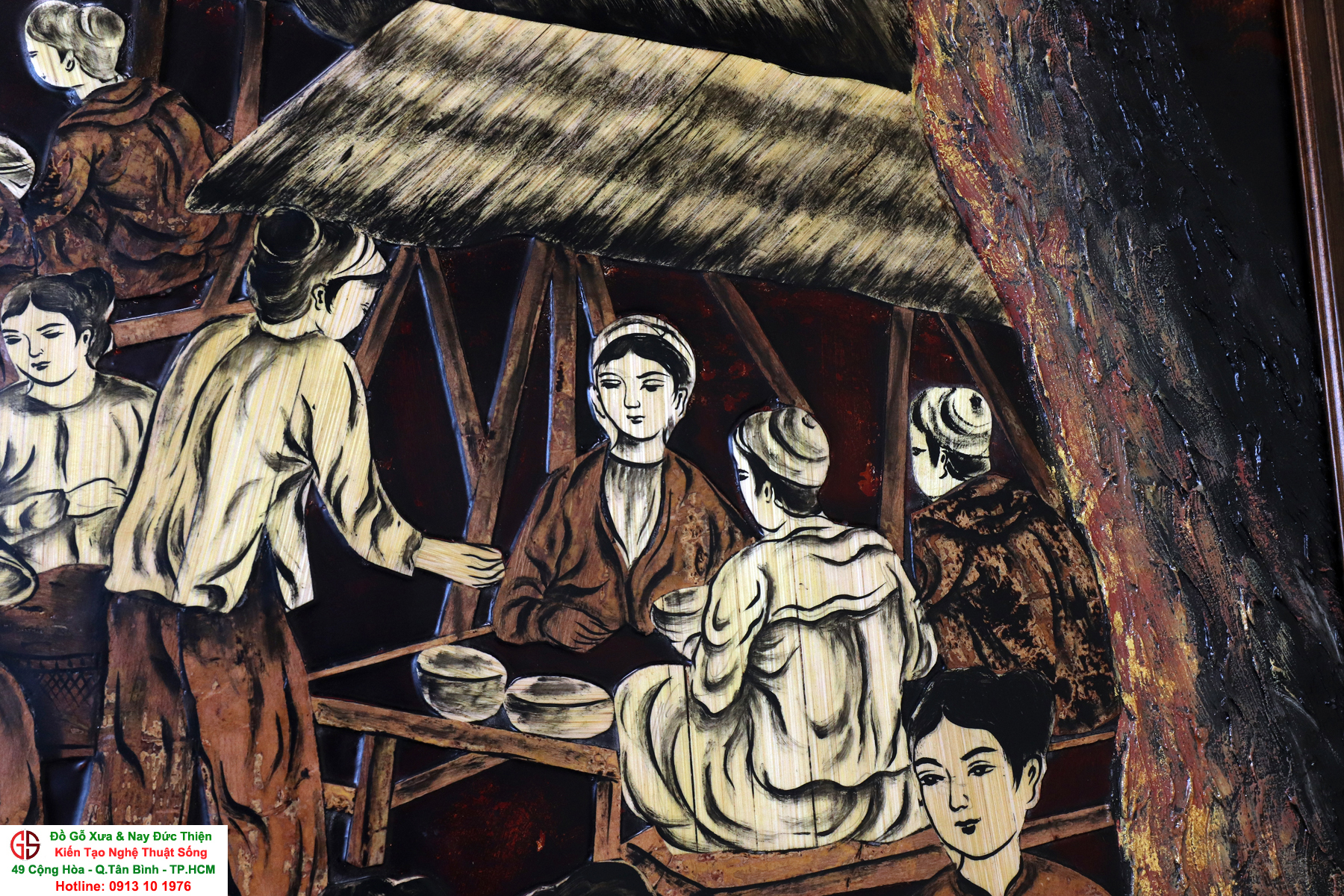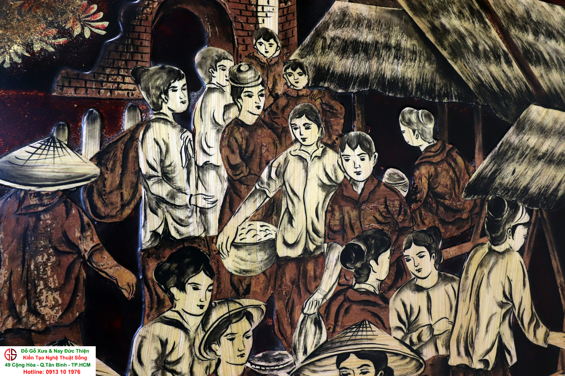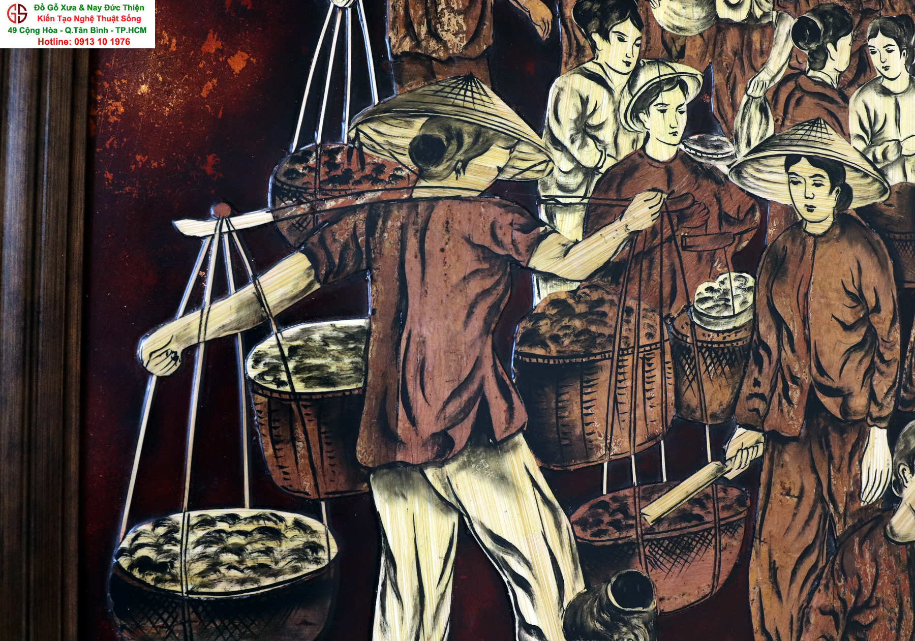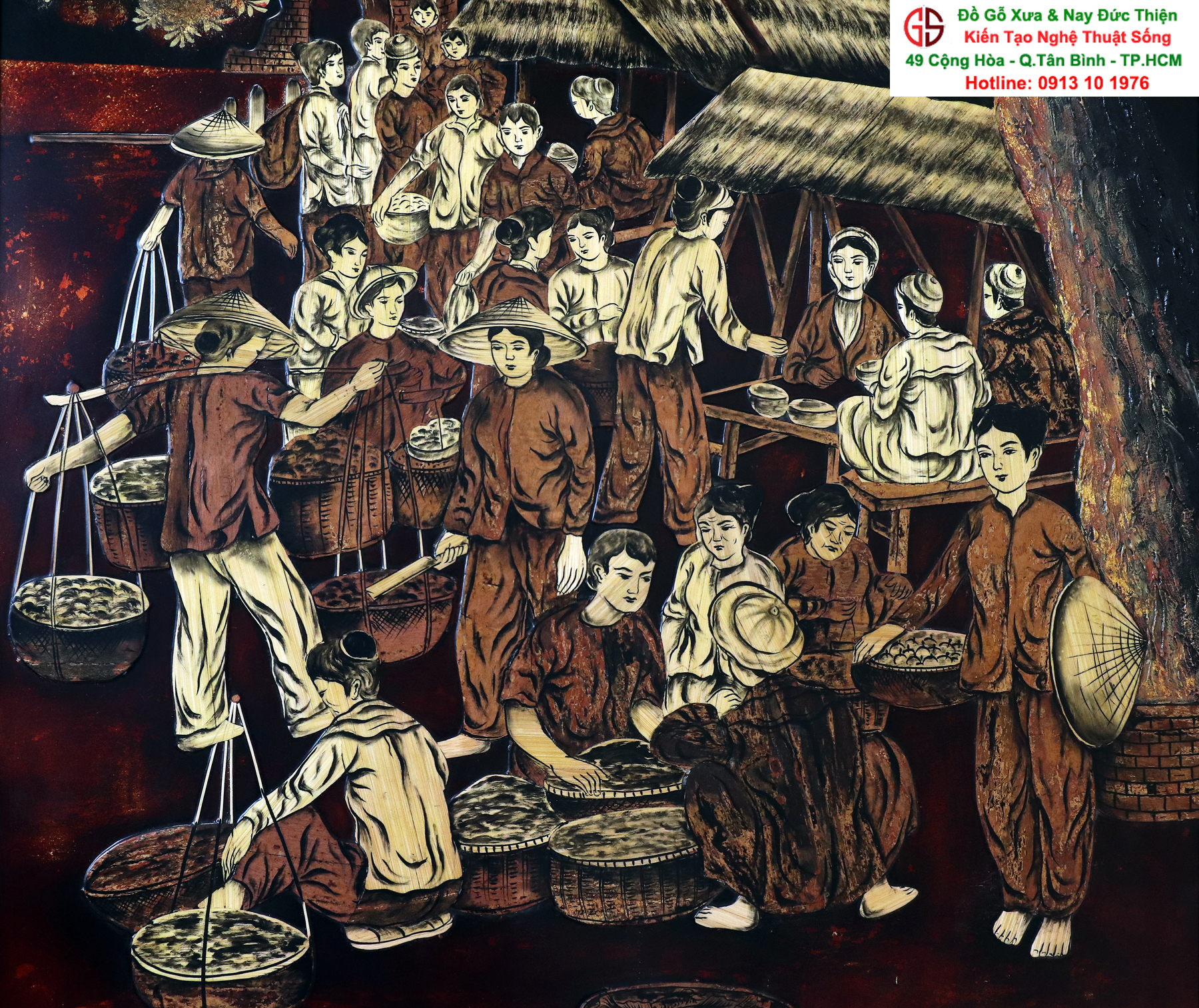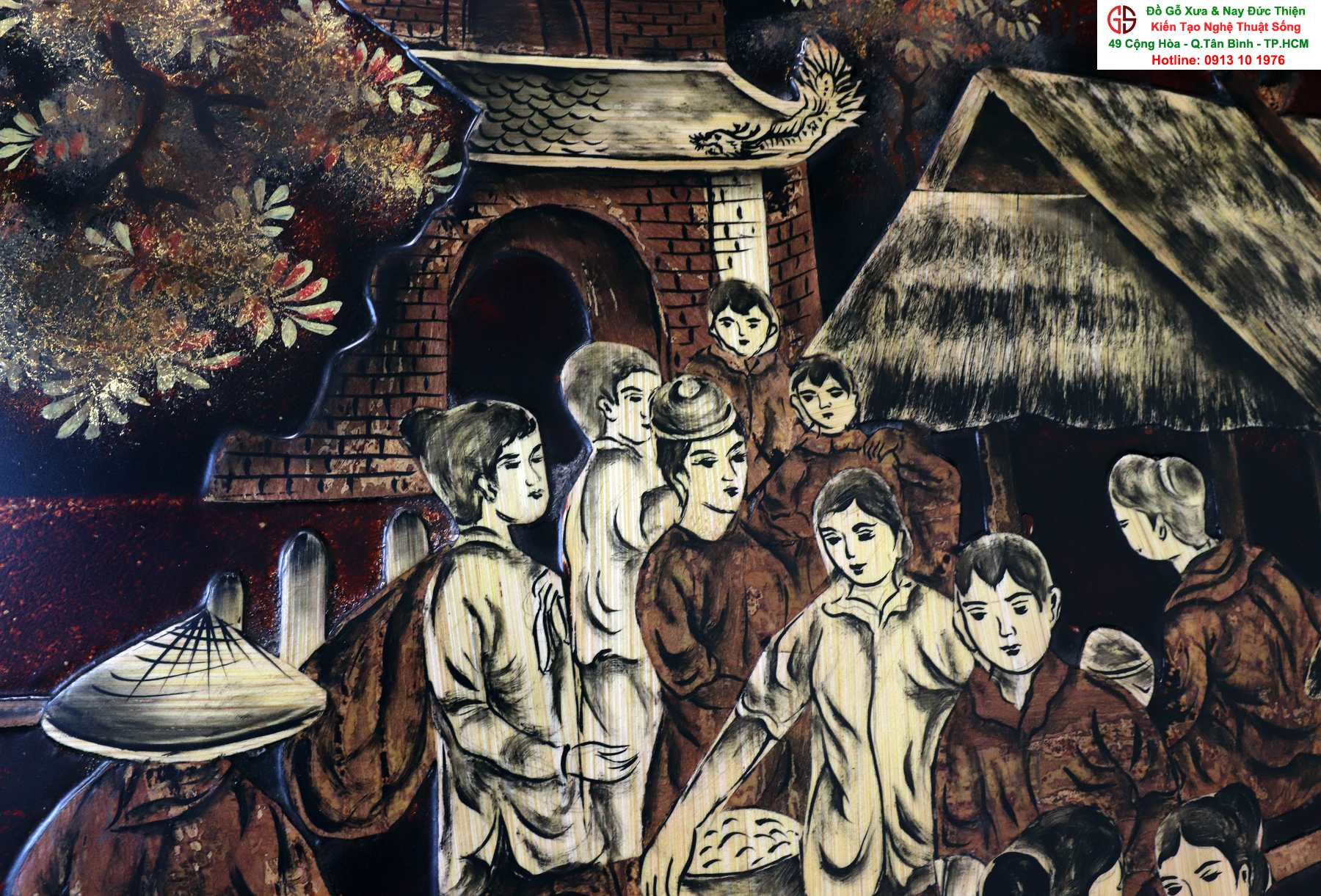 Tấm tranh sơn mài xưa thiếp vàng xưa tái hiện lại cảnh chợ quê ngày xưa gợi cho người xem một ký ức đẹp không thể quên, người họa sĩ tài ba đã rất khéo léo trong việc kết hợp các chất liệu với nhau tạo nên một bức tranh sinh động và có hồn