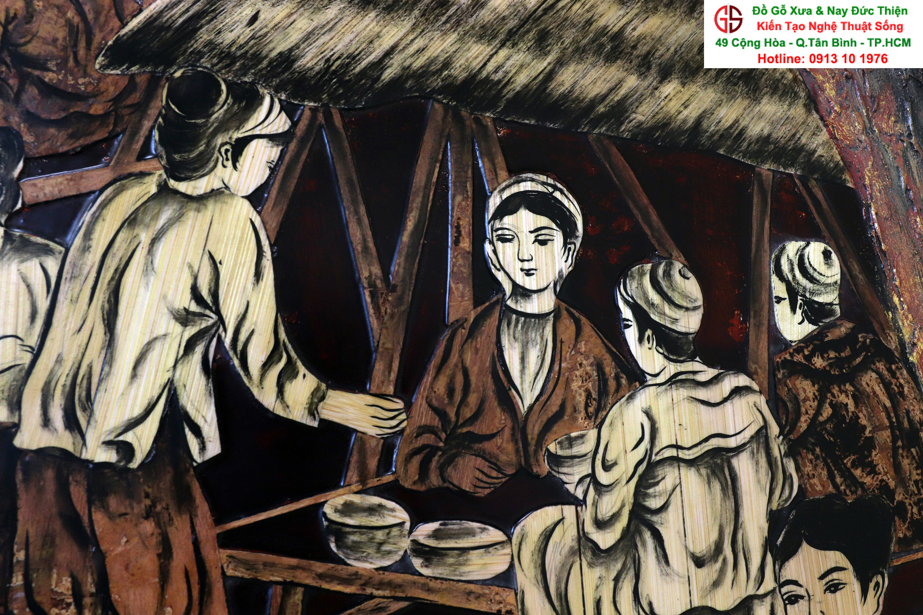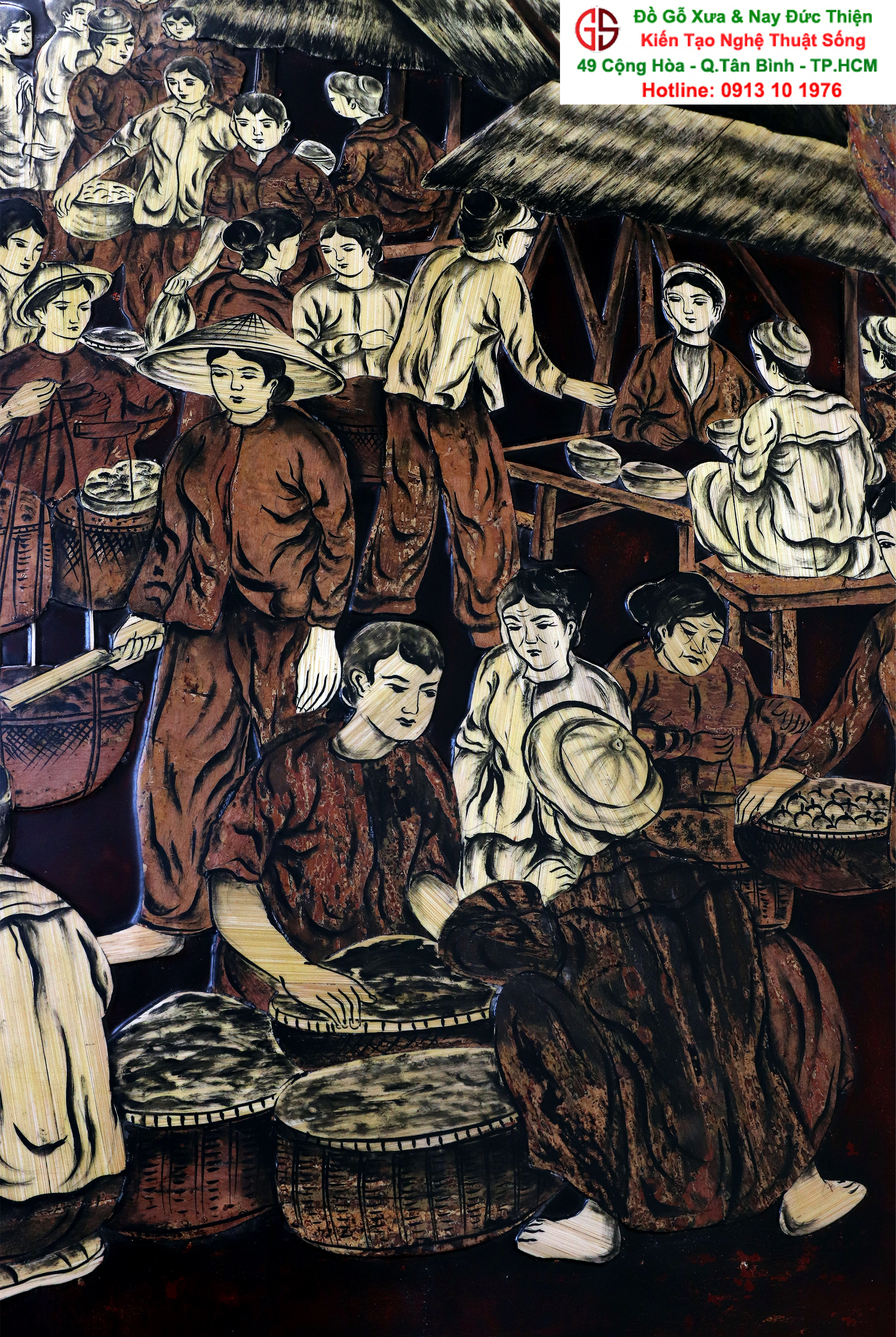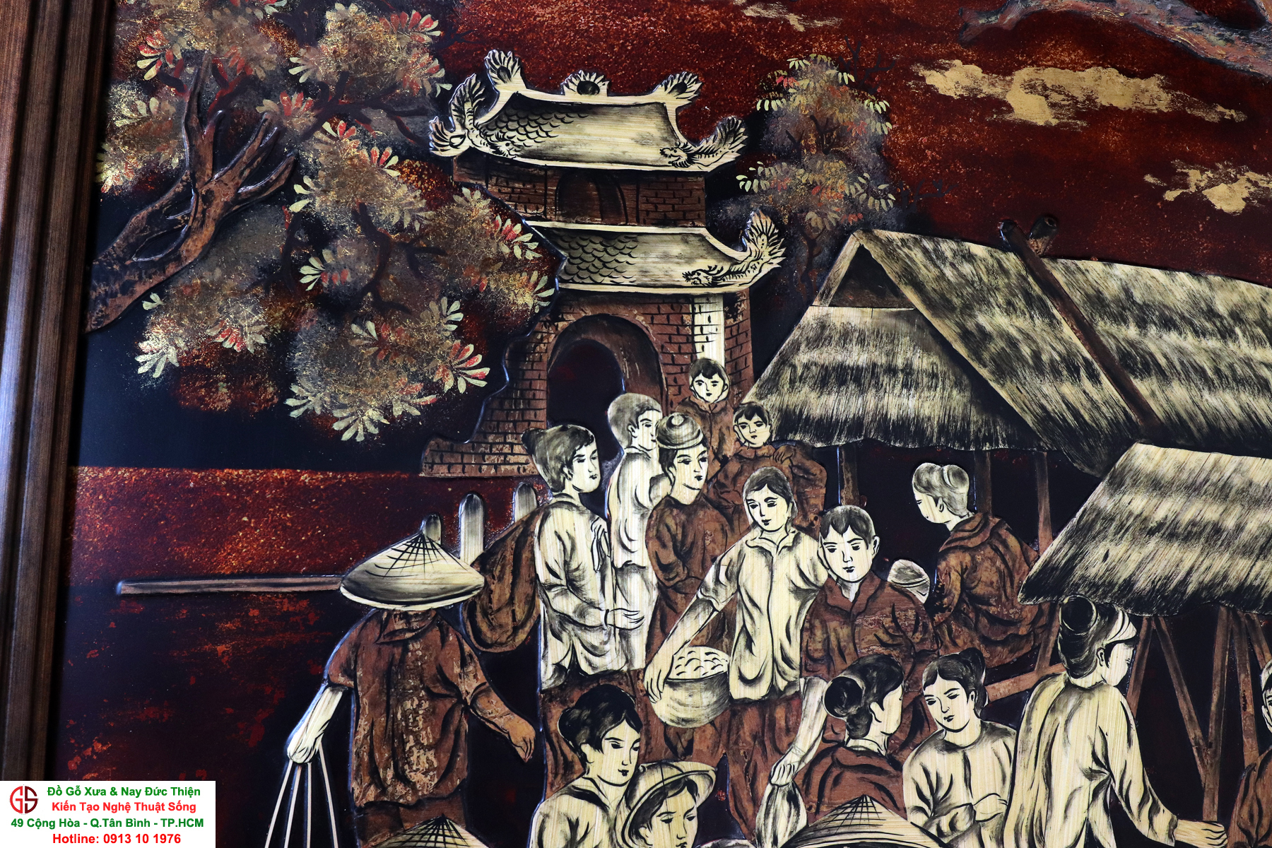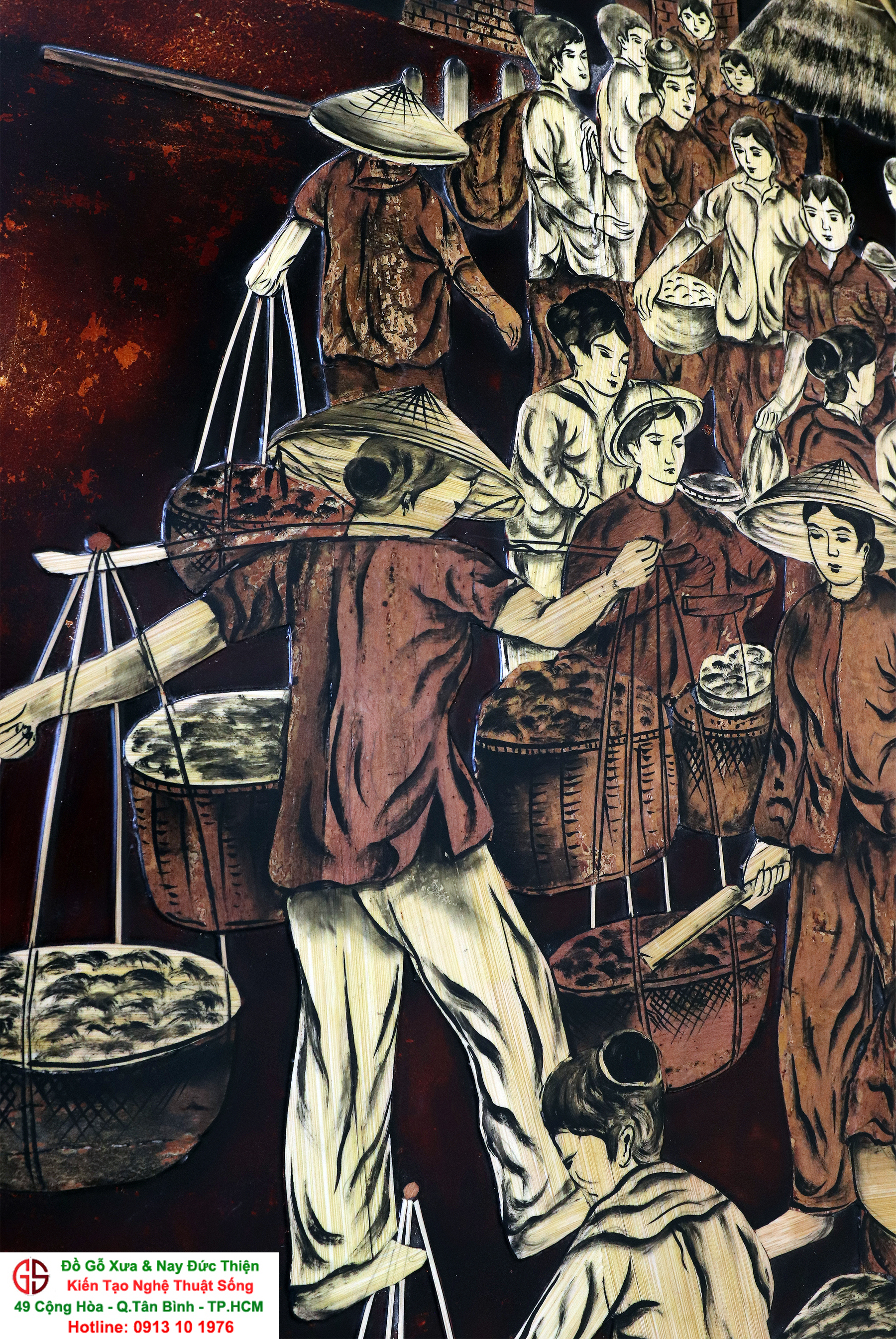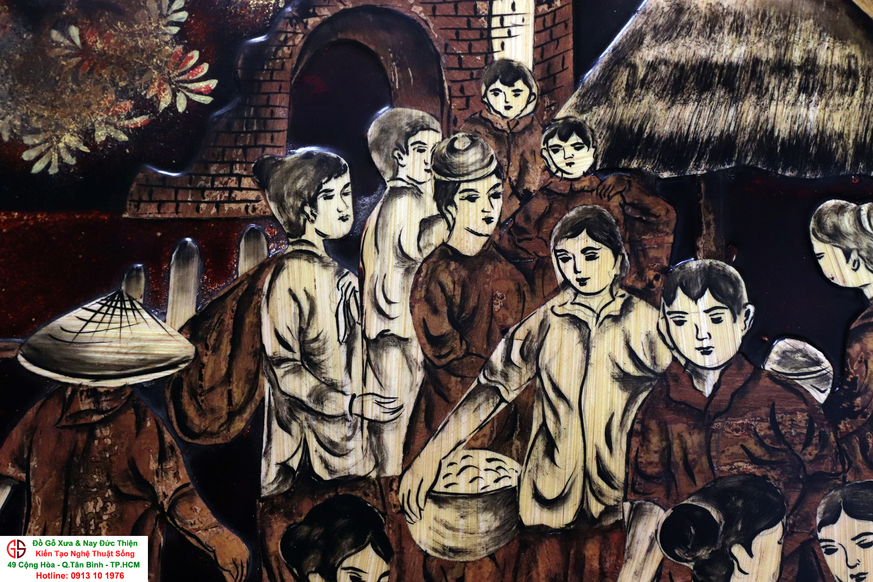 Tấm tranh sơn mài xưa thiếp vàng xưa tái hiện lại cảnh chợ quê ngày xưa gợi cho người xem một ký ức đẹp không thể quên, người họa sĩ tài ba đã rất khéo léo trong việc kết hợp các chất liệu với nhau tạo nên một bức tranh sinh động và có hồn