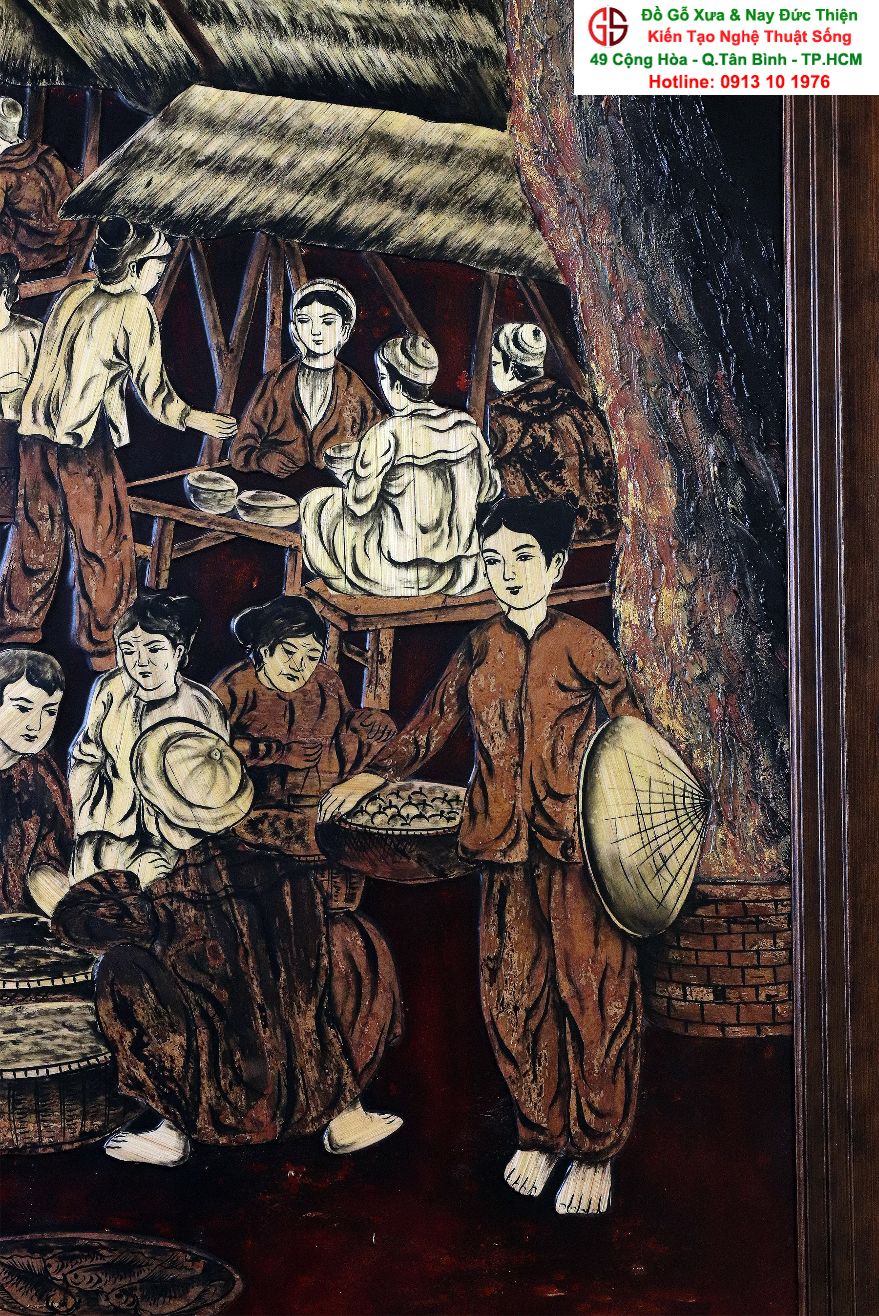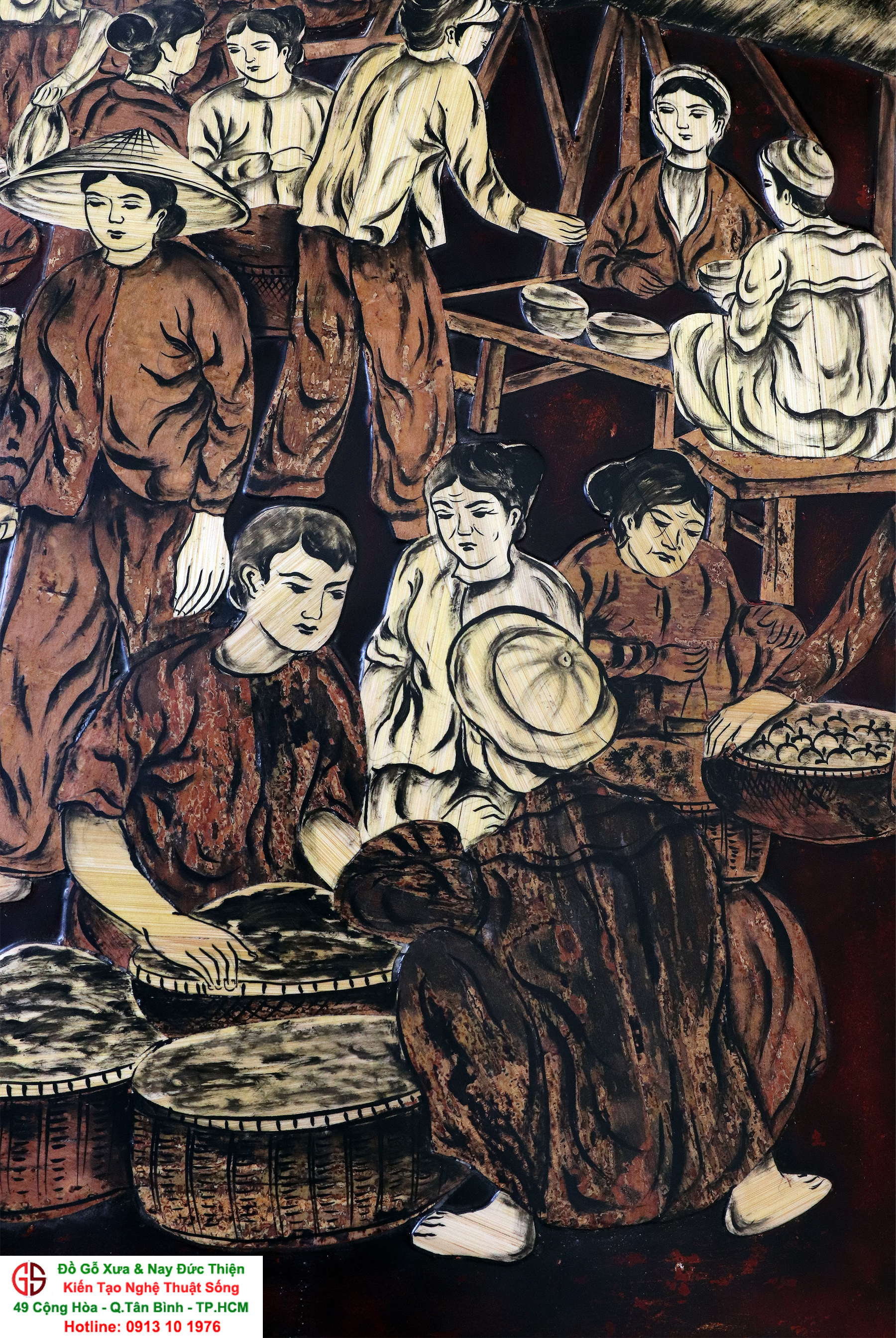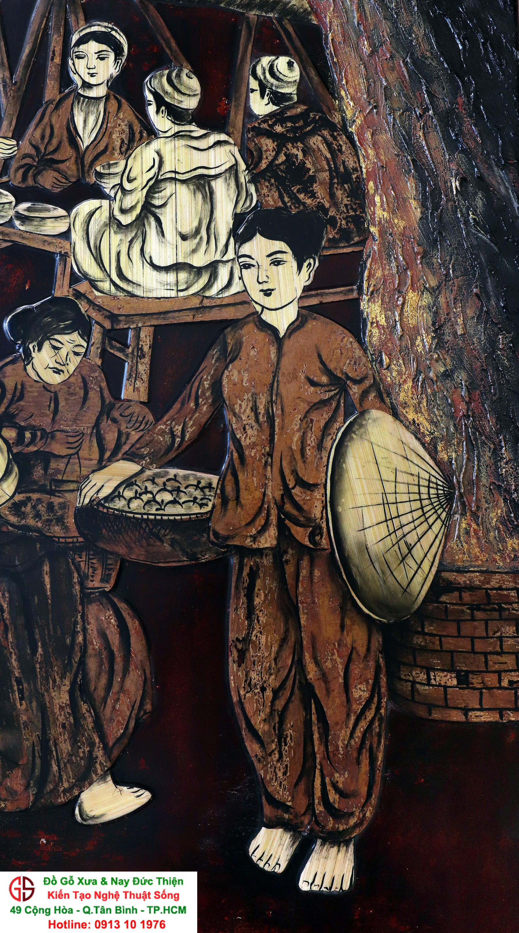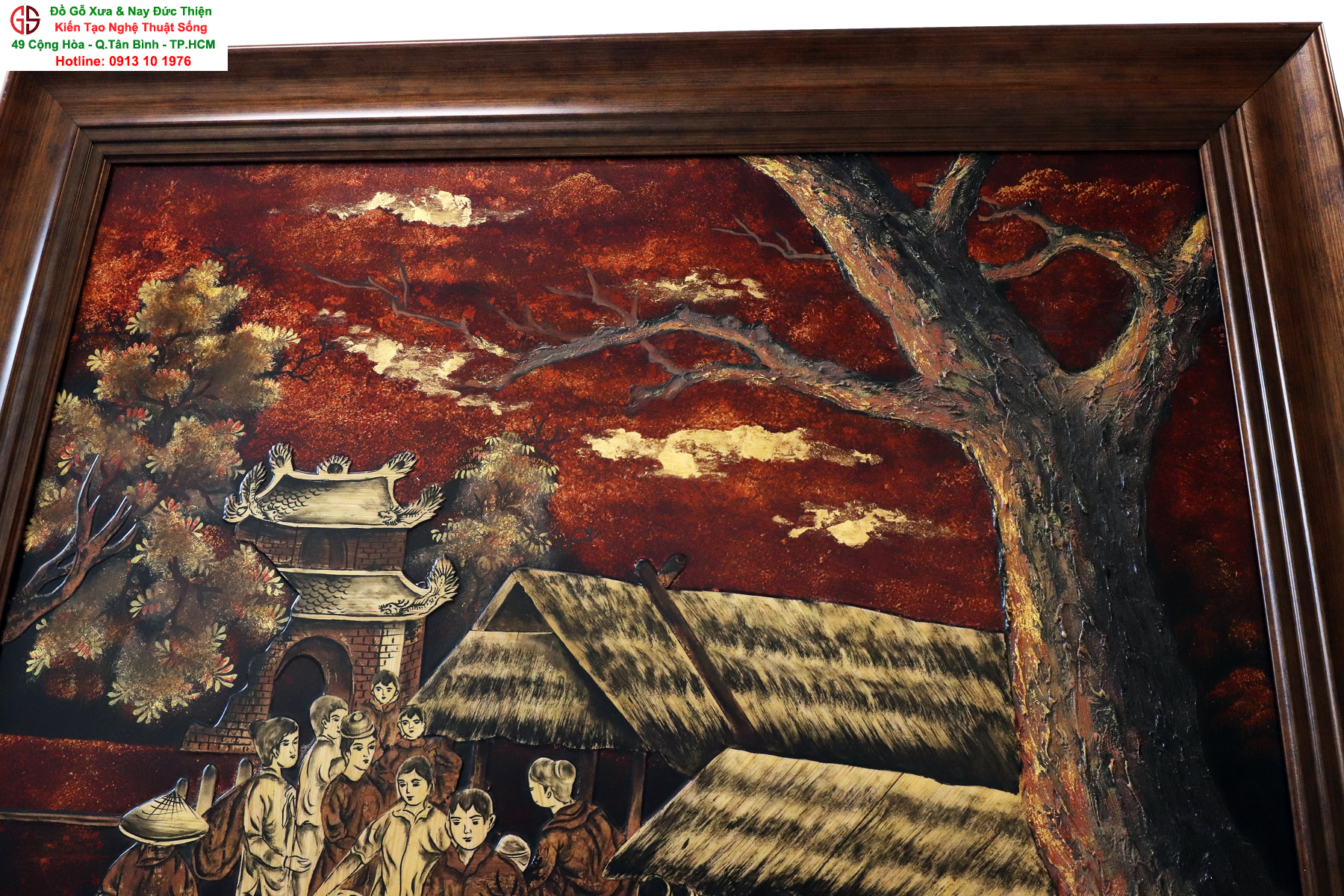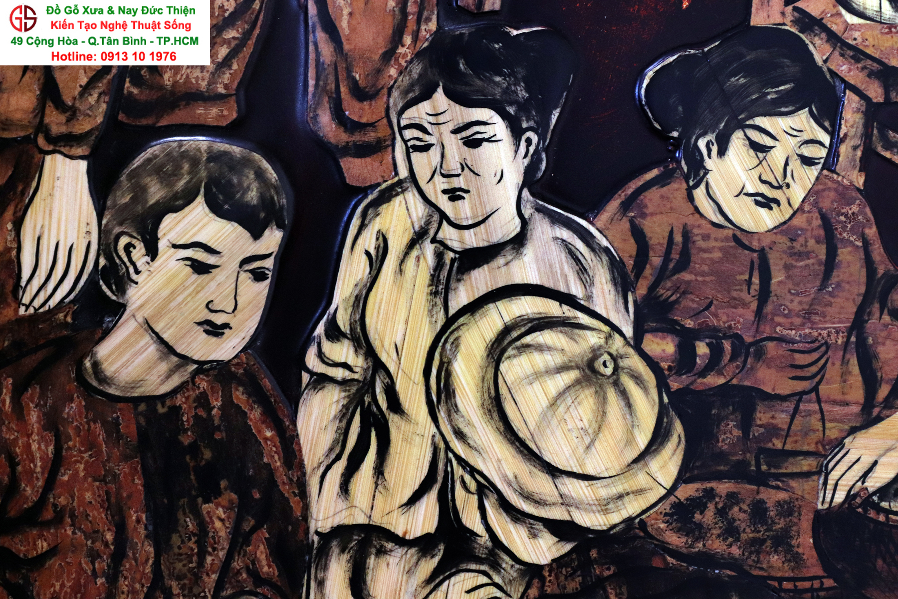 Tấm tranh sơn mài xưa thiếp vàng xưa tái hiện lại cảnh chợ quê ngày xưa gợi cho người xem một ký ức đẹp không thể quên, người họa sĩ tài ba đã rất khéo léo trong việc kết hợp các chất liệu với nhau tạo nên một bức tranh sinh động và có hồn