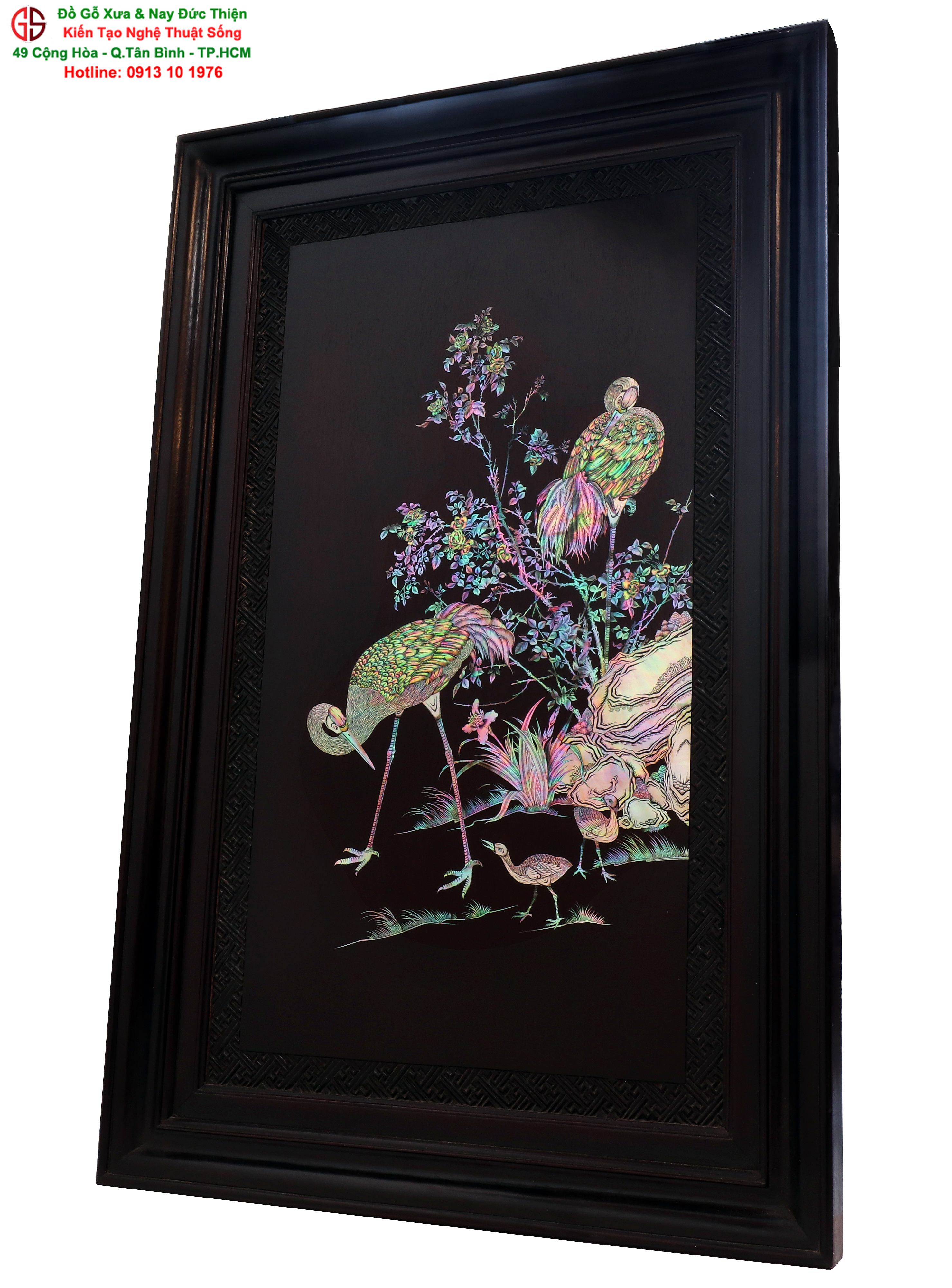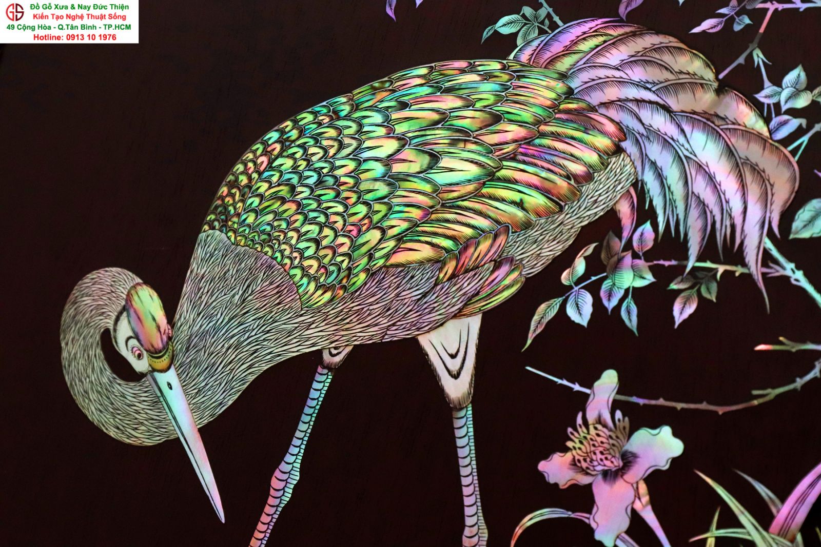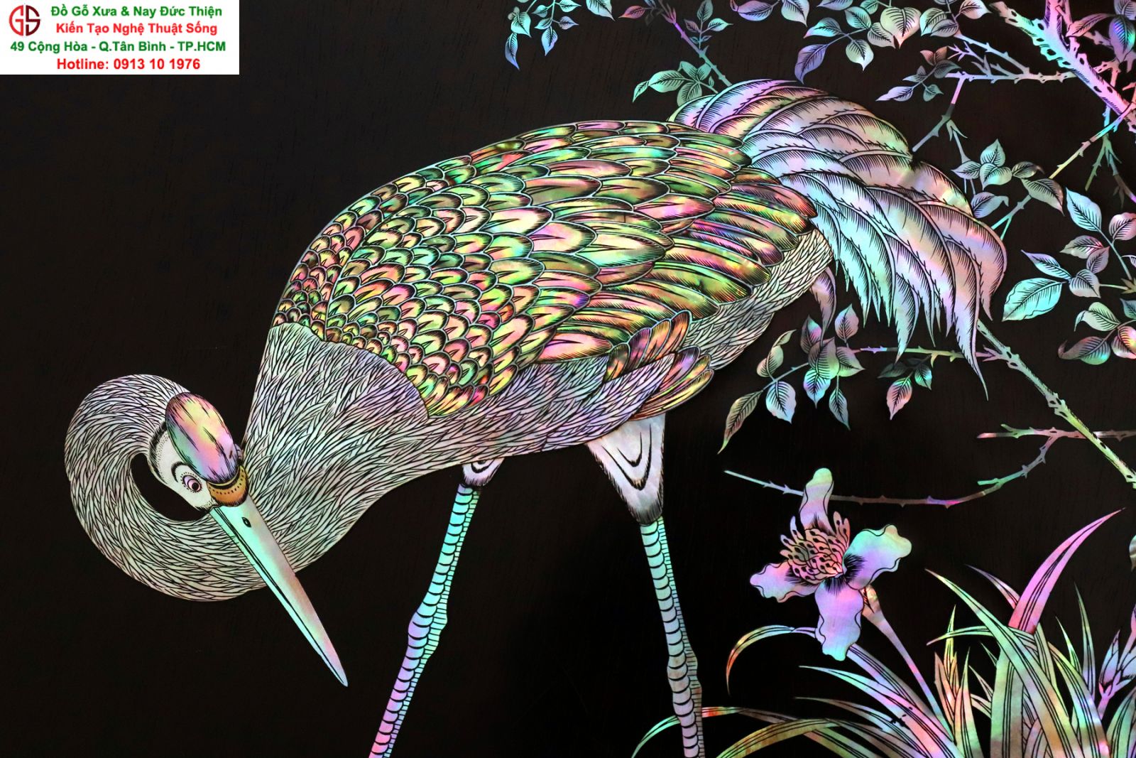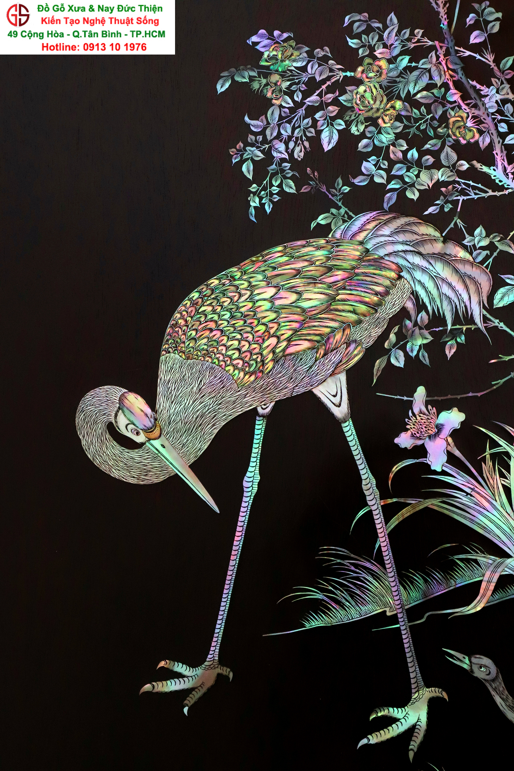 Tuyệt phẩm tranh gỗ khảm ốc, độc đáo, tinh tế và hiếm lạ, hoành hạc thanh cao là bức tranh đẹp thích hợp trang trí phòng khách, phòng làm việc, là quà biếu sang trọng