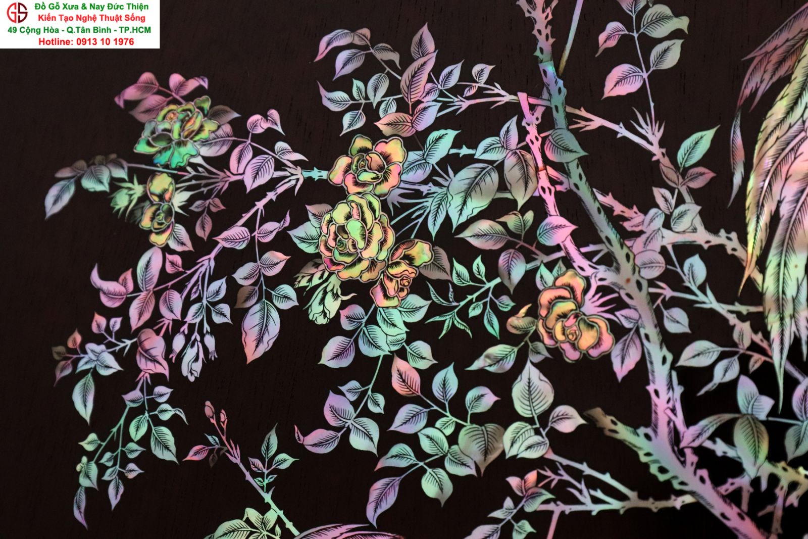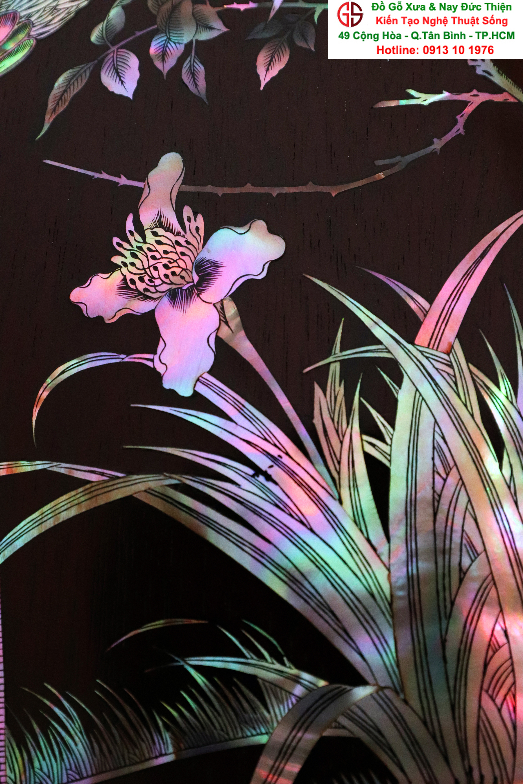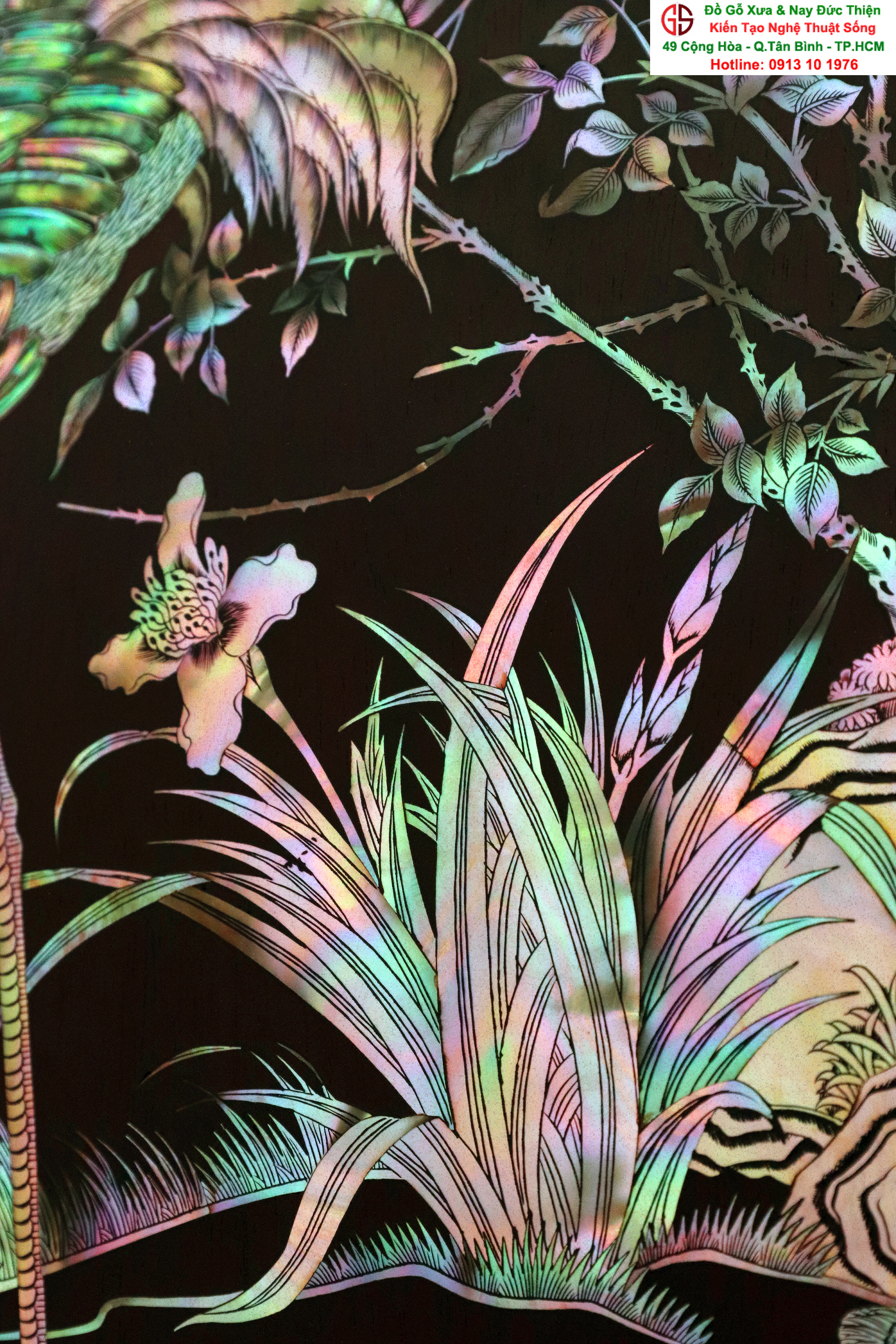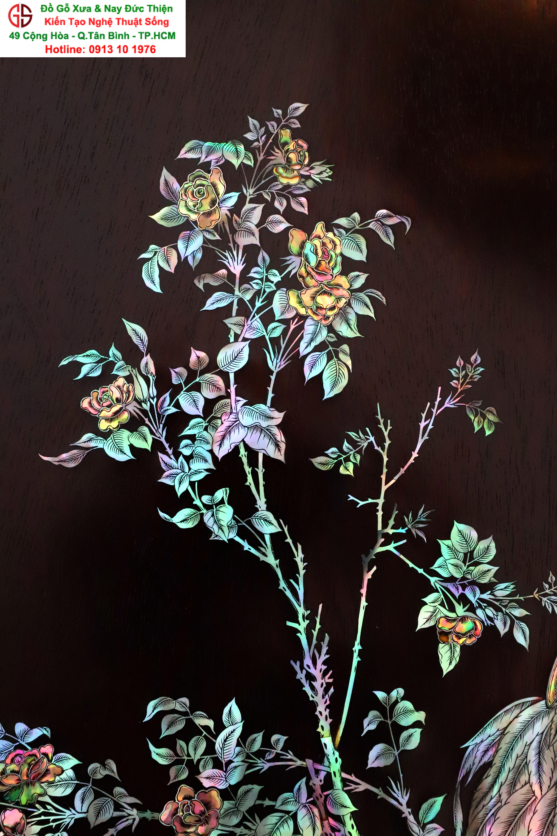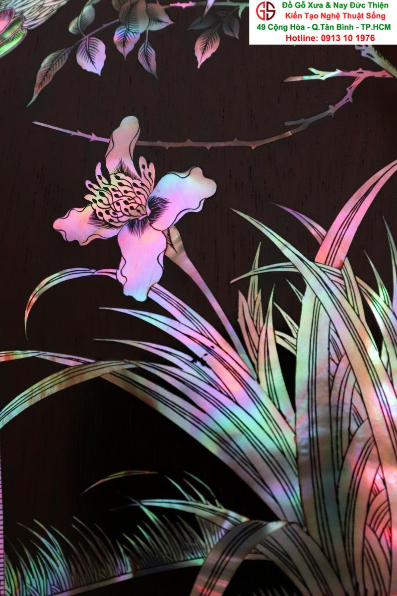 + Chất liệu: tấm tranh được cẩn ốc xà cừ đỏ lửa vàng chanh trên chất liệu gỗ gụ mật.