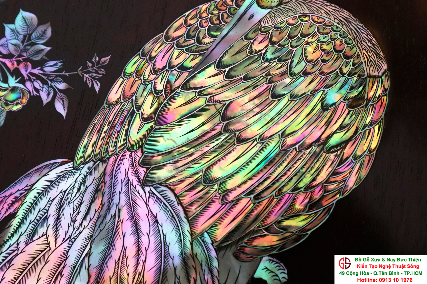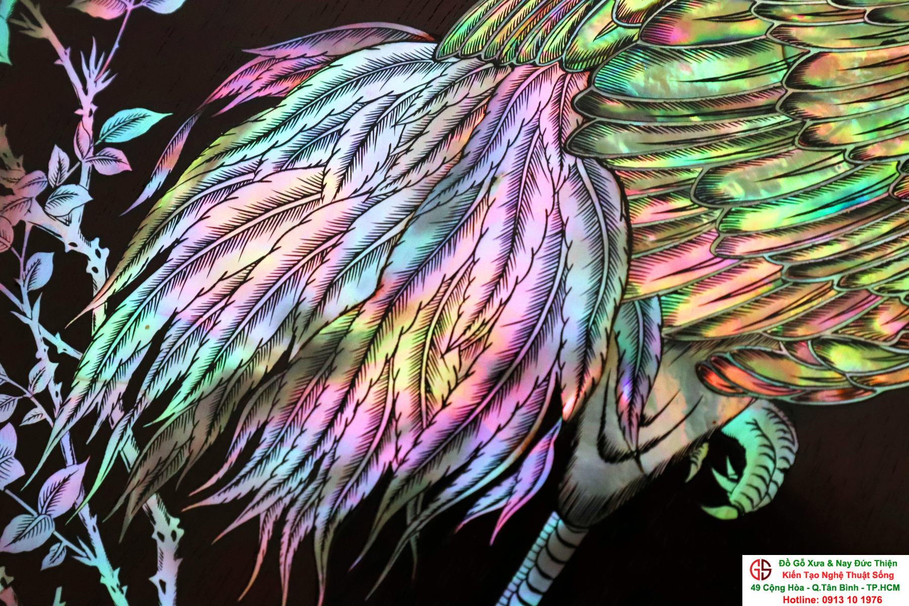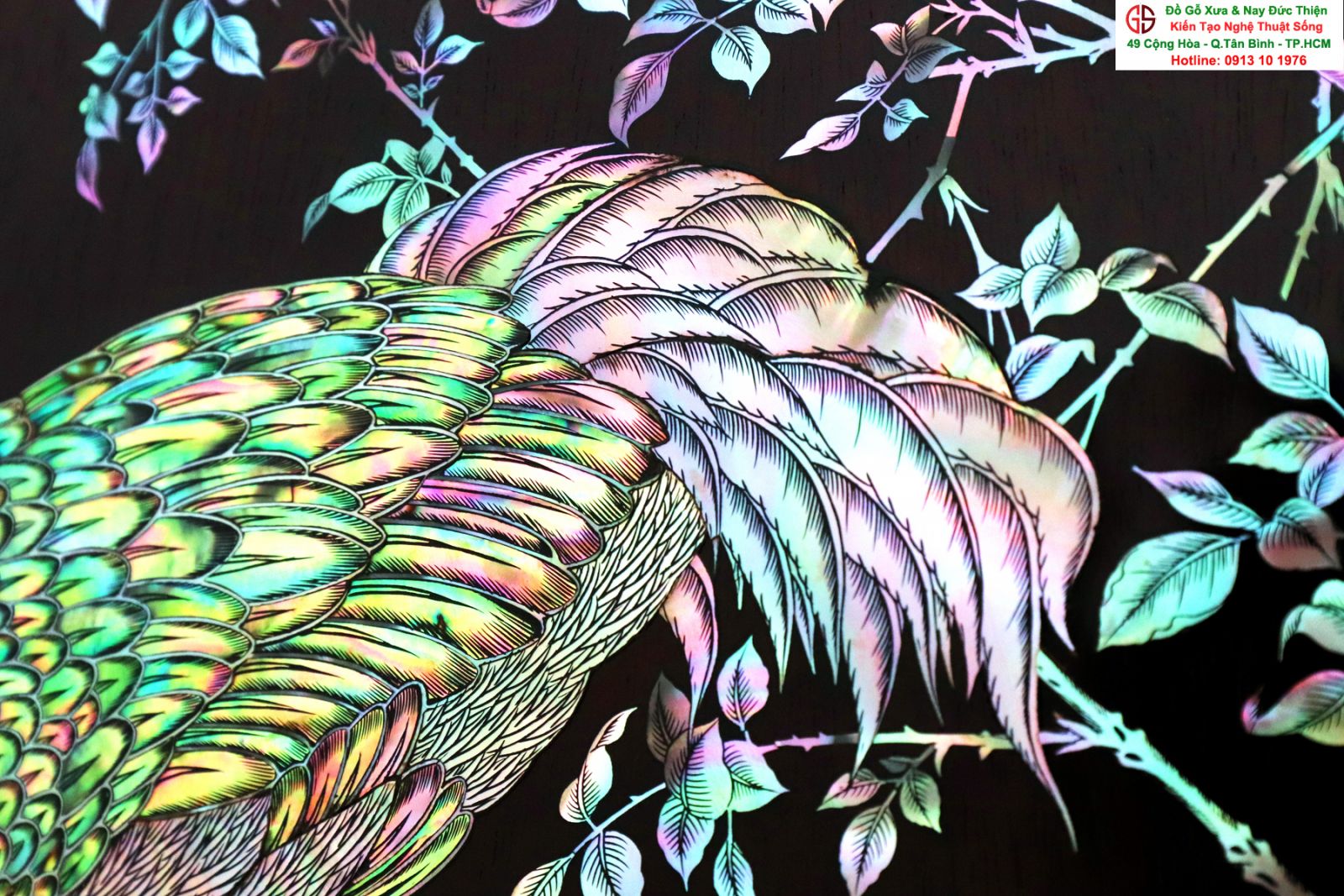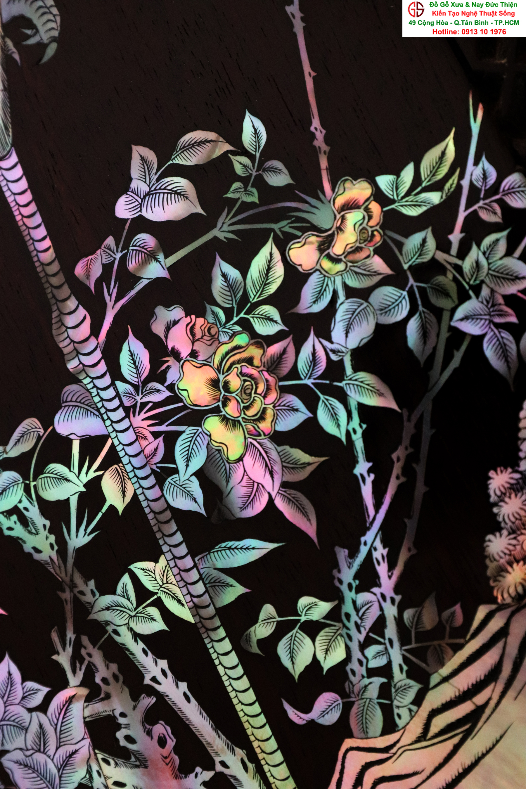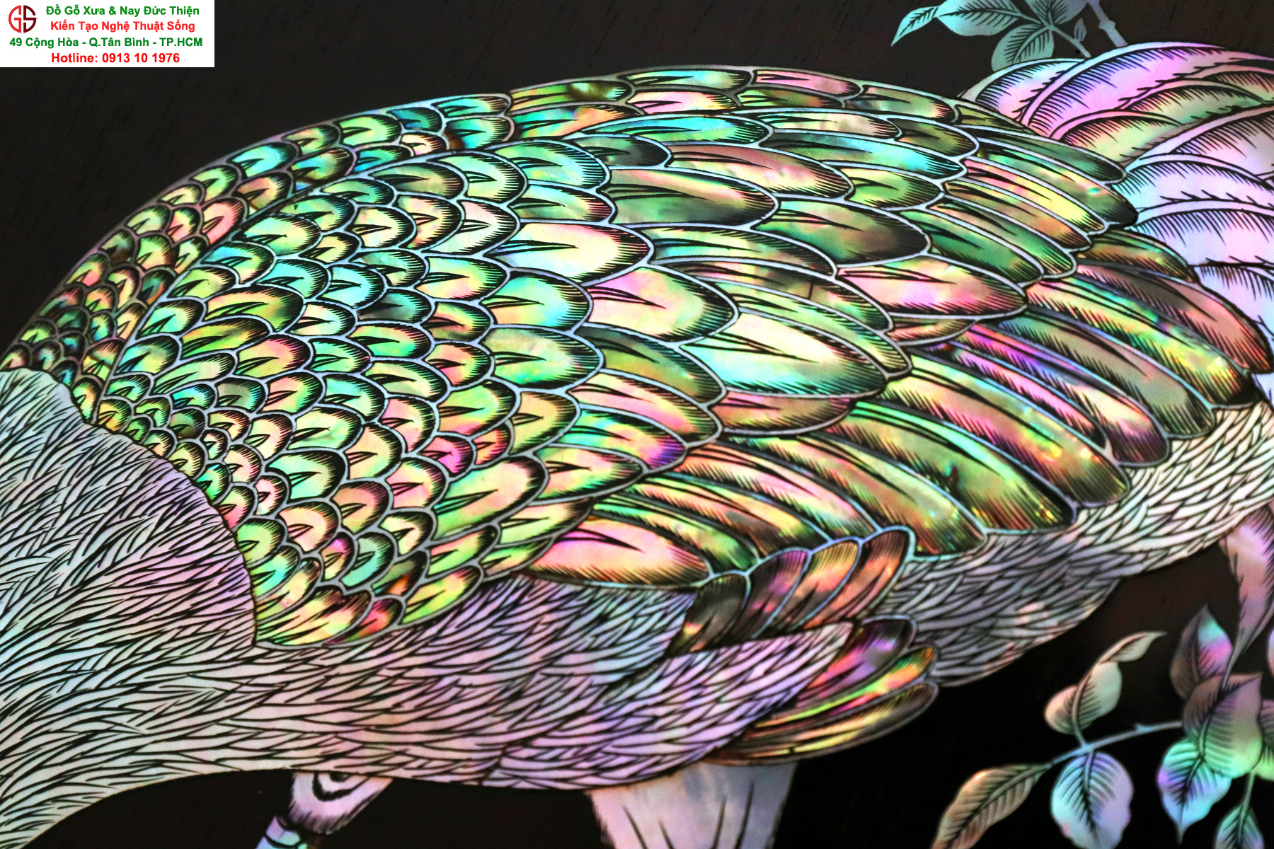 + Chất liệu: tấm tranh được cẩn ốc xà cừ đỏ lửa vàng chanh trên chất liệu gỗ gụ mật.