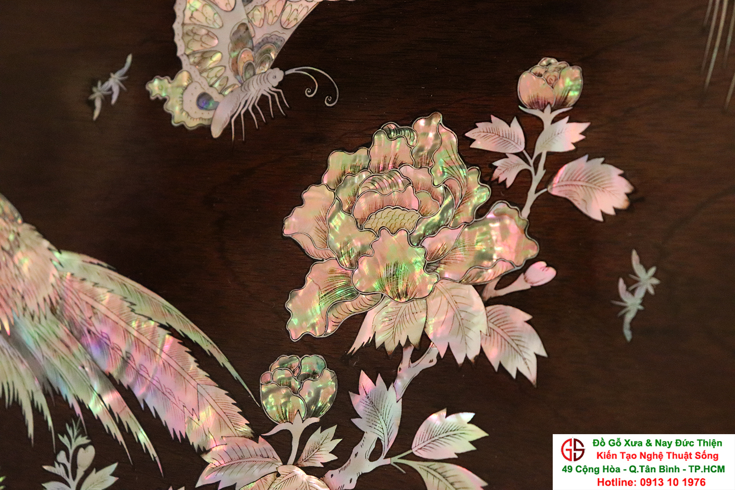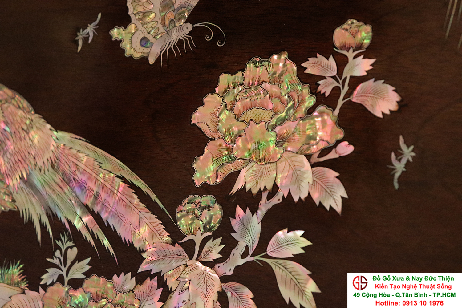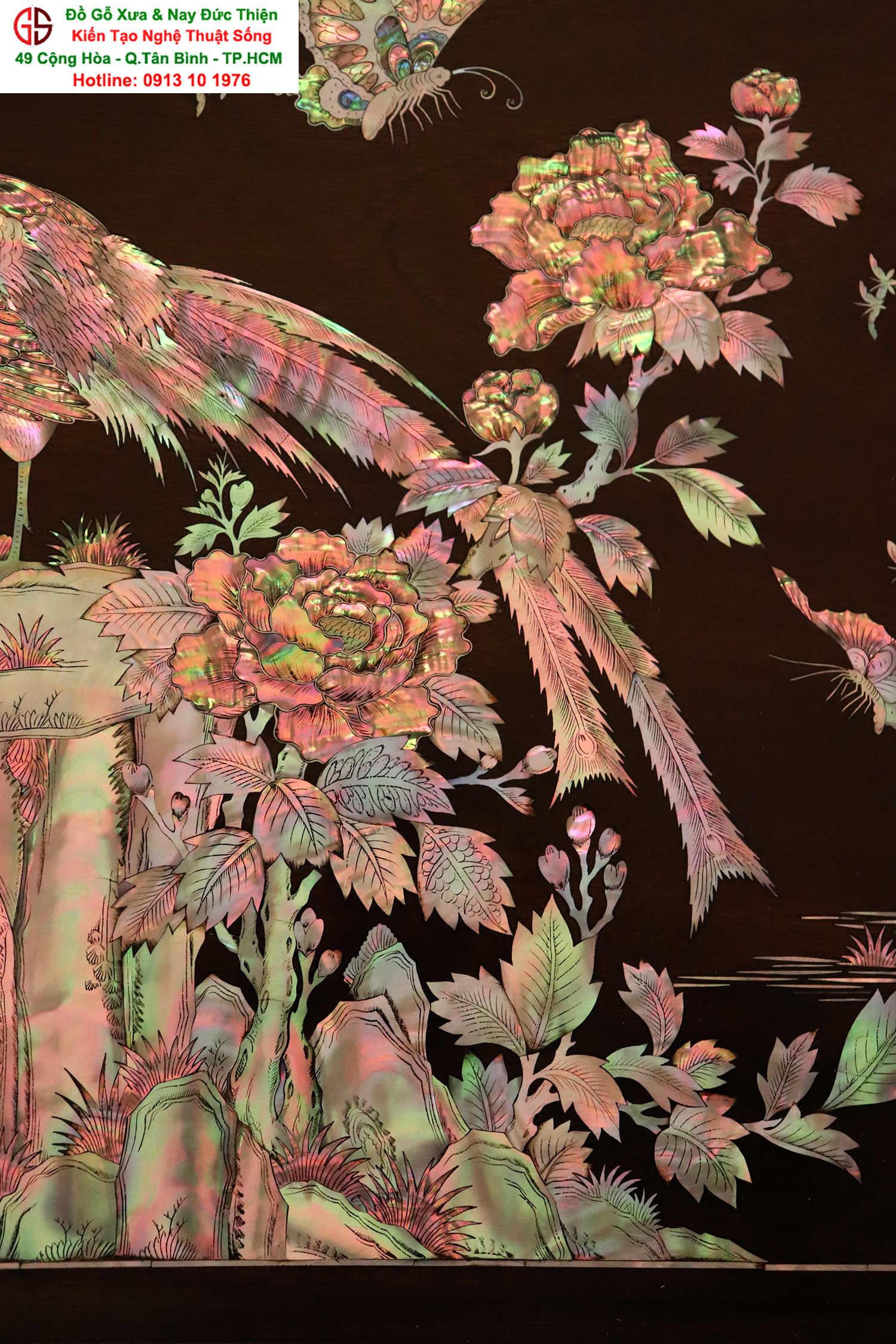 Tấm tranh đề tài : Vinh Hoa Phú Quý - được những người nghệ nhân tài hoa chọn lọc những nguyên liệu ốc xà cừ đỏ lửa vàng chanh chạm cẩn một cách hết sức cầu kỳ, tinh tế và tỉ mỉ. Hình tượng được khắc họa chủ đạo trong bức tranh là gốc hoa hồng với đôi chim quấn quýt bên nhau tượng trưng cho một cuộc sống sum vầy, hạnh phúc lứa đôi viên mãn.
