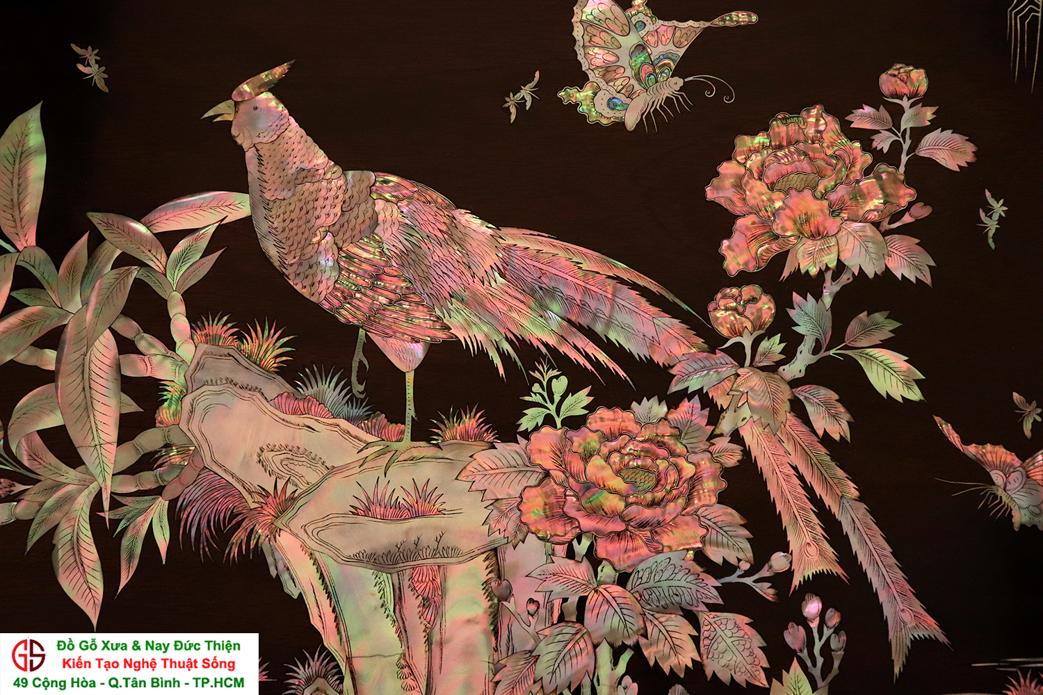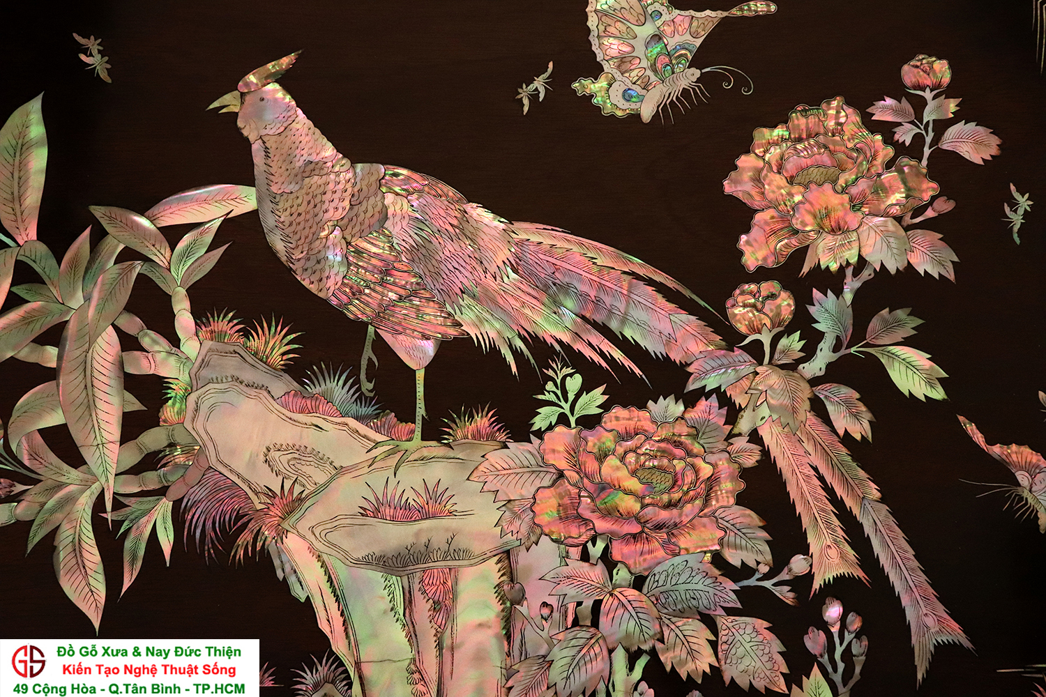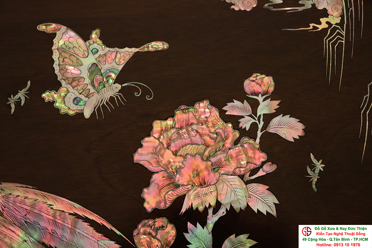 Tấm tranh đề tài : Vinh Hoa Phú Quý - được những người nghệ nhân tài hoa chọn lọc những nguyên liệu ốc xà cừ đỏ lửa vàng chanh chạm cẩn một cách hết sức cầu kỳ, tinh tế và tỉ mỉ. Hình tượng được khắc họa chủ đạo trong bức tranh là gốc hoa hồng với đôi chim quấn quýt bên nhau tượng trưng cho một cuộc sống sum vầy, hạnh phúc lứa đôi viên mãn.