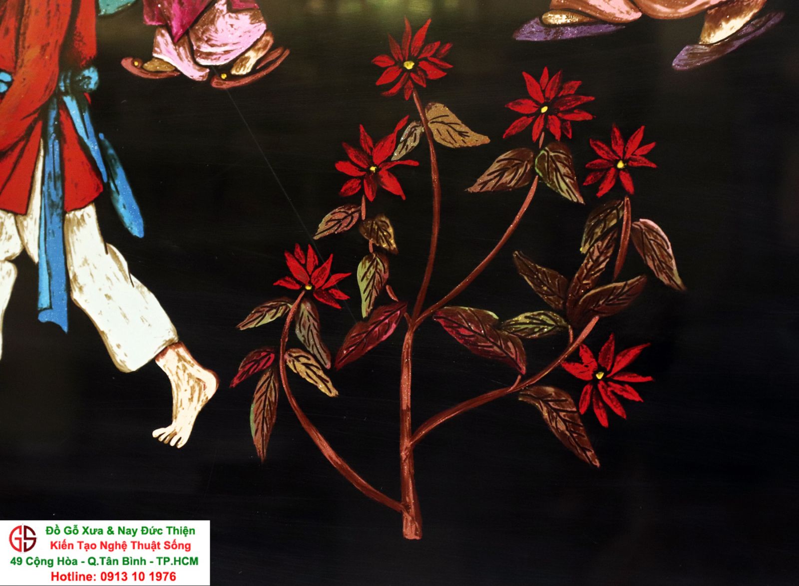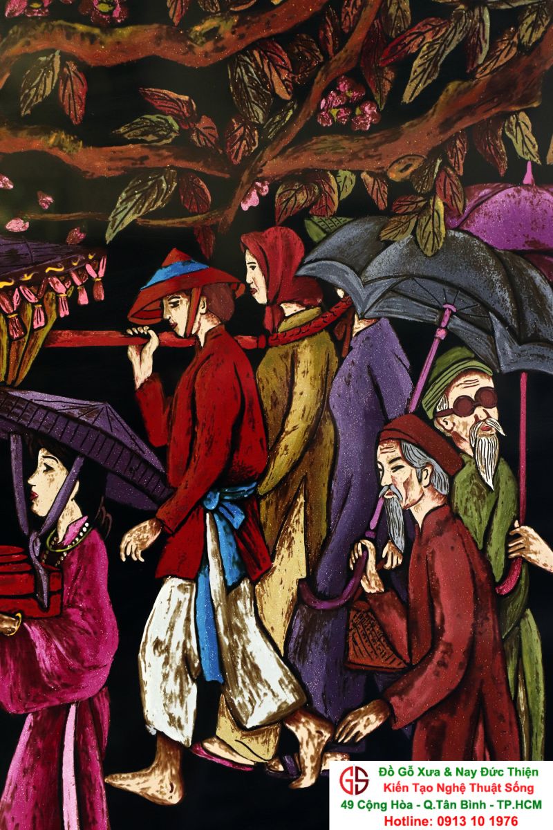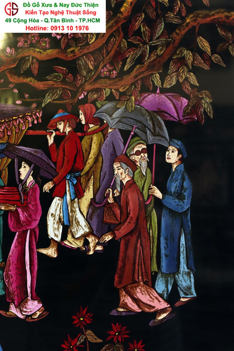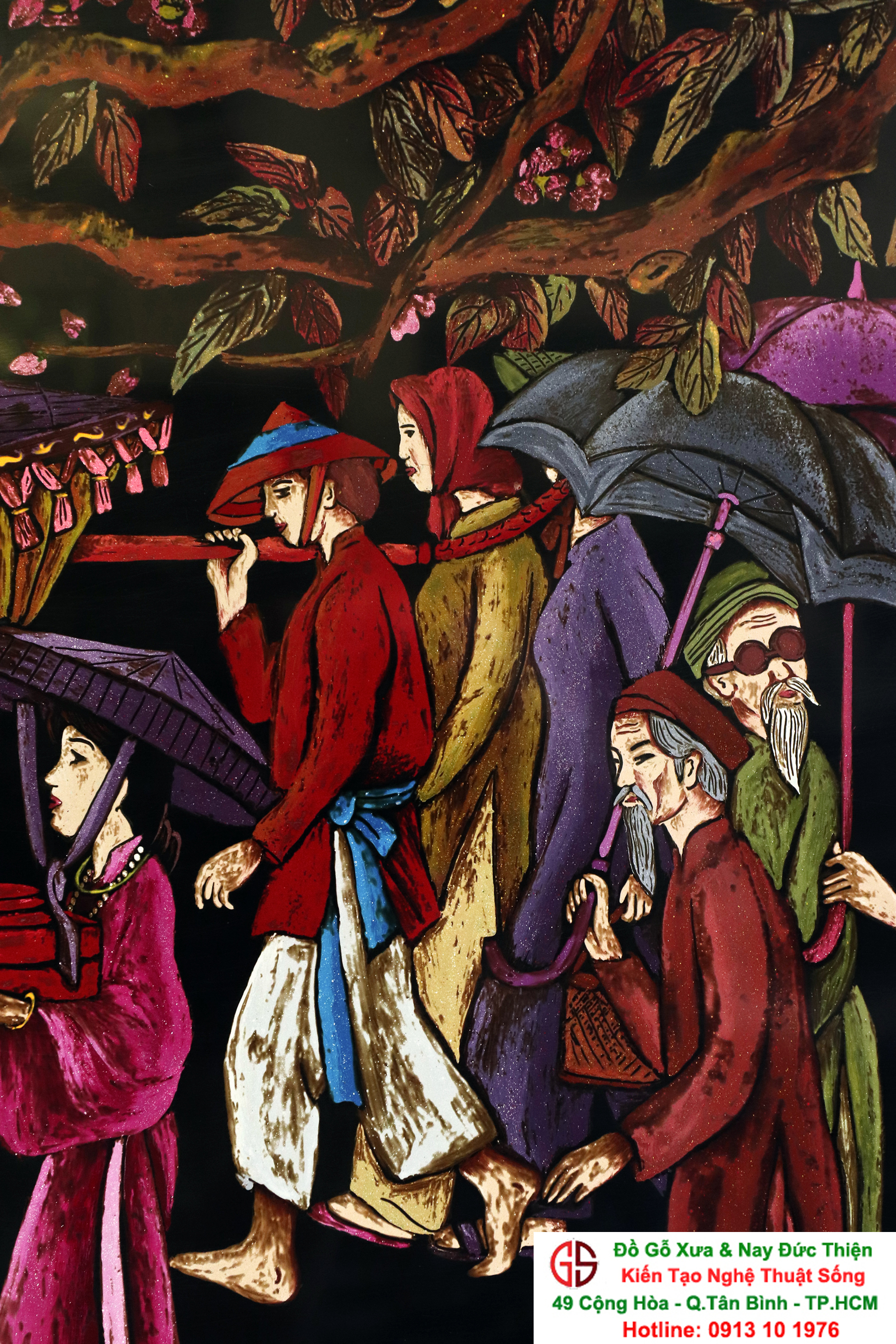 Tấm trang sơn mài vinh quy bái tổ các bạn đang xem có kích thước: 60 cm x 120 cm ( 70 cm x 130 cm cả khung) ______________________________________________________________________________________________