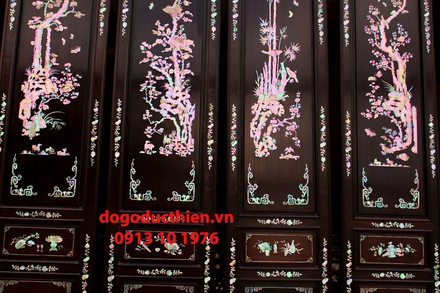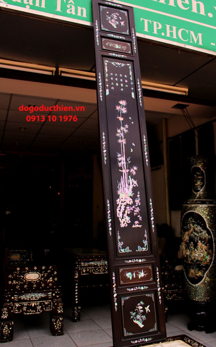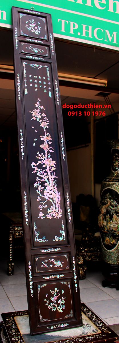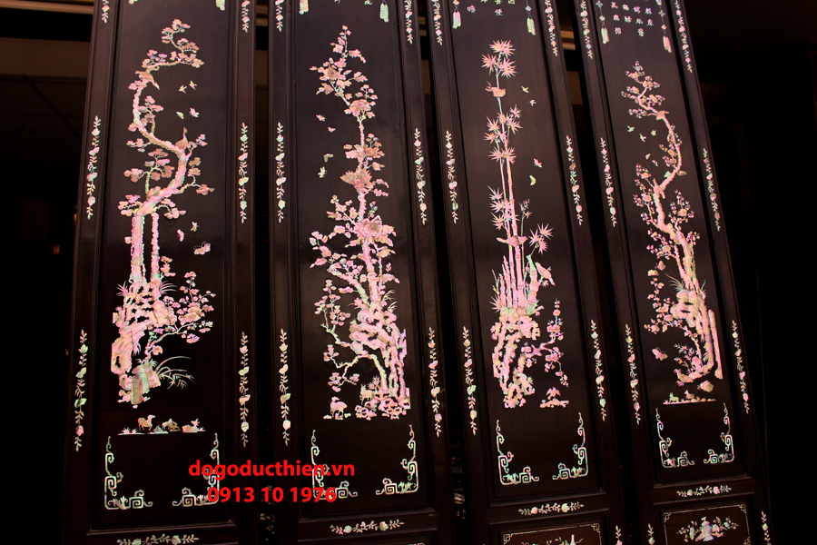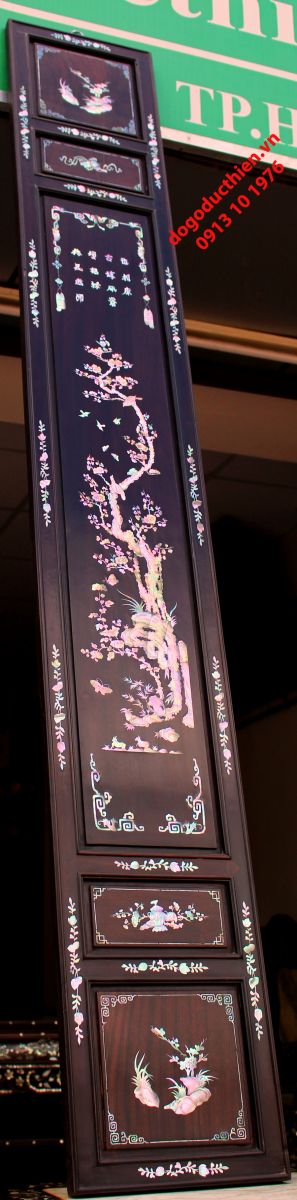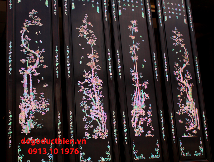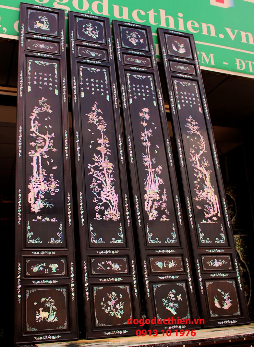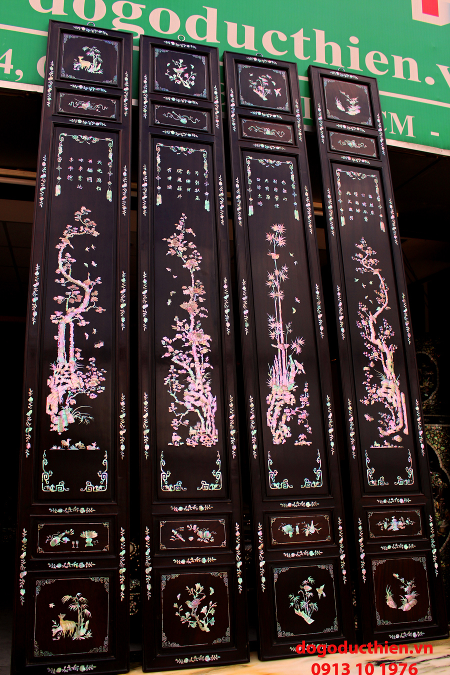 Tranh Tứ Quý Cẩn Ốc Đẹp : Tùng Cúc Trúc Mai - Dài Hiếm Thấy. Kích thước mỗi tấm: Rộng 29 cm x Cao 2,03 mét. Bốn bức tranh tượng trưng cho 4 mùa trong năm: Xuân,Hạ, Thu, Đông. Hình tượng tùng cúc trúc mai được cẩn từ ốc xà cừ 100 % , nghệ thuật cắt tỉa sinh động. Bốn tấm tranh thương được treo trong phòng khách của các gia đình giàu có, quan lại xưa tạo lên vẻ lịch lãm, sang trọng, đẳng cấp.