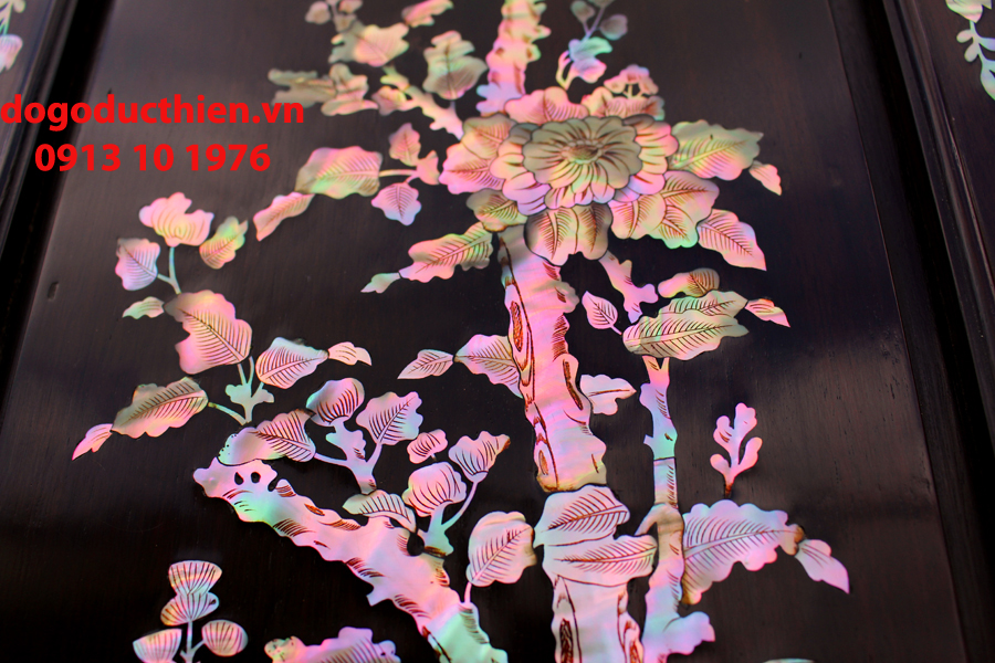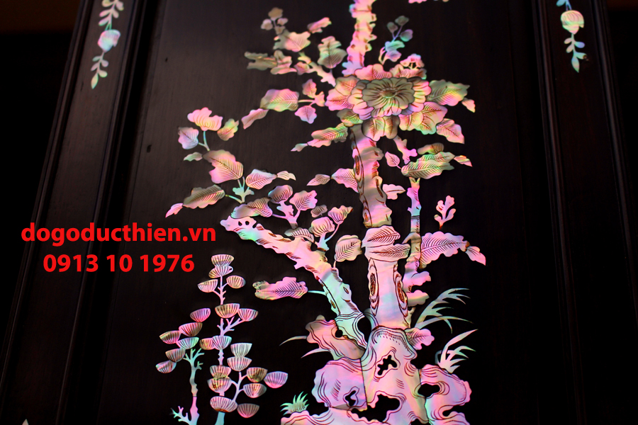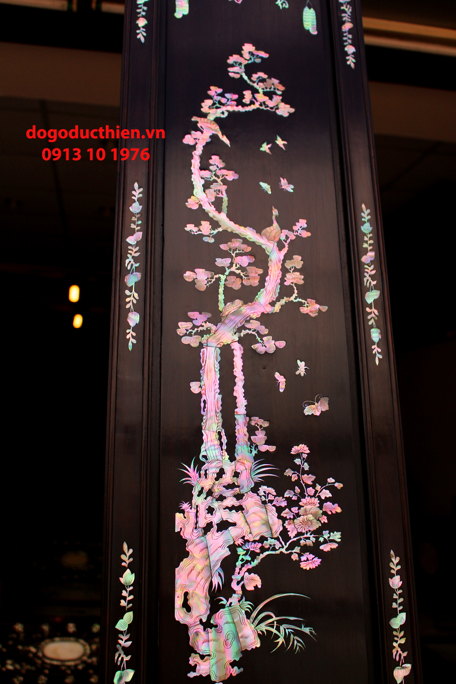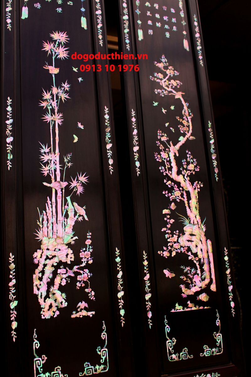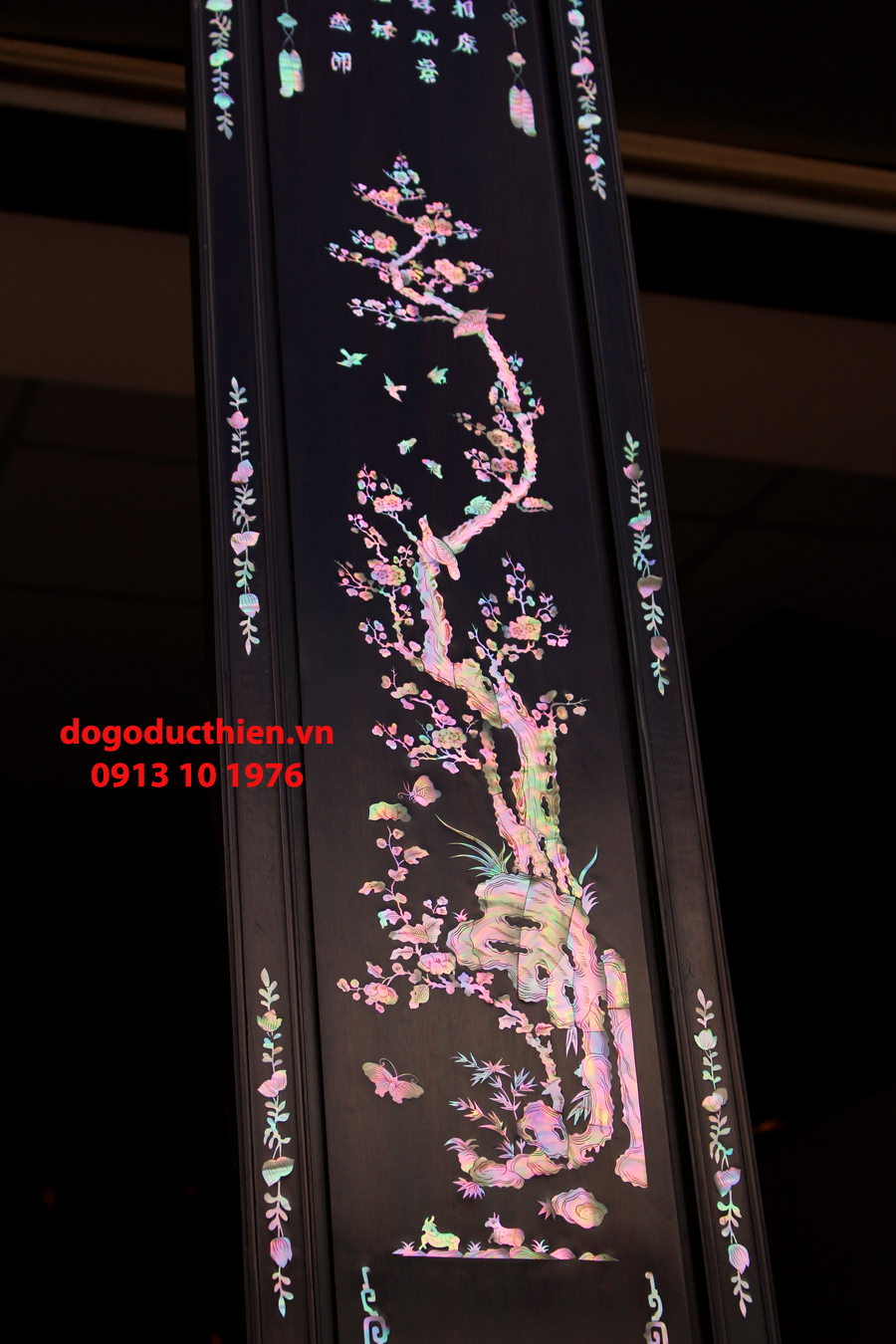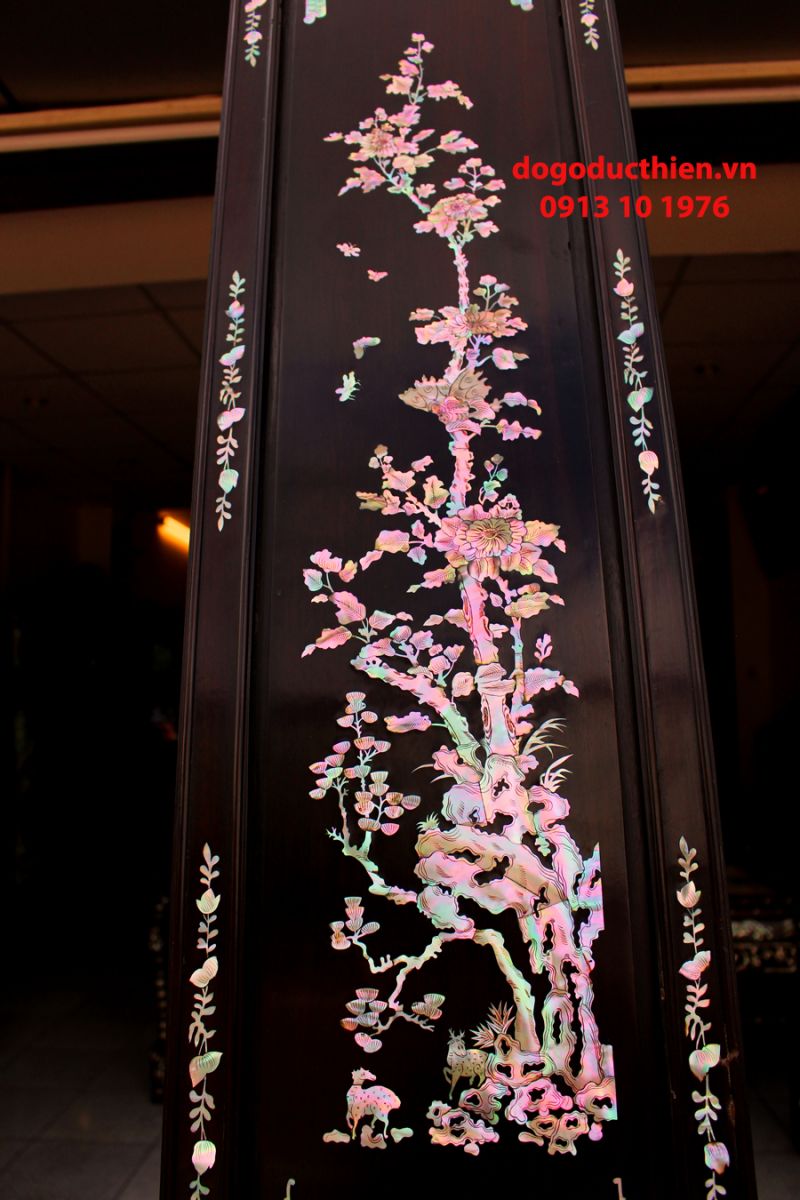 Tranh Tứ Quý Cẩn Ốc Đẹp : Tùng Cúc Trúc Mai - Dài Hiếm Thấy. Kích thước mỗi tấm: Rộng 29 cm x Cao 2,03 mét. Bốn bức tranh tượng trưng cho 4 mùa trong năm: Xuân,Hạ, Thu, Đông. Hình tượng tùng cúc trúc mai được cẩn từ ốc xà cừ 100 % , nghệ thuật cắt tỉa sinh động. Bốn tấm tranh thương được treo trong phòng khách của các gia đình giàu có, quan lại xưa tạo lên vẻ lịch lãm, sang trọng, đẳng cấp.