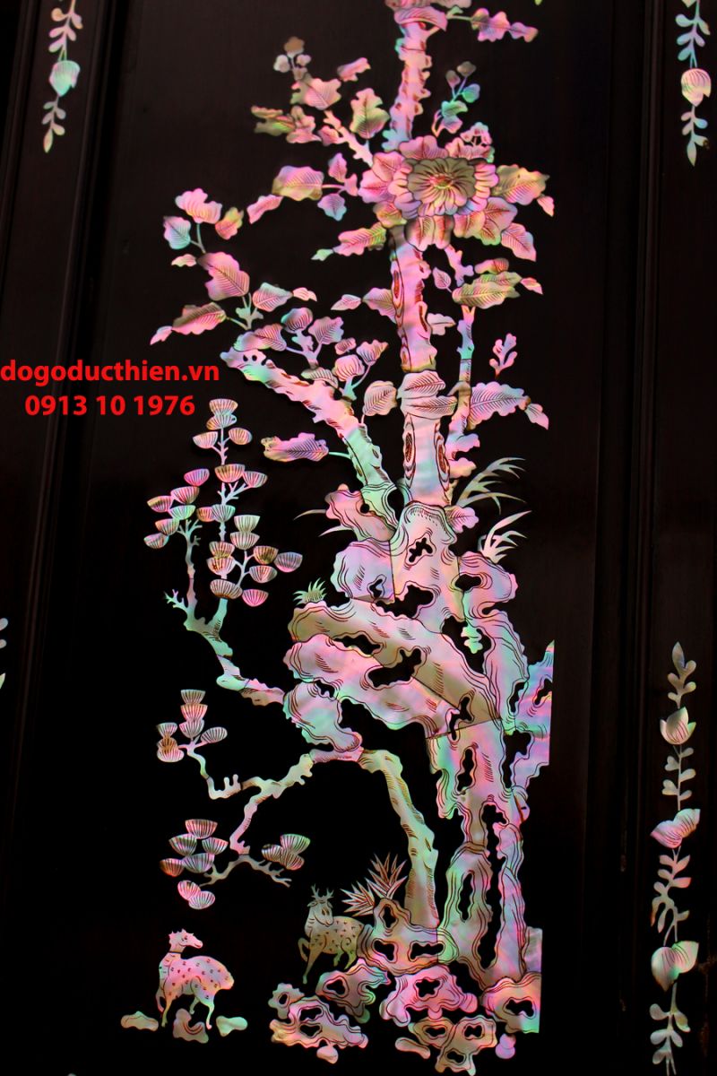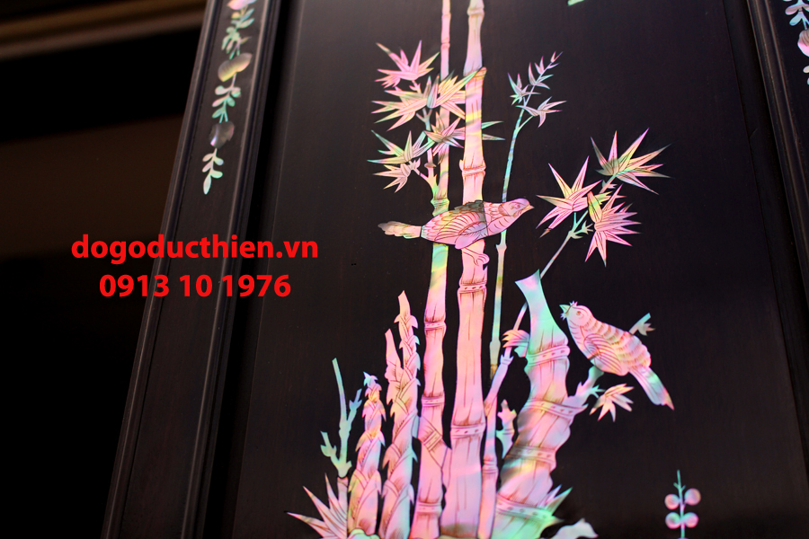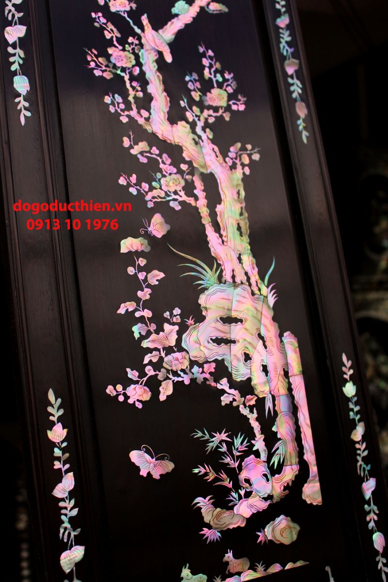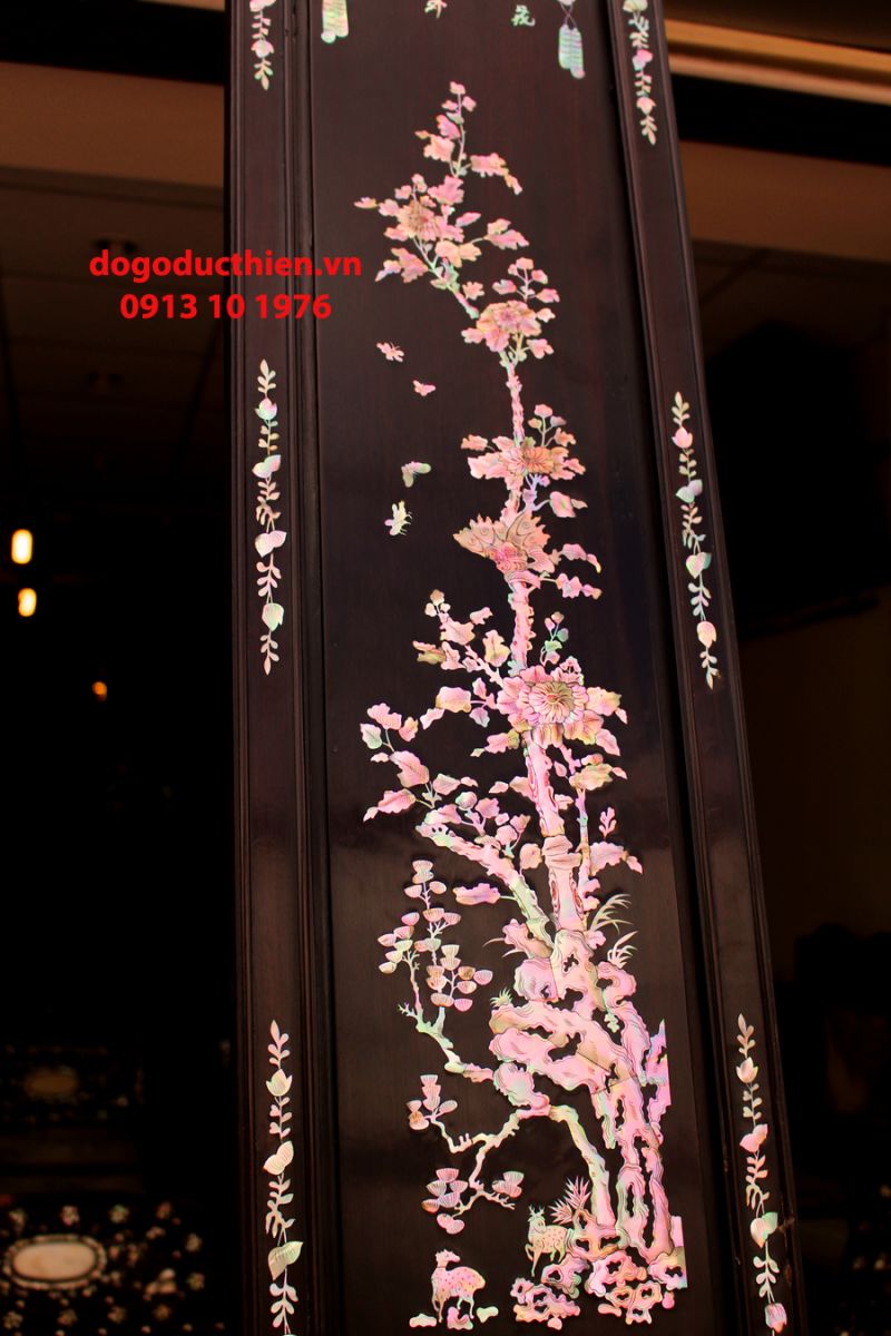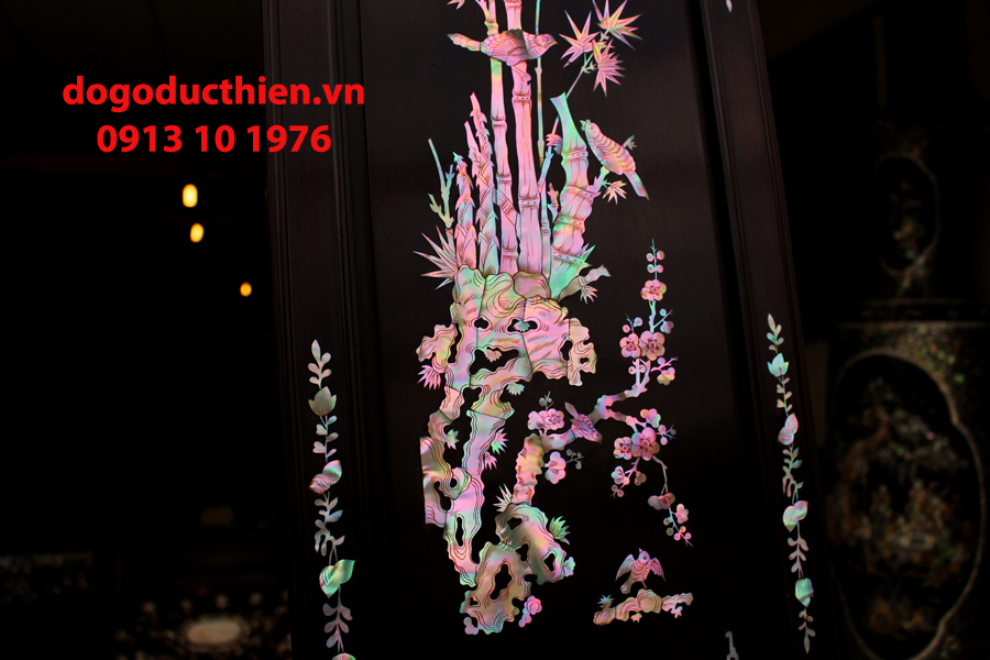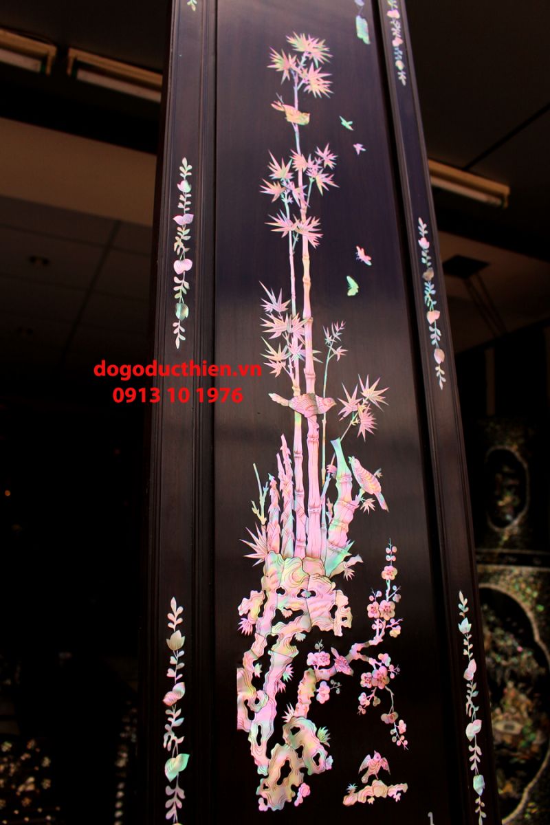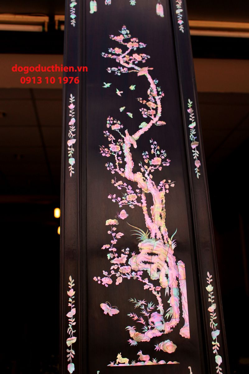 Tranh Tứ Quý Cẩn Ốc Đẹp : Tùng Cúc Trúc Mai - Dài Hiếm Thấy. Kích thước mỗi tấm: Rộng 29 cm x Cao 2,03 mét. Bốn bức tranh tượng trưng cho 4 mùa trong năm: Xuân,Hạ, Thu, Đông. Hình tượng tùng cúc trúc mai được cẩn từ ốc xà cừ 100 % , nghệ thuật cắt tỉa sinh động. Bốn tấm tranh thương được treo trong phòng khách của các gia đình giàu có, quan lại xưa tạo lên vẻ lịch lãm, sang trọng, đẳng cấp.