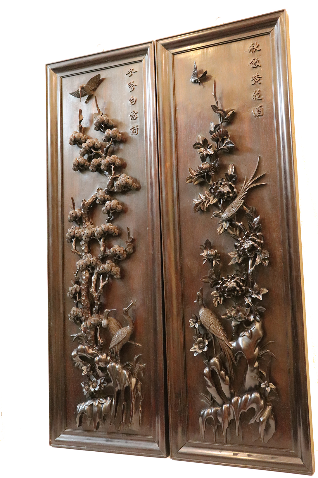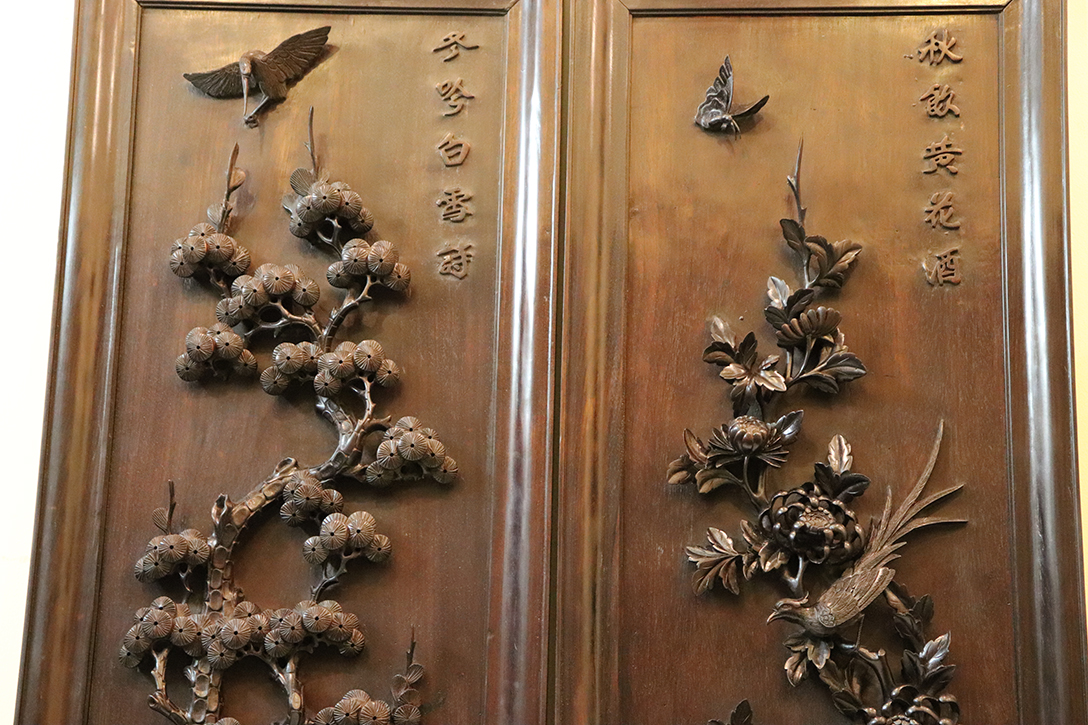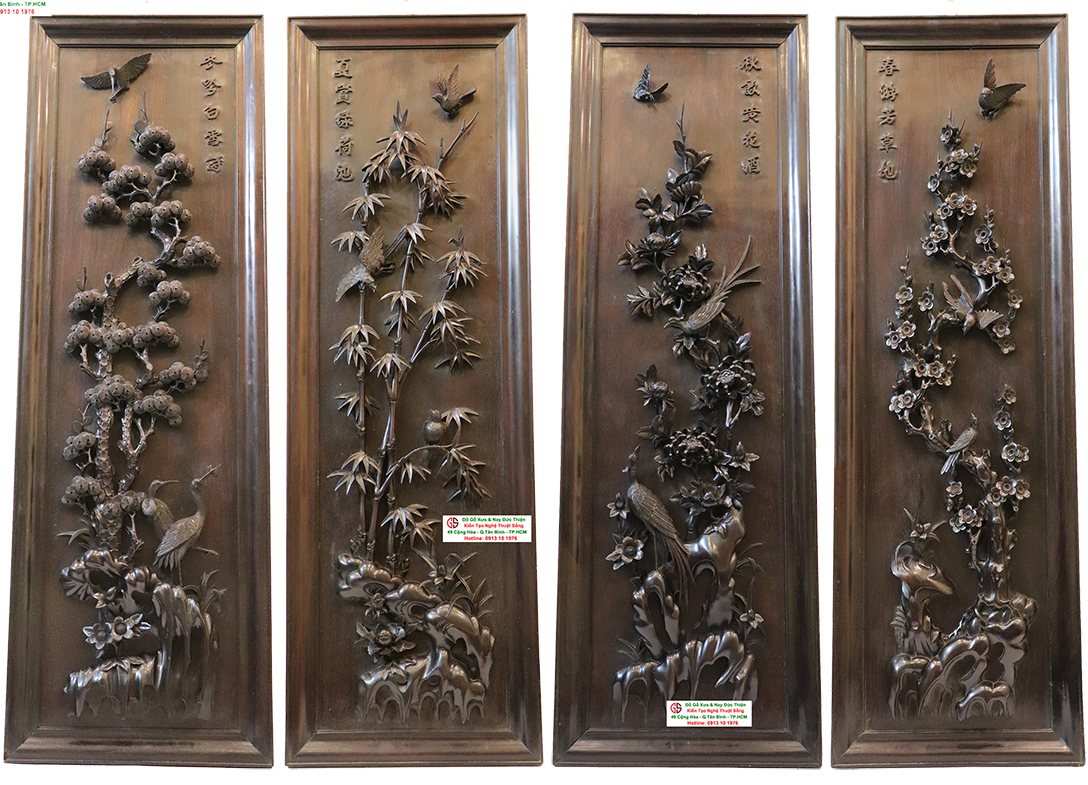 Đề tài được thể hiện ở bộ tranh này là tùng cúc trúc mai - bốn cây tượng trưng cho 4 mùa trong năm: Xuân Hạ Thu Đông. Điểm đặc biệt của bộ tranh này là tất cả gỗ được sử dụng đều là gỗ gụ nguyên tấm: Một tấm gỗ dày khoảng 5 cm được những người nghệ nhân lành nghề chạm khắc bằng nay nổi lên trên nền gỗ. Chính vì làm hoàn toàn bằng thủ công tay nên nét chạm khắc cực kỳ sinh động, không nét nào giống nét nào. Nó khắc hẳn với những tác phẩm chạm máy cứng nhắc và vô hồn.