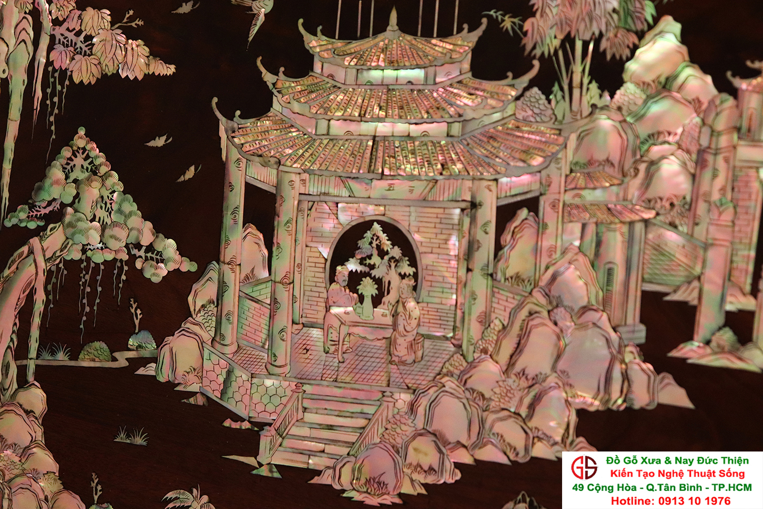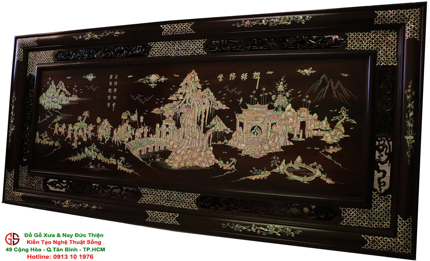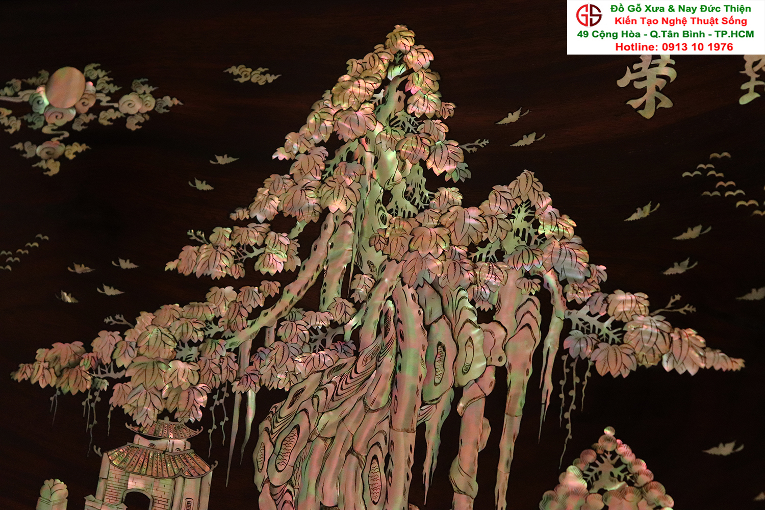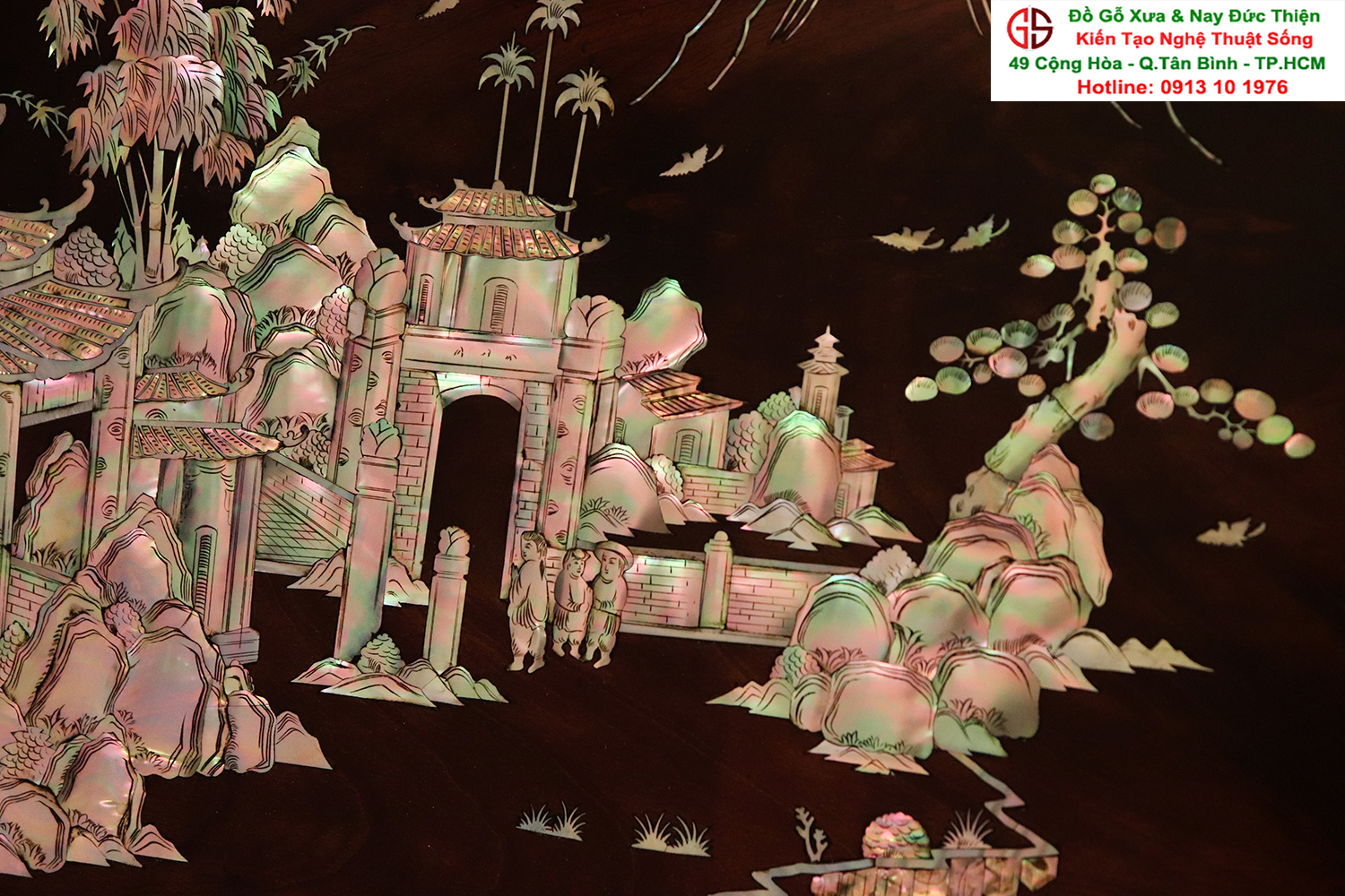 - Chất liệu: tranh được làm trên chất liệu gỗ gụ nguyên tấm, khảm ốc xà cừ