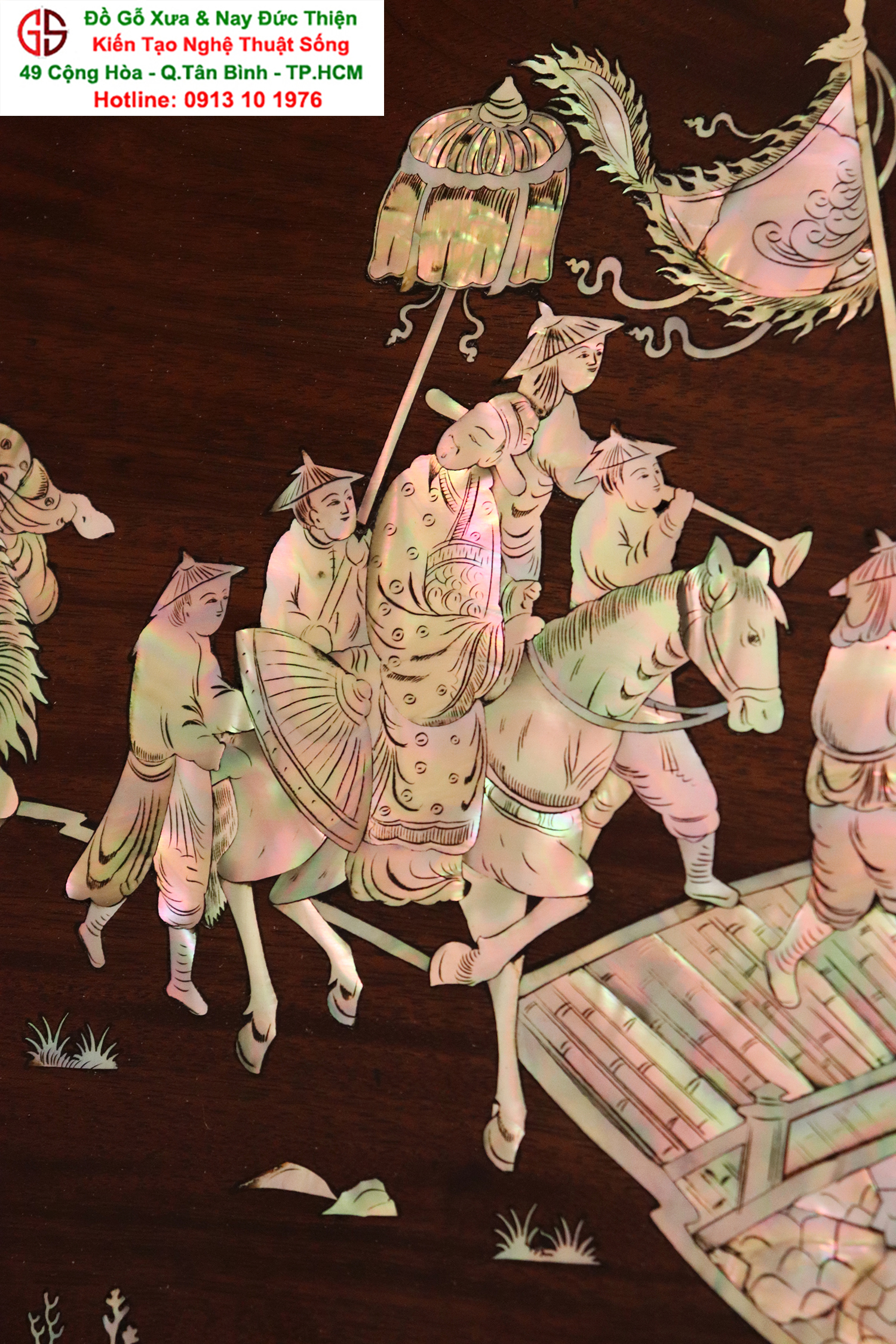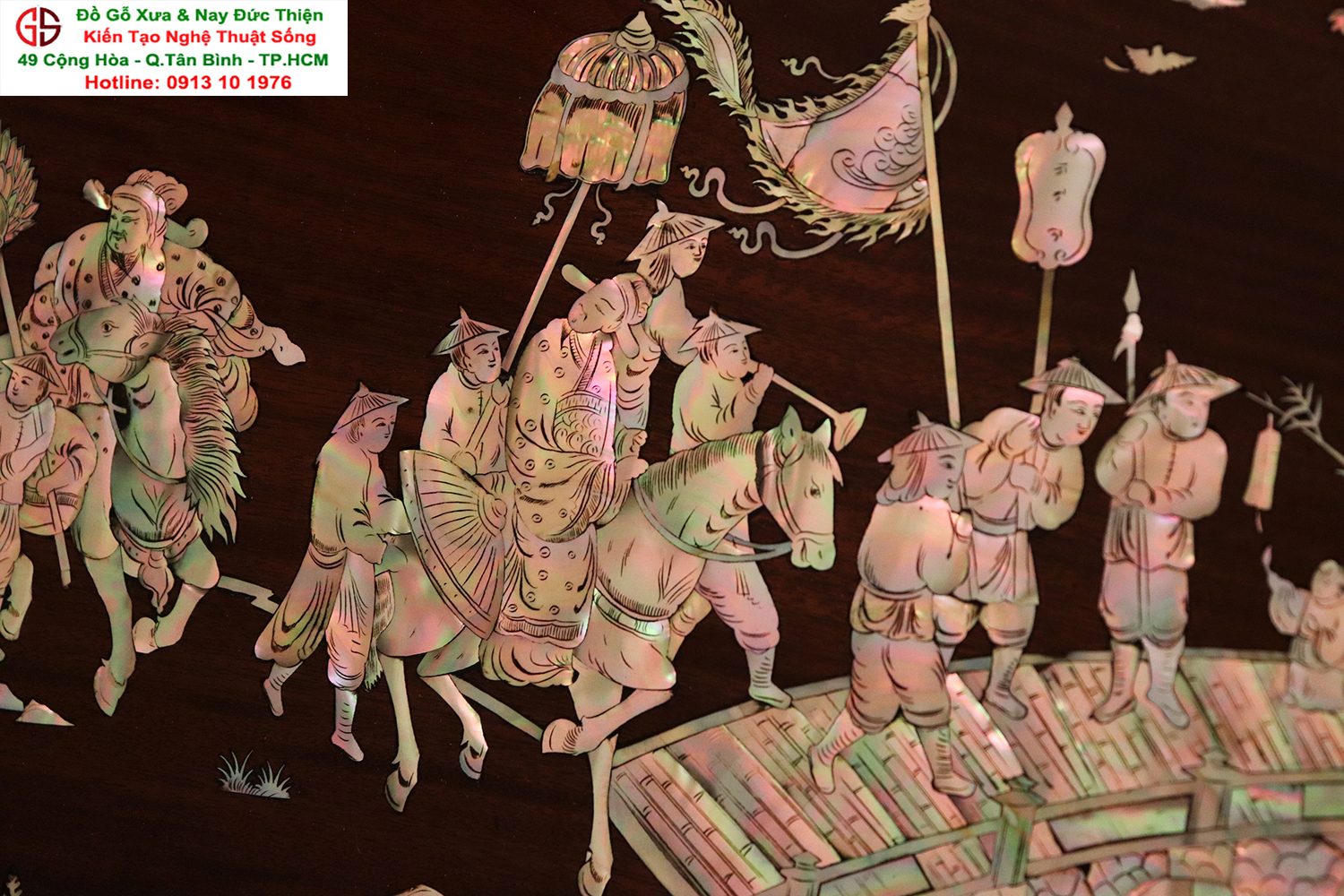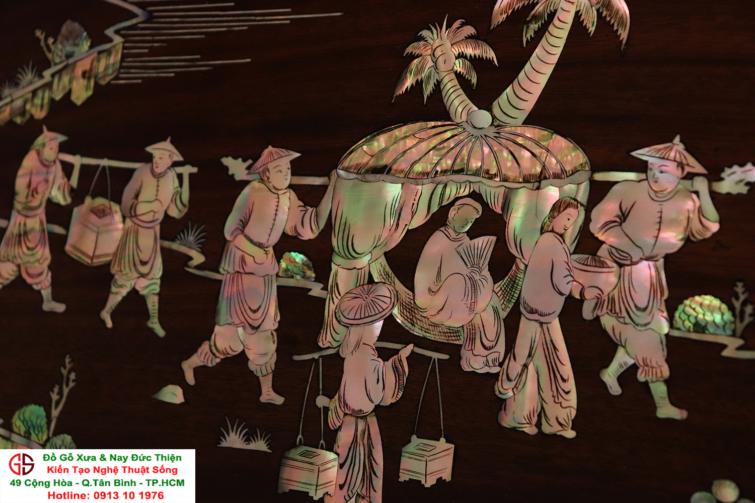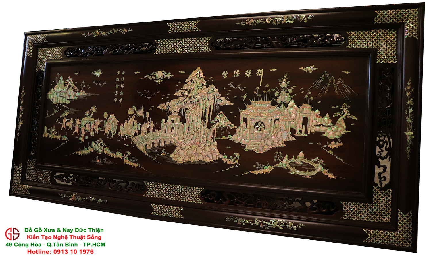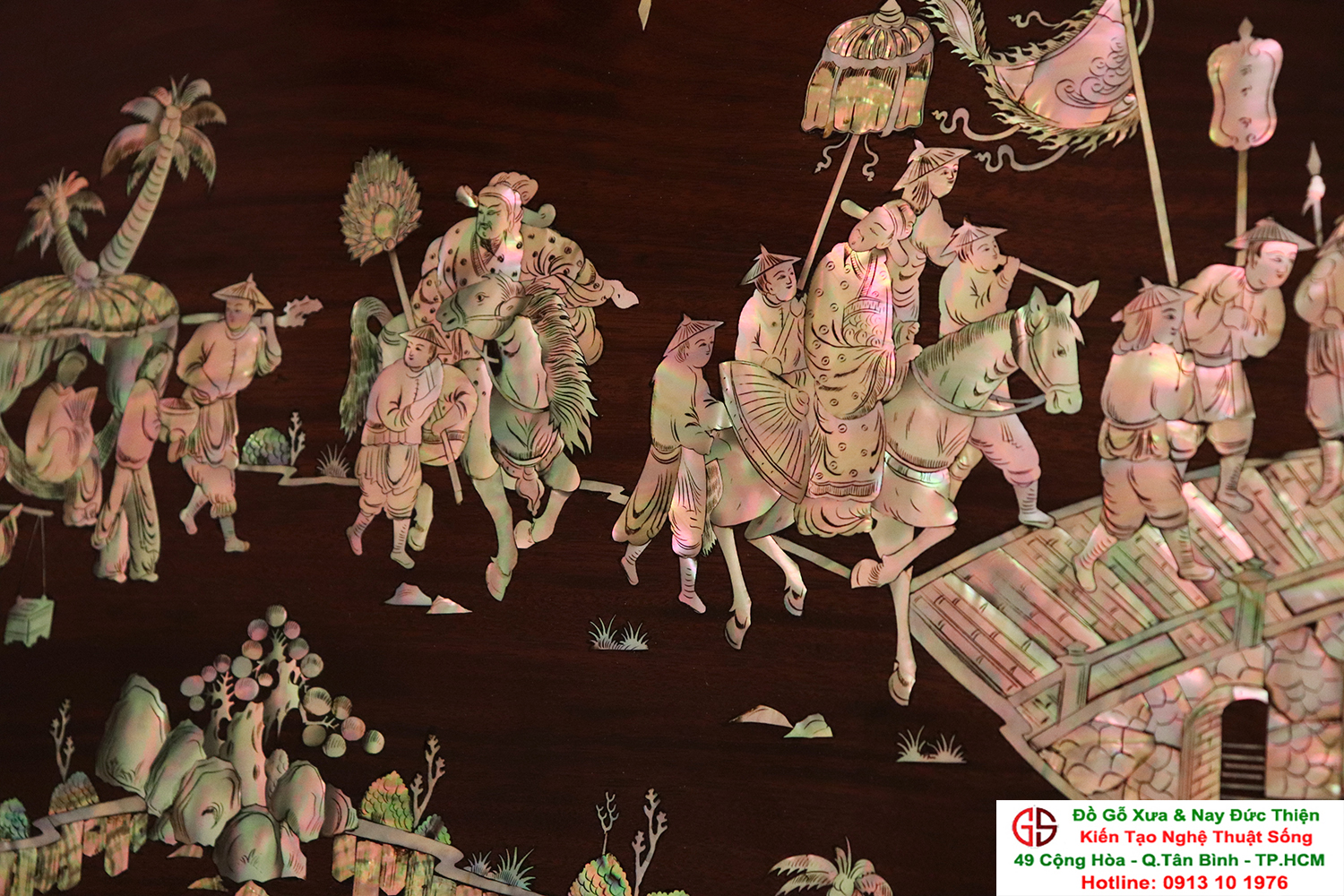 - Chất liệu: tranh được làm trên chất liệu gỗ gụ nguyên tấm, khảm ốc xà cừ