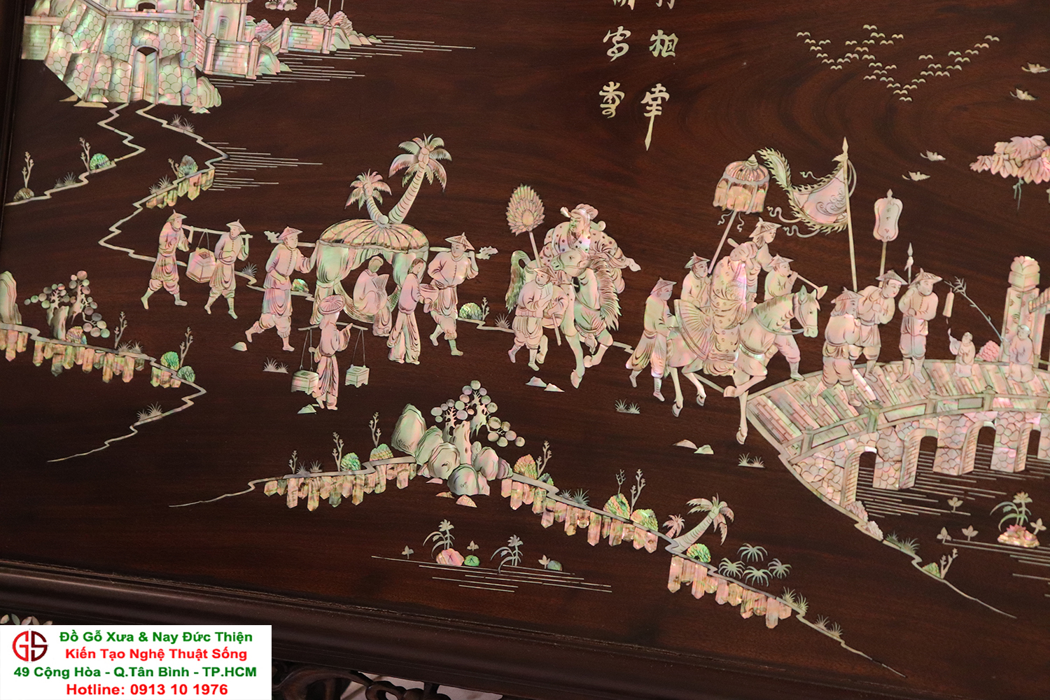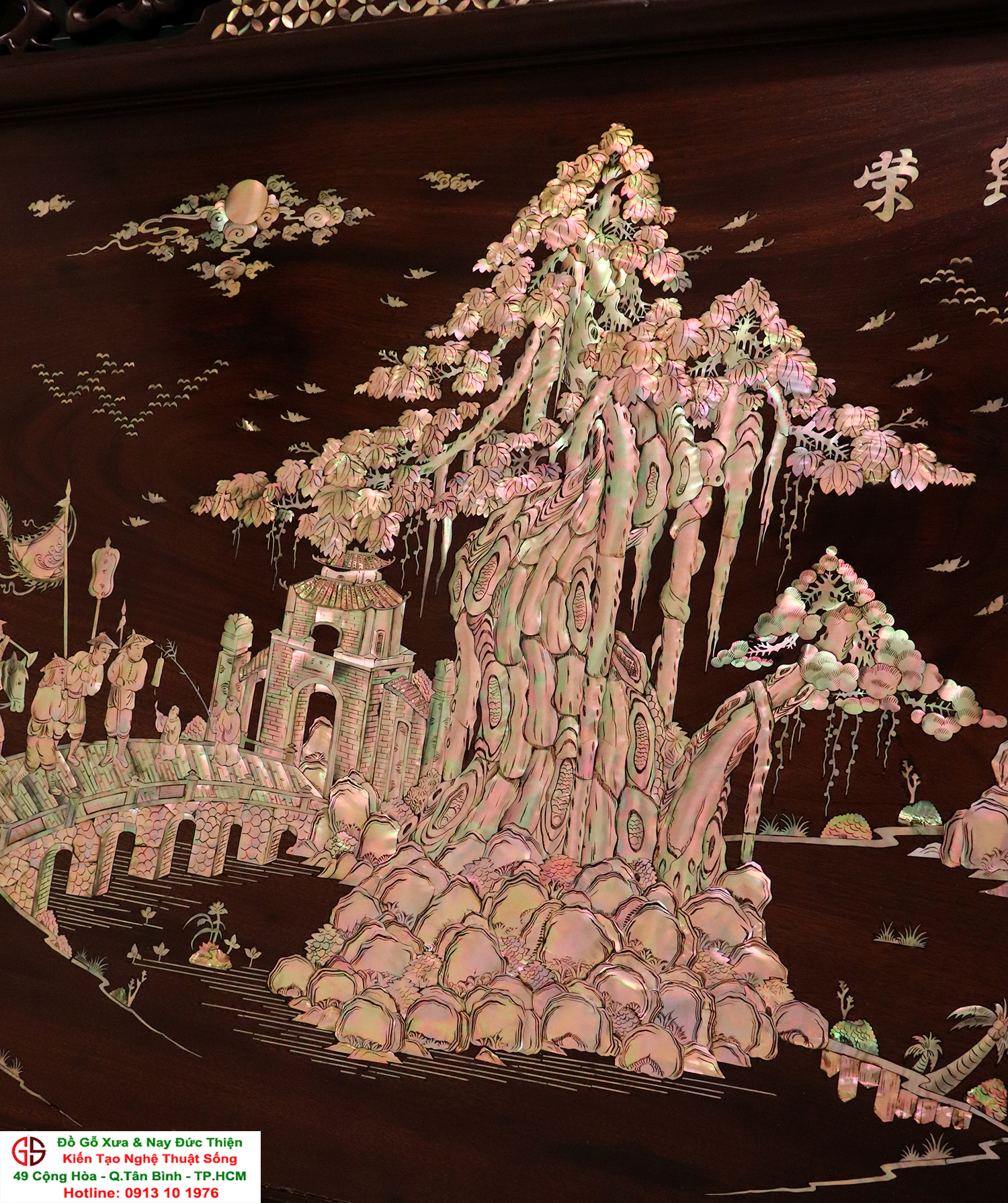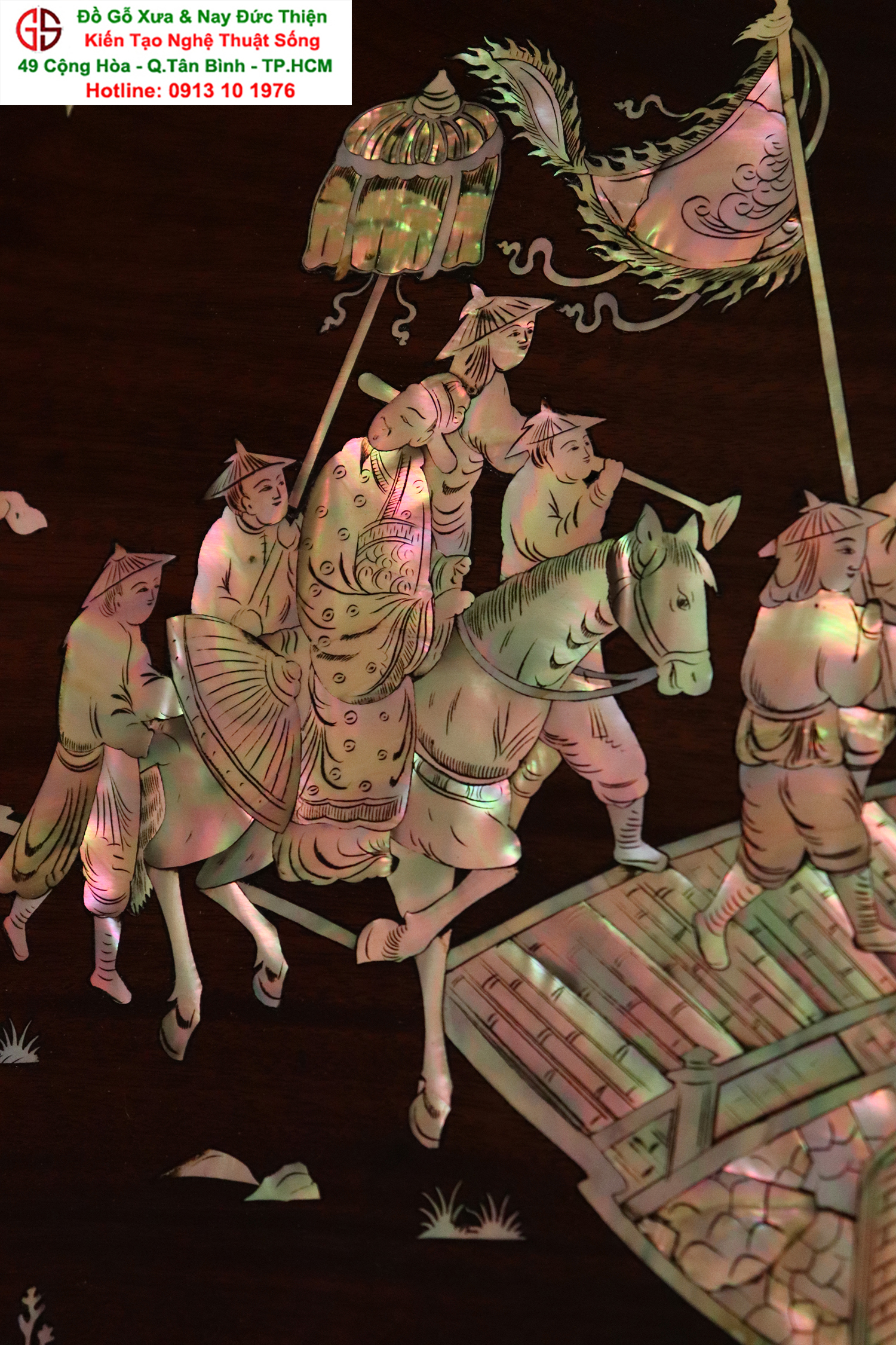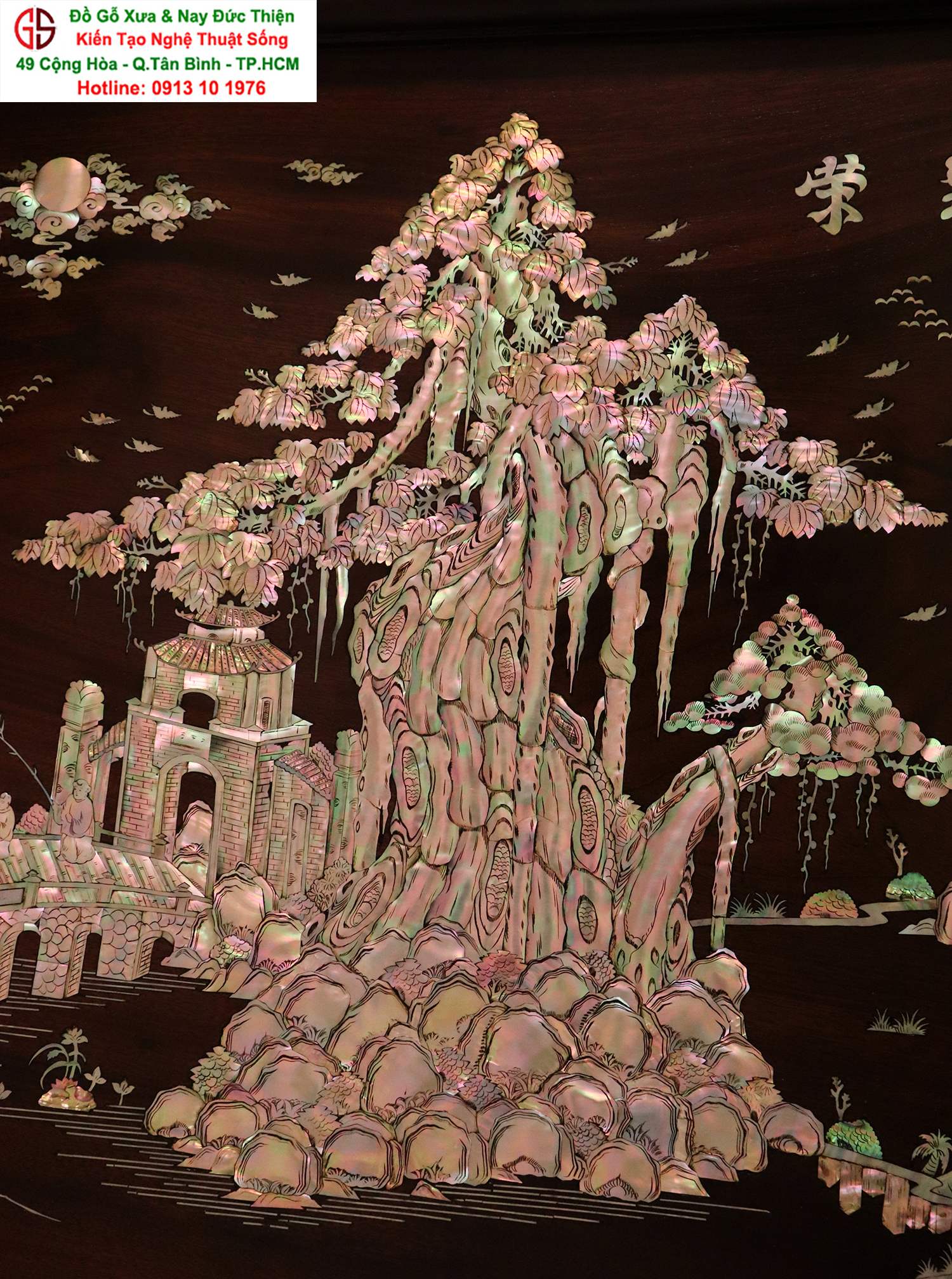 - Chất liệu: tranh được làm trên chất liệu gỗ gụ nguyên tấm, khảm ốc xà cừ