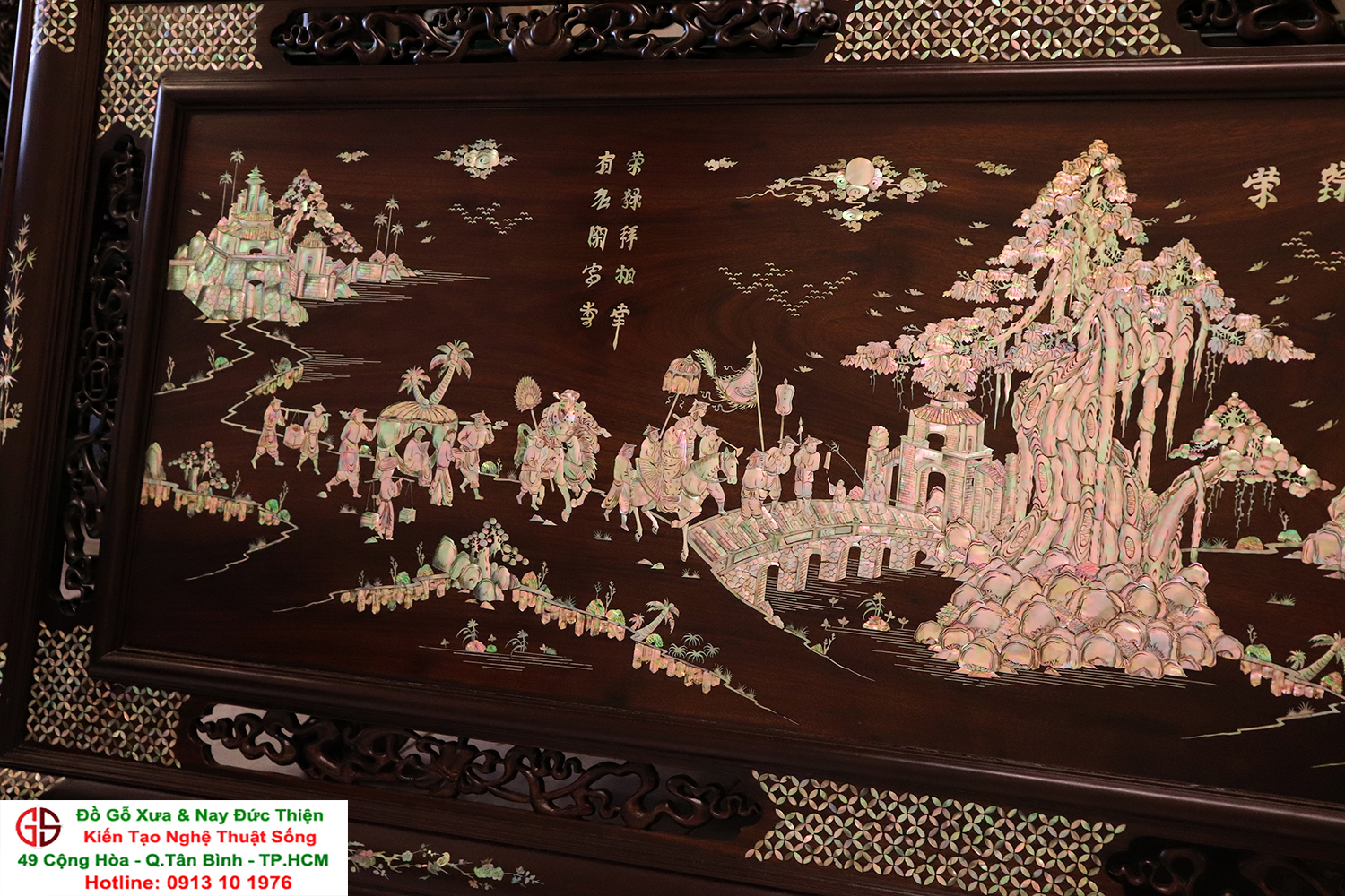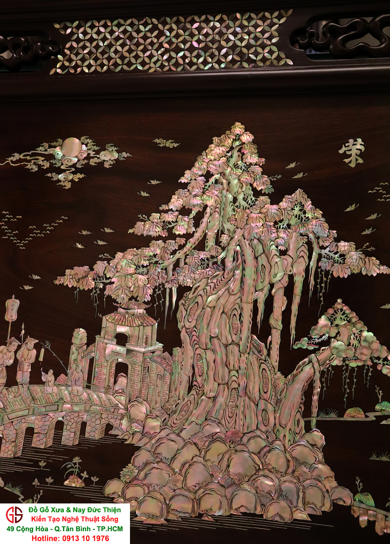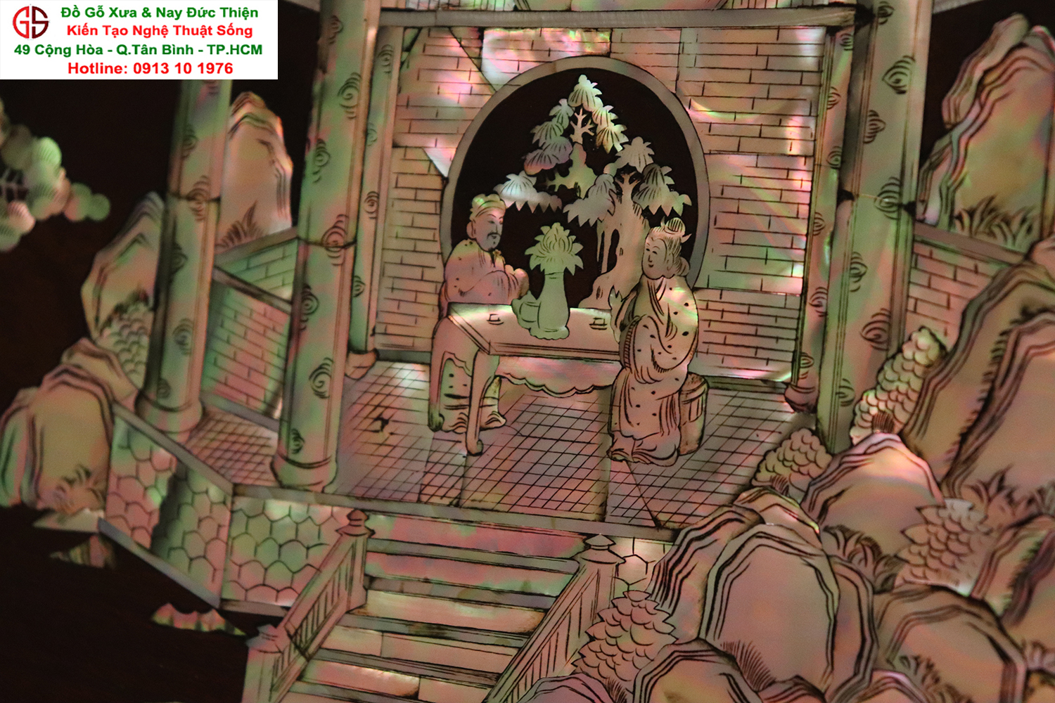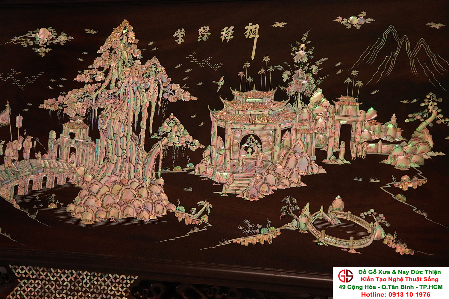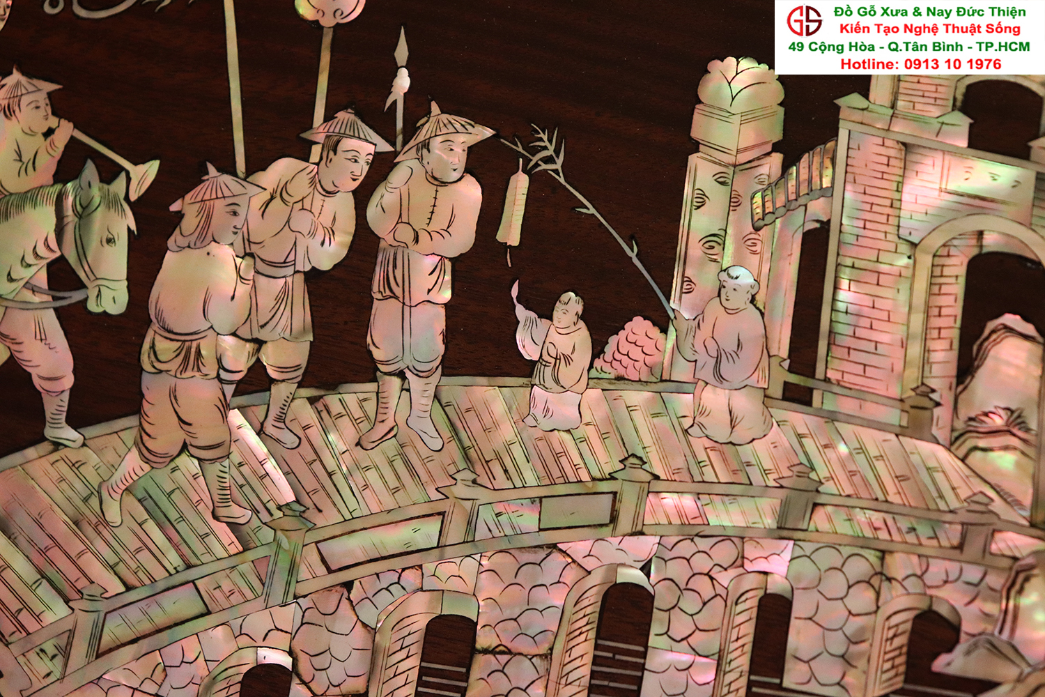 - Chất liệu: tranh được làm trên chất liệu gỗ gụ nguyên tấm, khảm ốc xà cừ