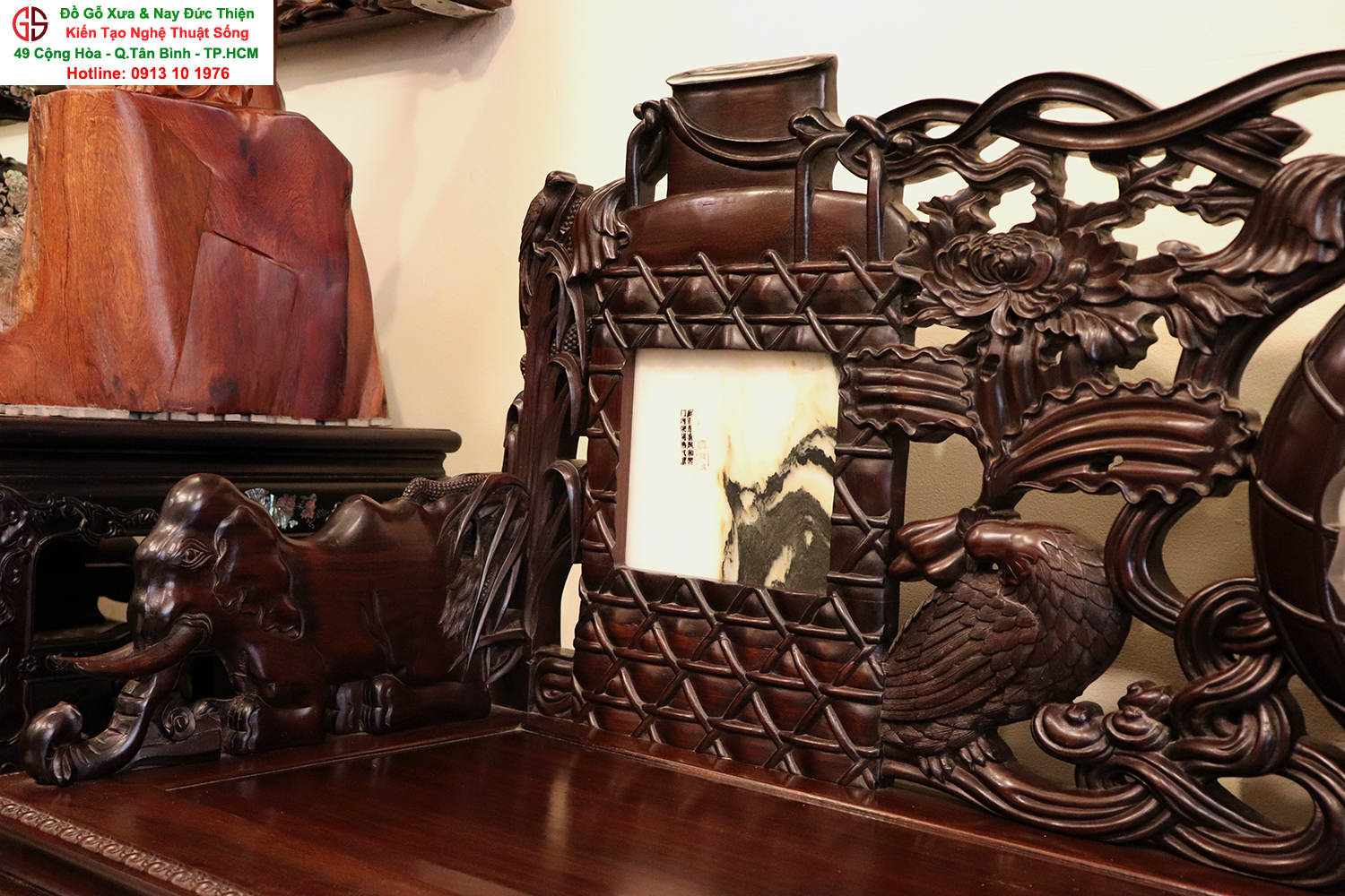 Thứ nữa là sự trau truốt trong từng đường nét chạm khắc hết sức mềm mại, uyển chuyển, cầu kỳ nhưng không rối, ngược lại hết sức thanh thoát và rõ ràng trong bố cục thể hiện. Hai hình tượng chủ đạo là voi và sư tử mẹ chơi đùa với sư tử con được người nghệ nhân chạm khắc sinh động và có hồn. Trong phong thủy, voi là linh vật mang lại tài lộc, bình an và may mắn, thịnh vượng, sư tử cũng là linh vật tượng trưng cho quyền lực của gia chủ, sư tử cái kìm hãm chú sư tử con nghịch ngợm dưới móng vuốt của mình với ý nghĩa giữ cho gia đình yên ấm.
