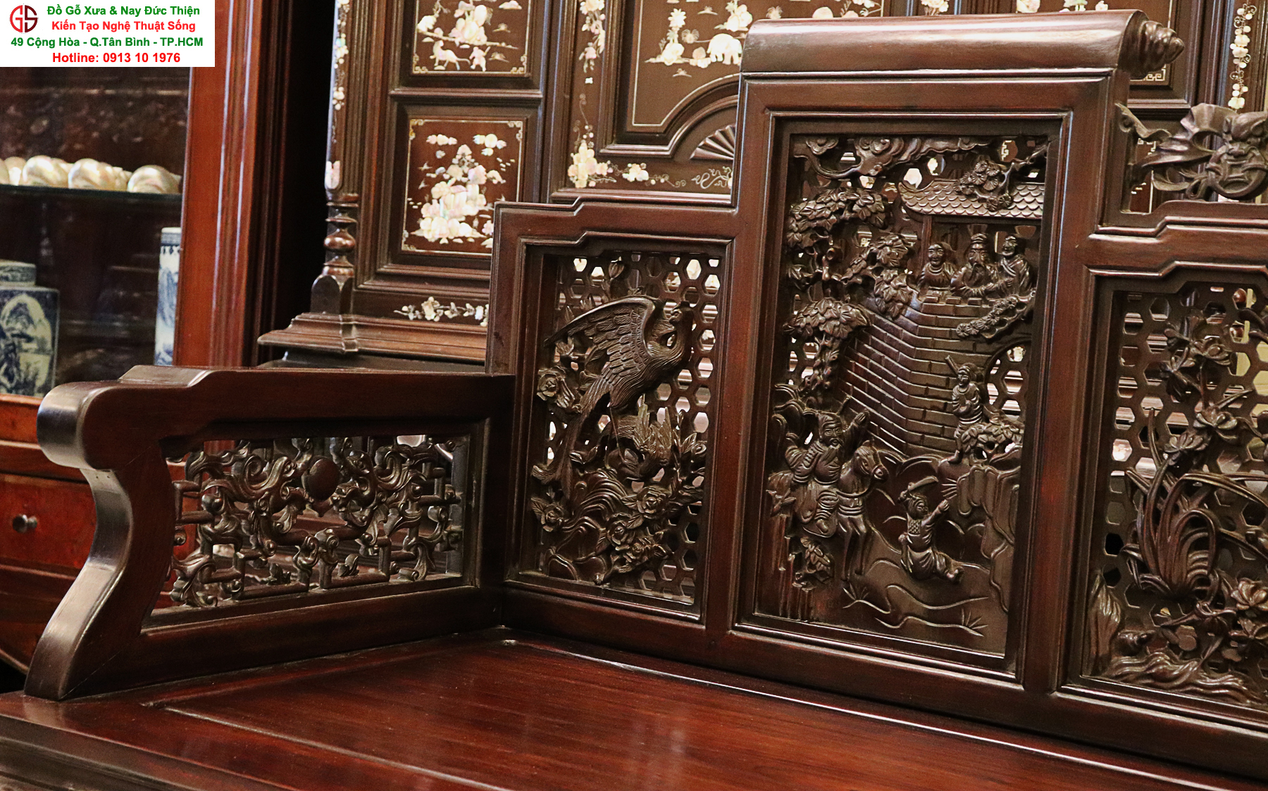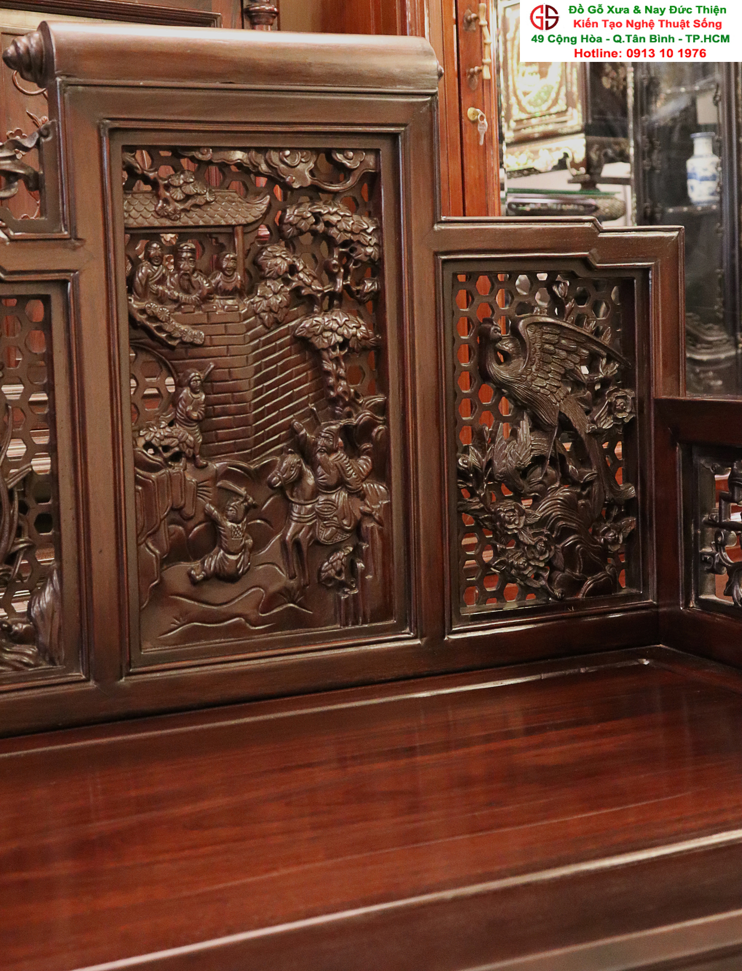 Nếu bạn đang thắc mắc, cảnh người ngựa được chạm khắc trên tựa ghế là gì ? Đó là một trích đoạn trong tích tam quốc, thể hiện khí phách, lòng dũng cảm của những bậc nam nhi. Một điểm ấn tượng khác mà ta không thể không chú ý, chính giữa tựa ghế là chạm khắc bộ cổ đồ thư biểu trưng cho bậc quan văn thời xưa. Có thể nói, người xưa gửi gắm trong bộ bàn ghế thông qua những đường nét chạm khắc thì chủ nhân của nó là một bậc văn võ song toàn, biết thưởng lãm vẻ đẹp của thiên nhiên trời đất, có một cuộc sống hạnh phúc ( hình tượng đôi chim hồng công trầu vào nhau).