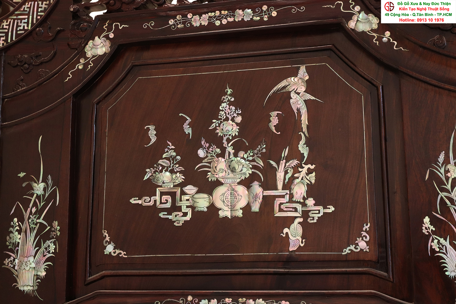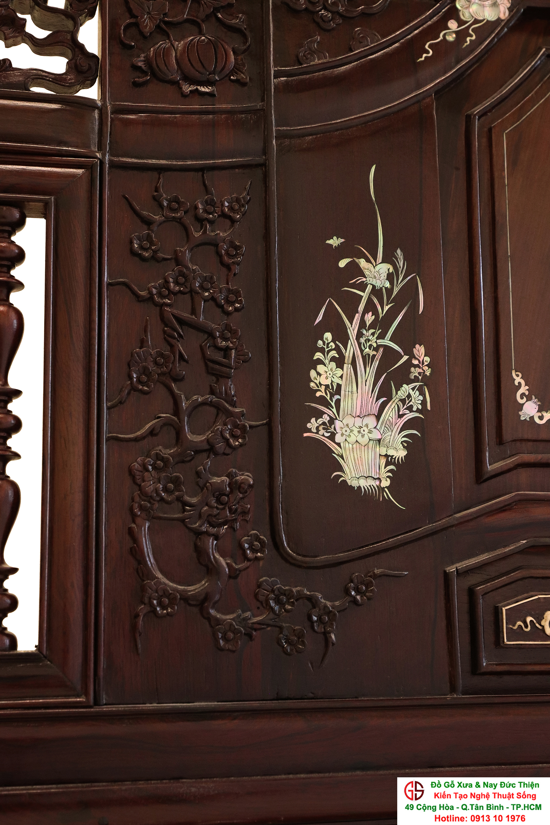 Chất liệu: Khảm nổi + Tất cả đều được làm từ gỗ cẩm lai 100%, gỗ lục lõi, không chắp ghép và không bám rác ( bảo hành Gỗ Cẩm Lai Ta).