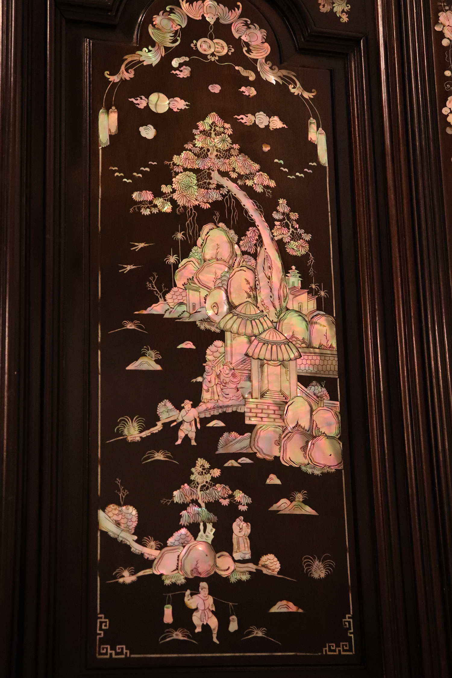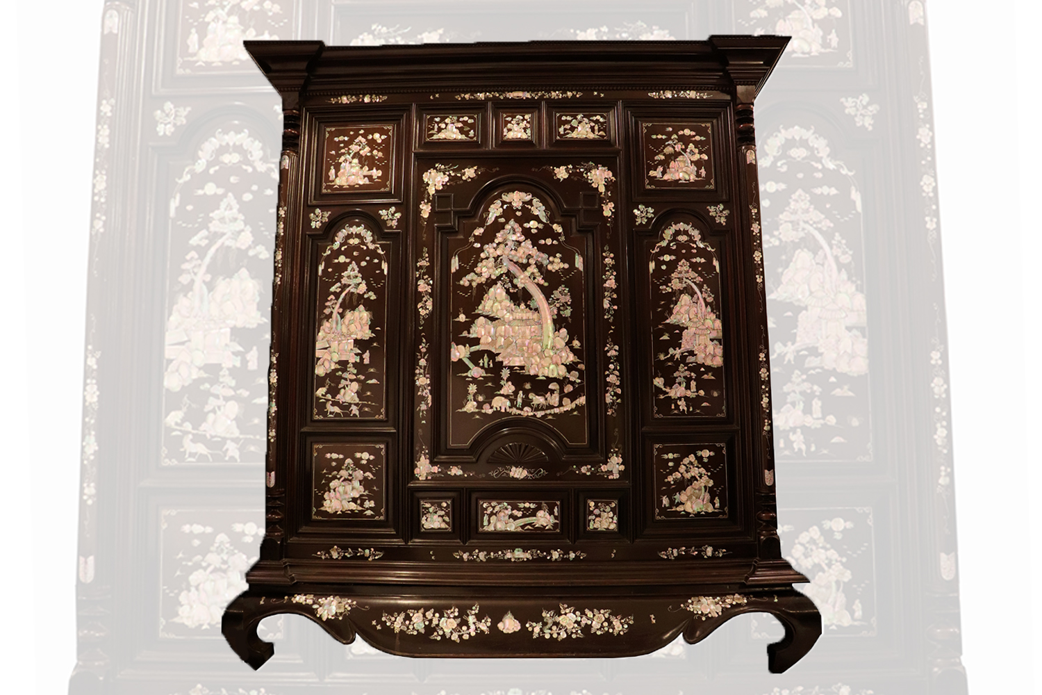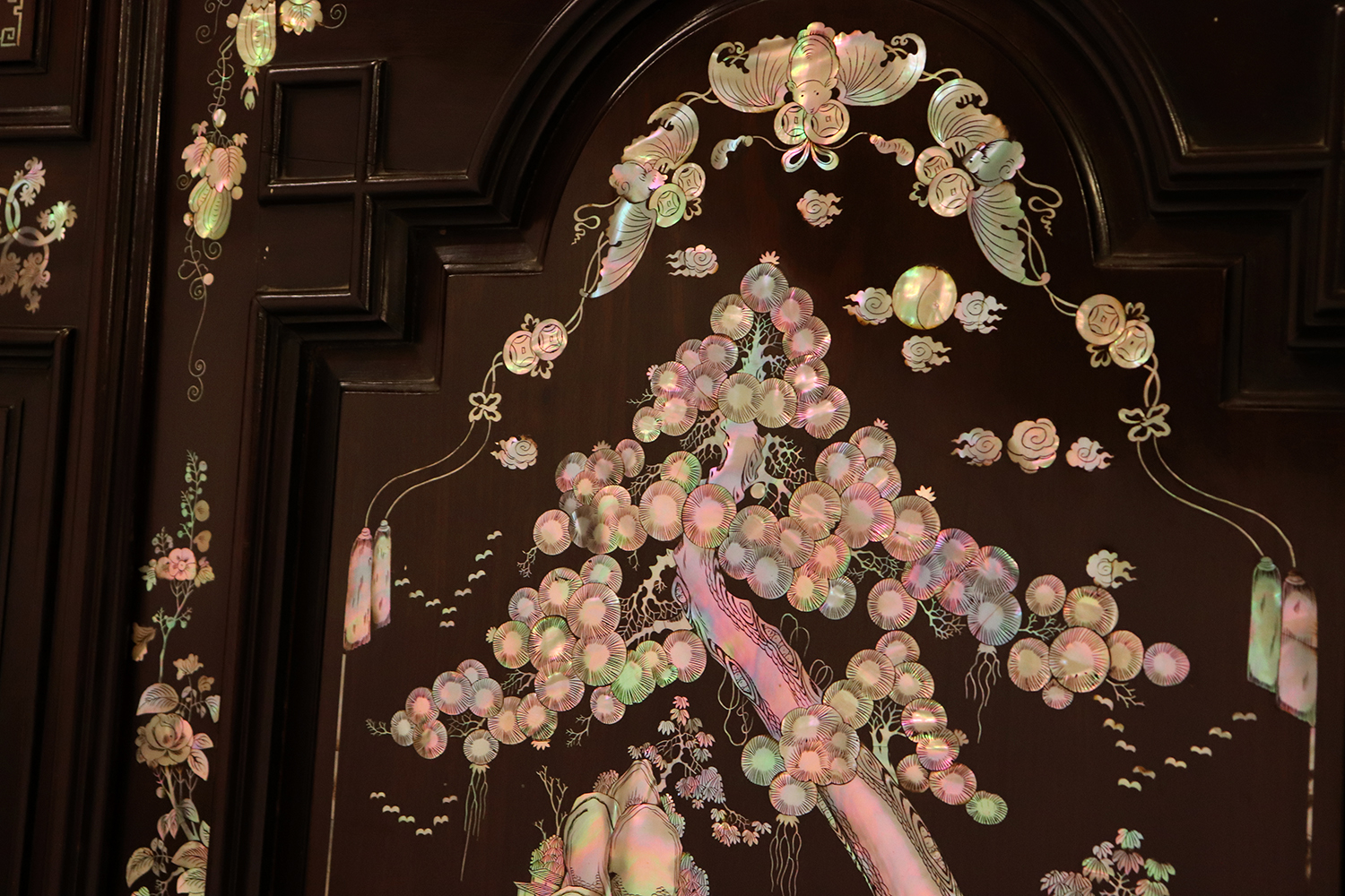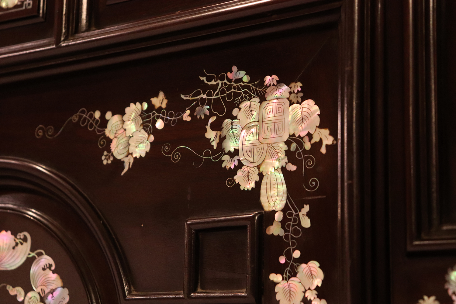 Mang vóc dáng của một chiếc tủ thờ Gò Công cổ - đặc trưng nổi tiếng cho một chiếc tủ thờ Nam Bộ, nhưng chiếc tủ lại được chế tác hoàn toàn từ bàn tay tài hoa tỉ mỉ của những bậc nghệ nhân xứ Huế tài hoa. Từng đường soi chỉ bó đũa đều được thực hiện một cách kỹ lưỡng. Ốc xà cừ cũng được lựa từng miếng ốc thịt, dầy nguyên miếng đỏ lửa vàng chanh nên màu ốc rất sâu màu . Nếu bạn để ý kỹ những hoa văn góc ở chám đại hội sẽ thấy, có những đường cắt tỉa nhỏ chỉ bằng sợi tóc đủ thấy độ kỹ thuật và tài hoa của những người thợ xưa.