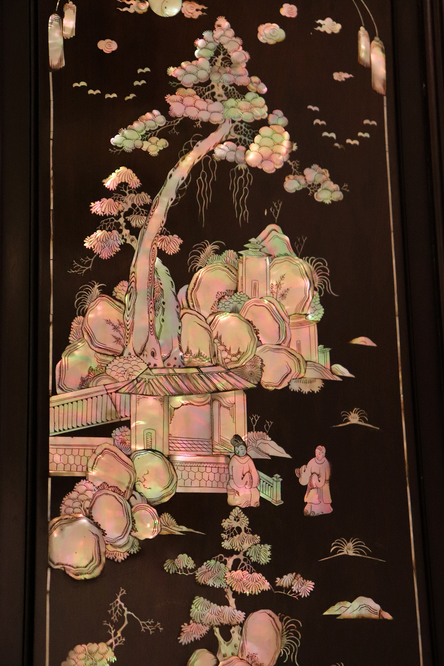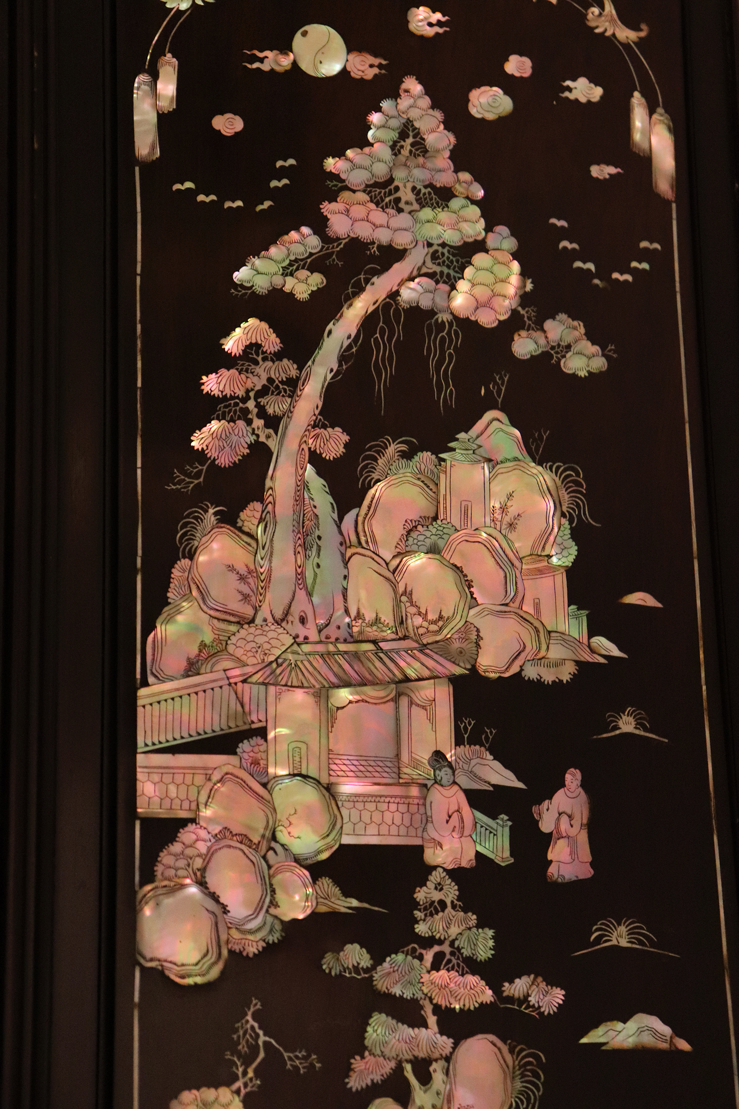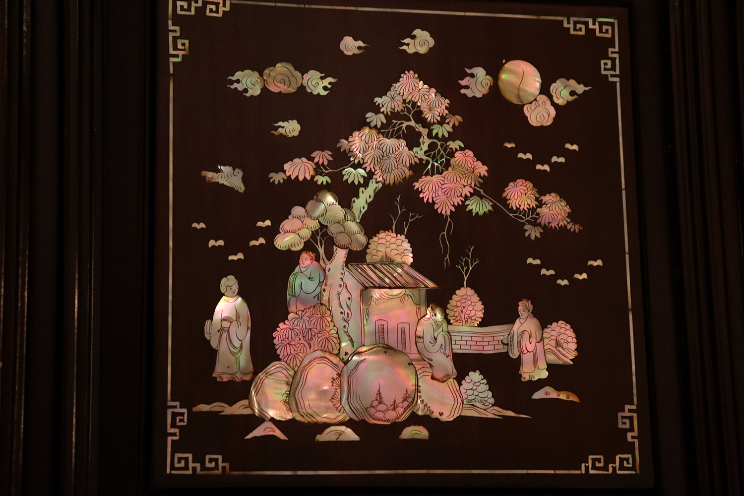 Mang vóc dáng của một chiếc tủ thờ Gò Công cổ - đặc trưng nổi tiếng cho một chiếc tủ thờ Nam Bộ, nhưng chiếc tủ lại được chế tác hoàn toàn từ bàn tay tài hoa tỉ mỉ của những bậc nghệ nhân xứ Huế tài hoa. Từng đường soi chỉ bó đũa đều được thực hiện một cách kỹ lưỡng. Ốc xà cừ cũng được lựa từng miếng ốc thịt, dầy nguyên miếng đỏ lửa vàng chanh nên màu ốc rất sâu màu . Nếu bạn để ý kỹ những hoa văn góc ở chám đại hội sẽ thấy, có những đường cắt tỉa nhỏ chỉ bằng sợi tóc đủ thấy độ kỹ thuật và tài hoa của những người thợ xưa.
