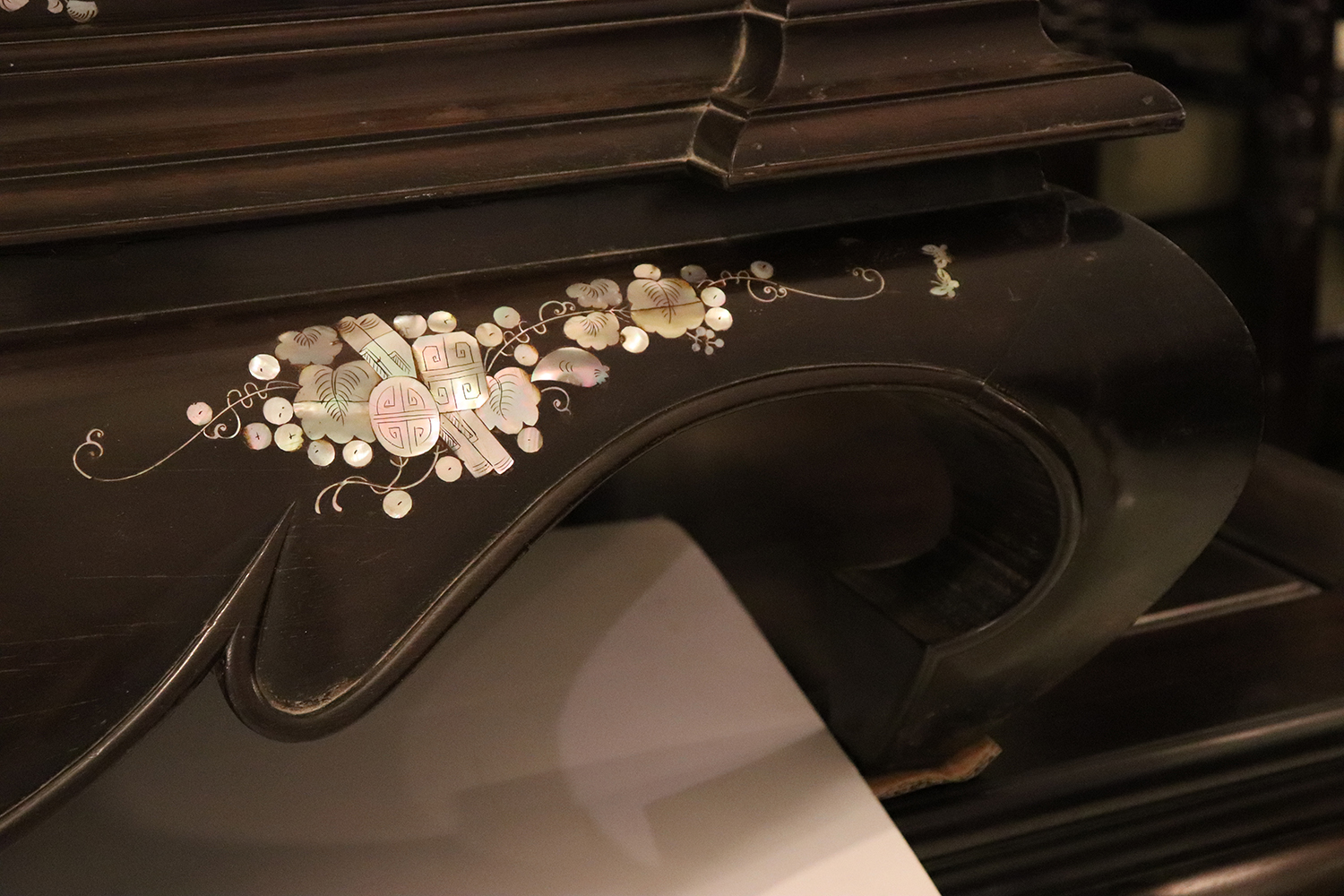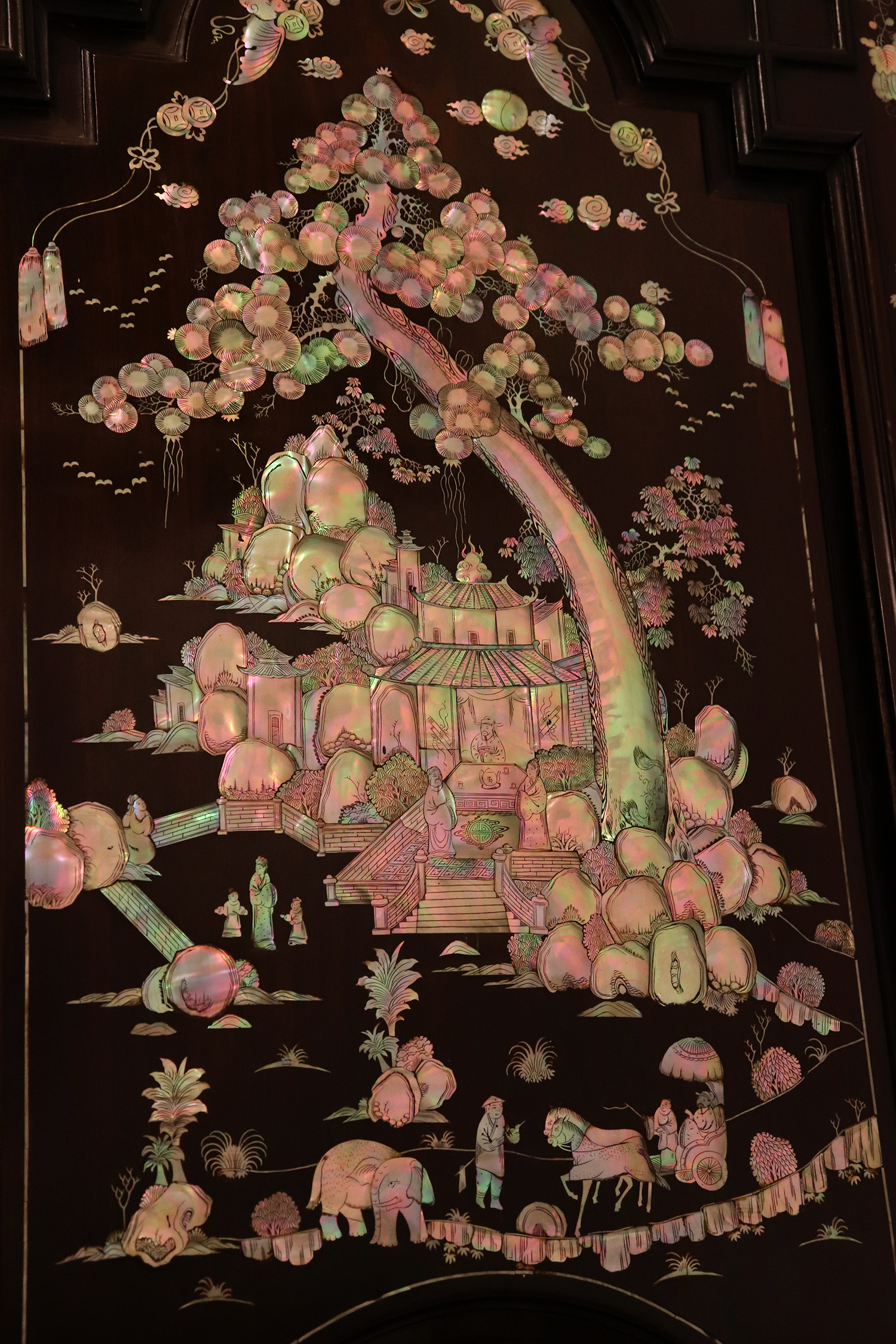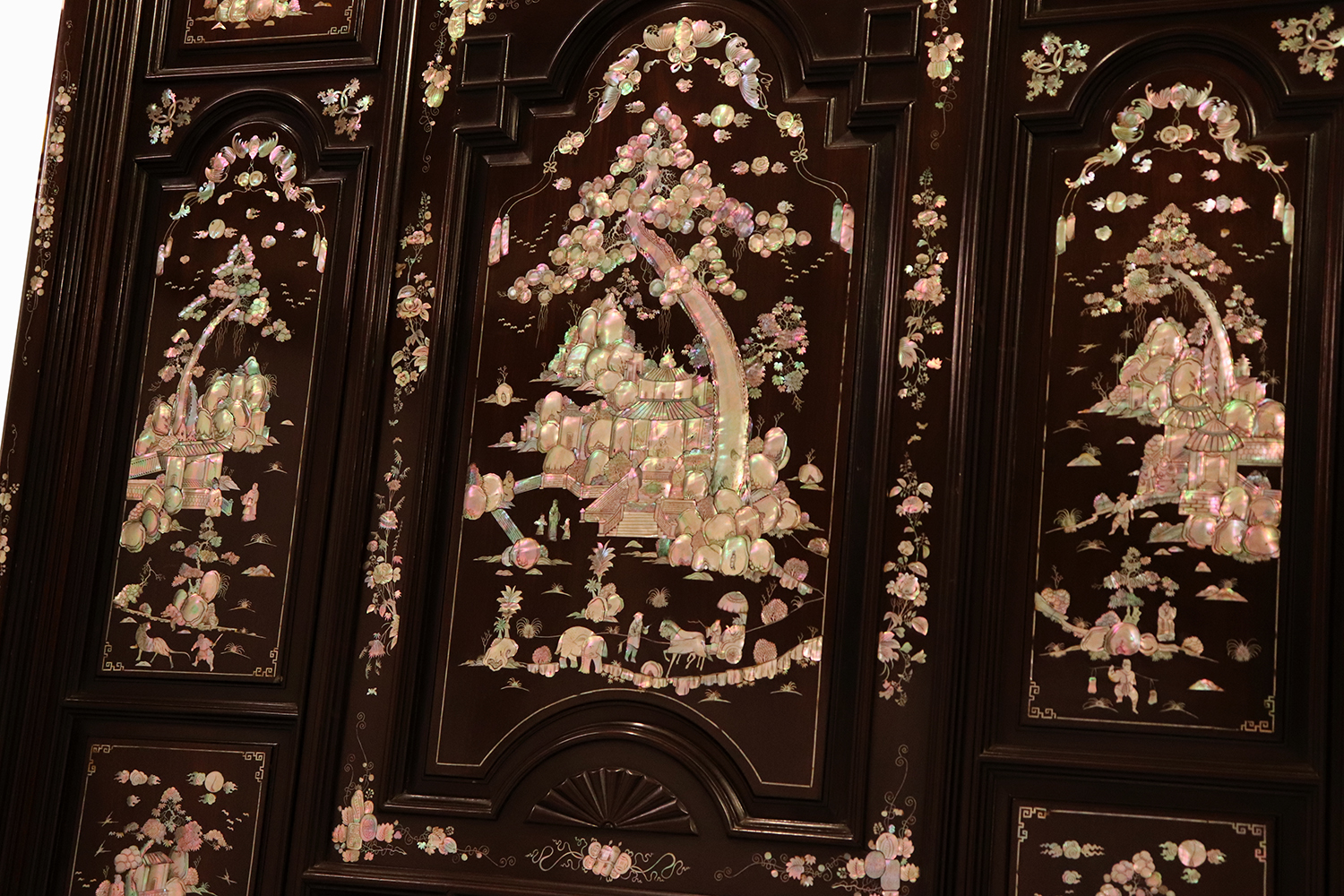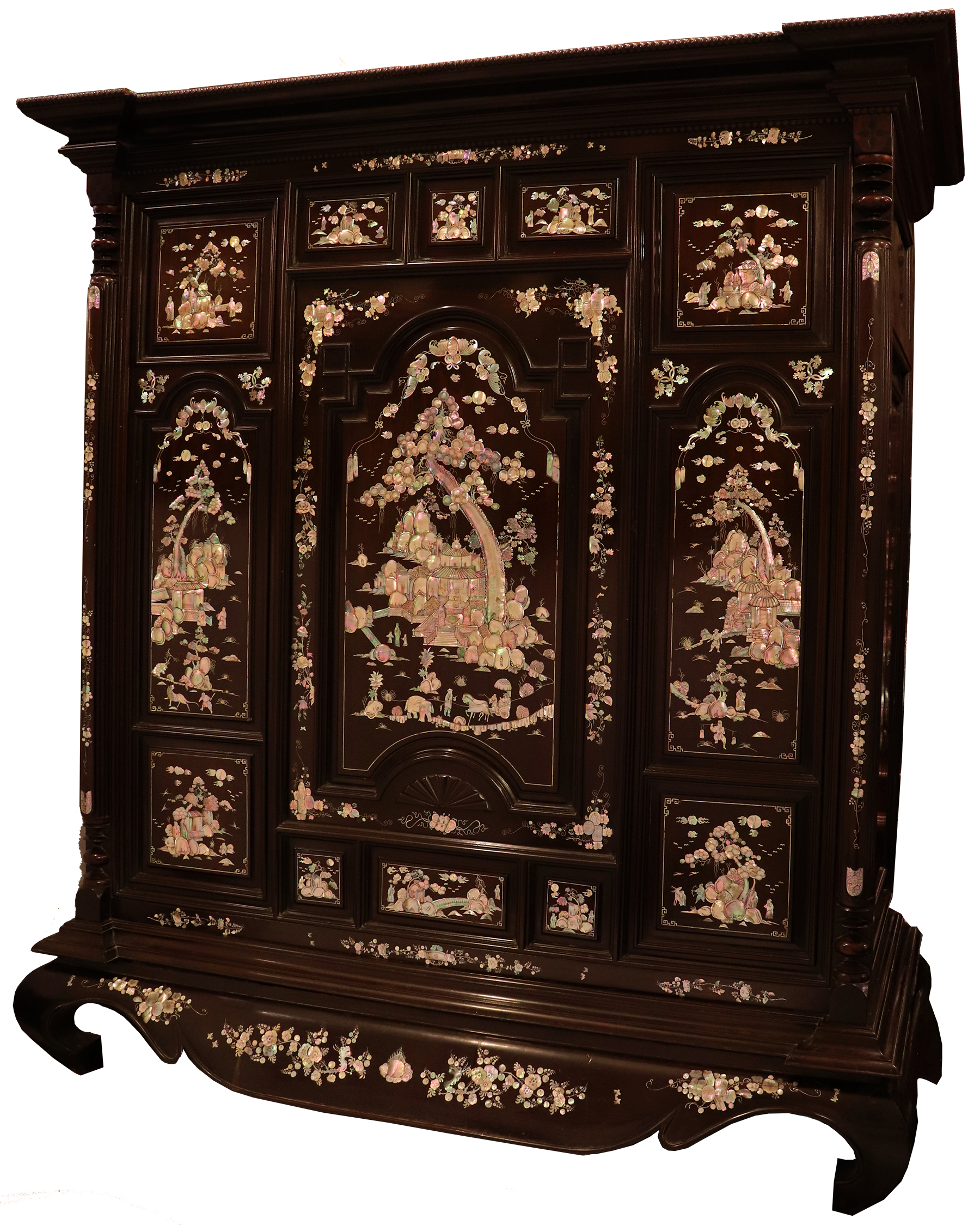 Mang vóc dáng của một chiếc tủ thờ Gò Công cổ - đặc trưng nổi tiếng cho một chiếc tủ thờ Nam Bộ, nhưng chiếc tủ lại được chế tác hoàn toàn từ bàn tay tài hoa tỉ mỉ của những bậc nghệ nhân xứ Huế tài hoa. Từng đường soi chỉ bó đũa đều được thực hiện một cách kỹ lưỡng. Ốc xà cừ cũng được lựa từng miếng ốc thịt, dầy nguyên miếng đỏ lửa vàng chanh nên màu ốc rất sâu màu . Nếu bạn để ý kỹ những hoa văn góc ở chám đại hội sẽ thấy, có những đường cắt tỉa nhỏ chỉ bằng sợi tóc đủ thấy độ kỹ thuật và tài hoa của những người thợ xưa.