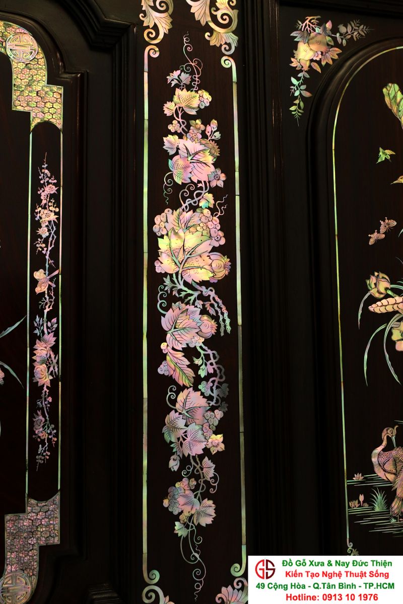 Phần cẩn ốc sà cừ cũng là một chuẩn mực về đường nét nghệ thuật cũng như kỹ thuật cắt tỉa, tạo hình trên ốc. Có lẽ để có được một lượng lớn ốc đẹp để làm đủ cho chiếc tủ này, người nghệ nhân yêu nghề đã phải mất rất nhiều năm: " đãi cát tìm vàng" , "gặn đục khơi trong" chắt lọc từng miếng ốc đẹp, dành dụm lại để cuối cùng dồn hết tinh hoa, tâm huyết để làm lên một " tác phẩm để đời", cũng là ghi dấu với đời về tài năng của mình. Từng miếng ốc sà cừ Singapore - chất ốc xịn sáng lấp lánh, đỏ lửa vàng chanh, xanh ngọc 7 màu