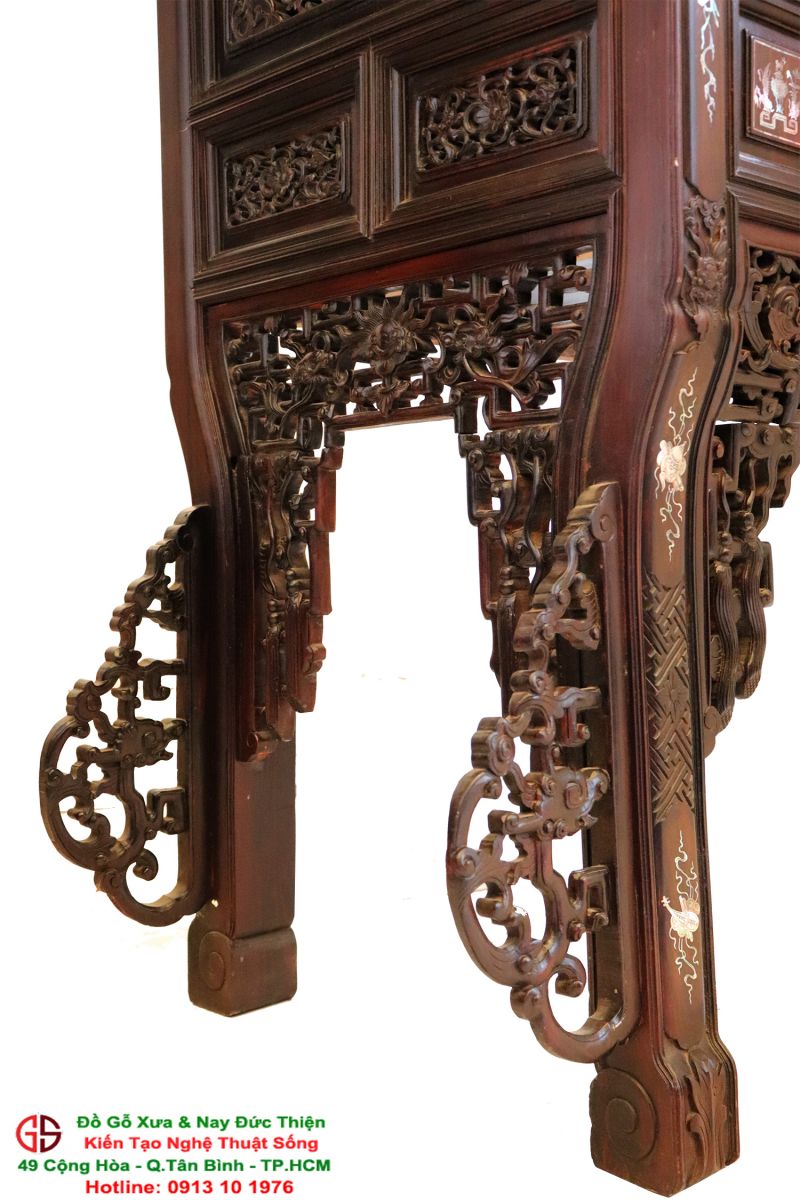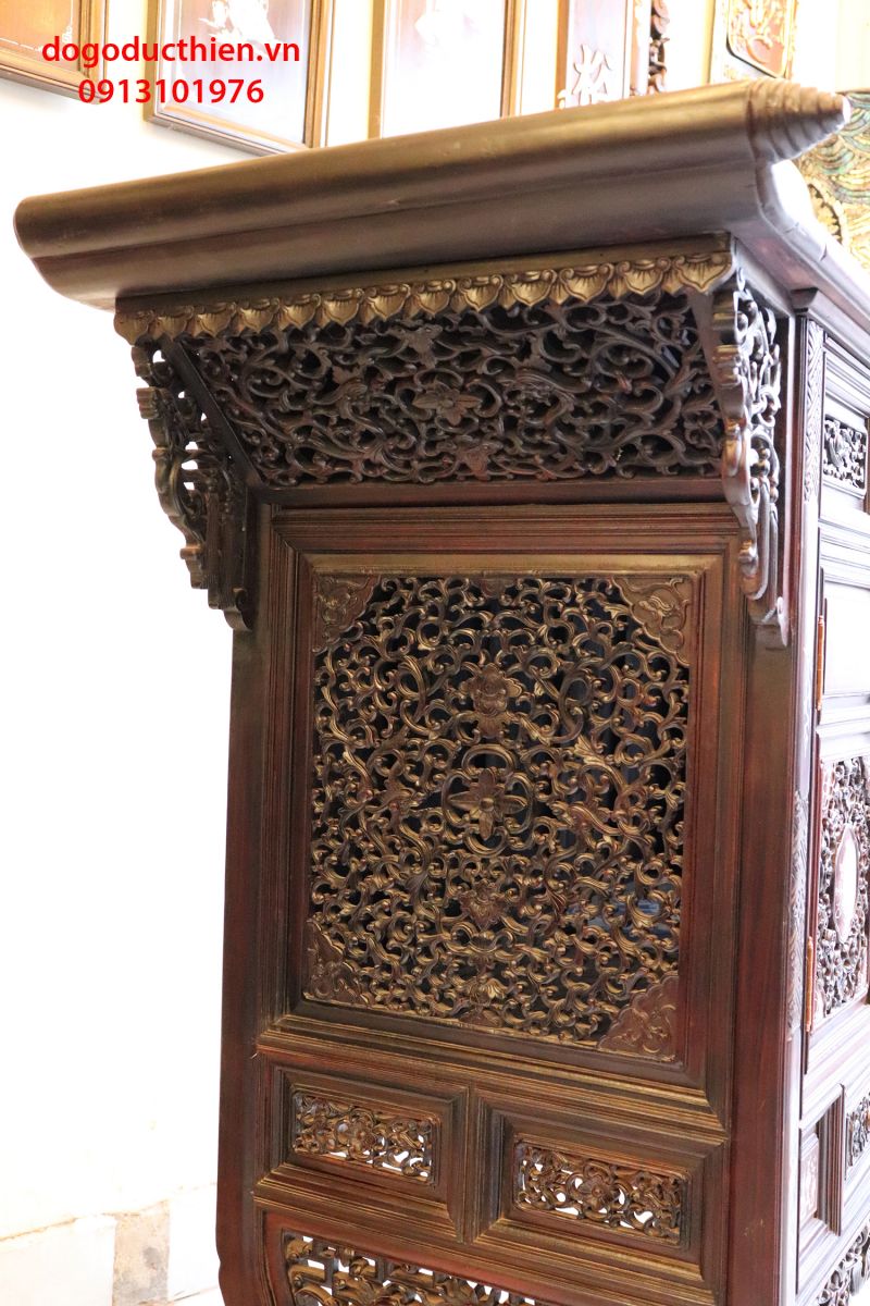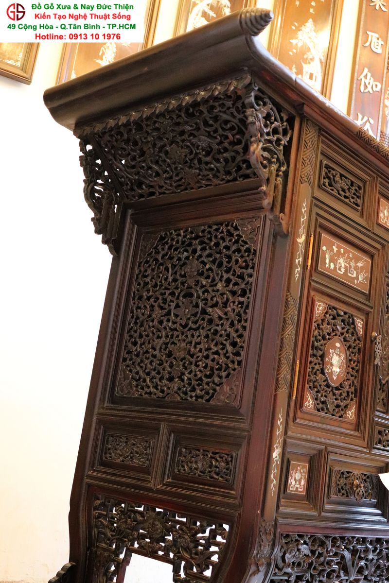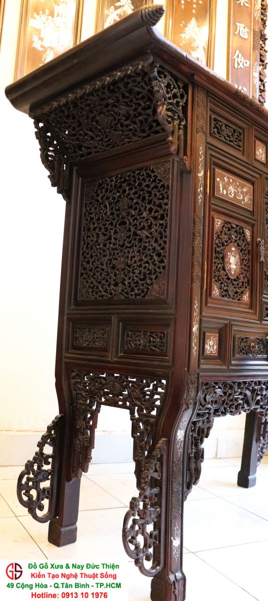 Một chiếc tủ thờ Huế xịn được chạm khắc hoàn toàn thủ công tay, mang đậm dấu ấn cung đình Huế với vẻ đẹp cổ kính, quý tộc, giàu sang, rất đáng sưu tầm và sở hữu