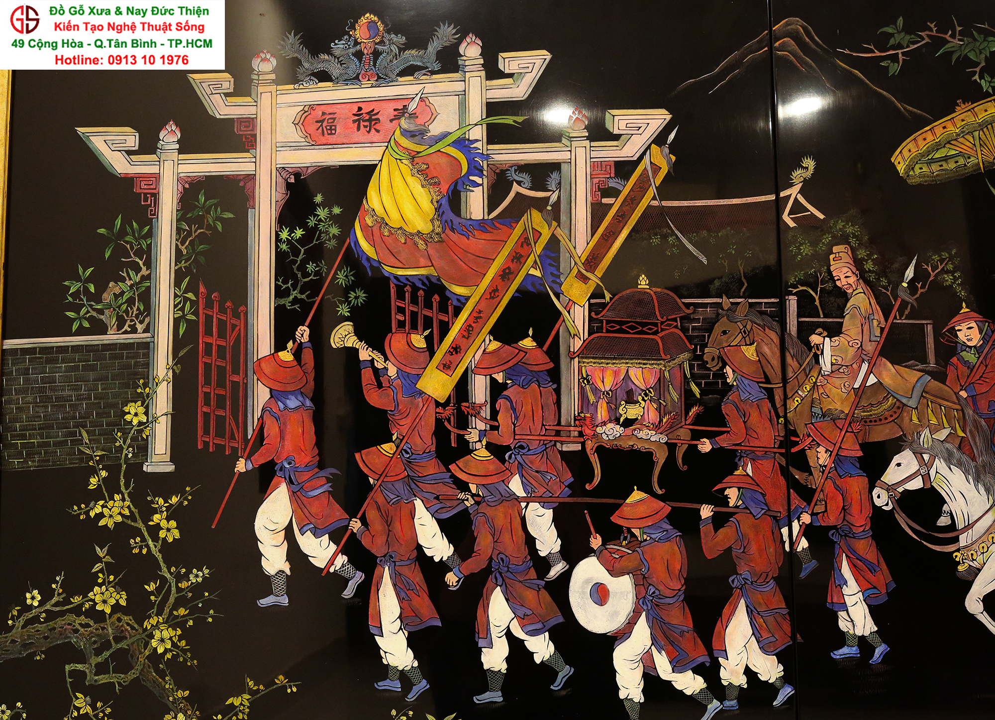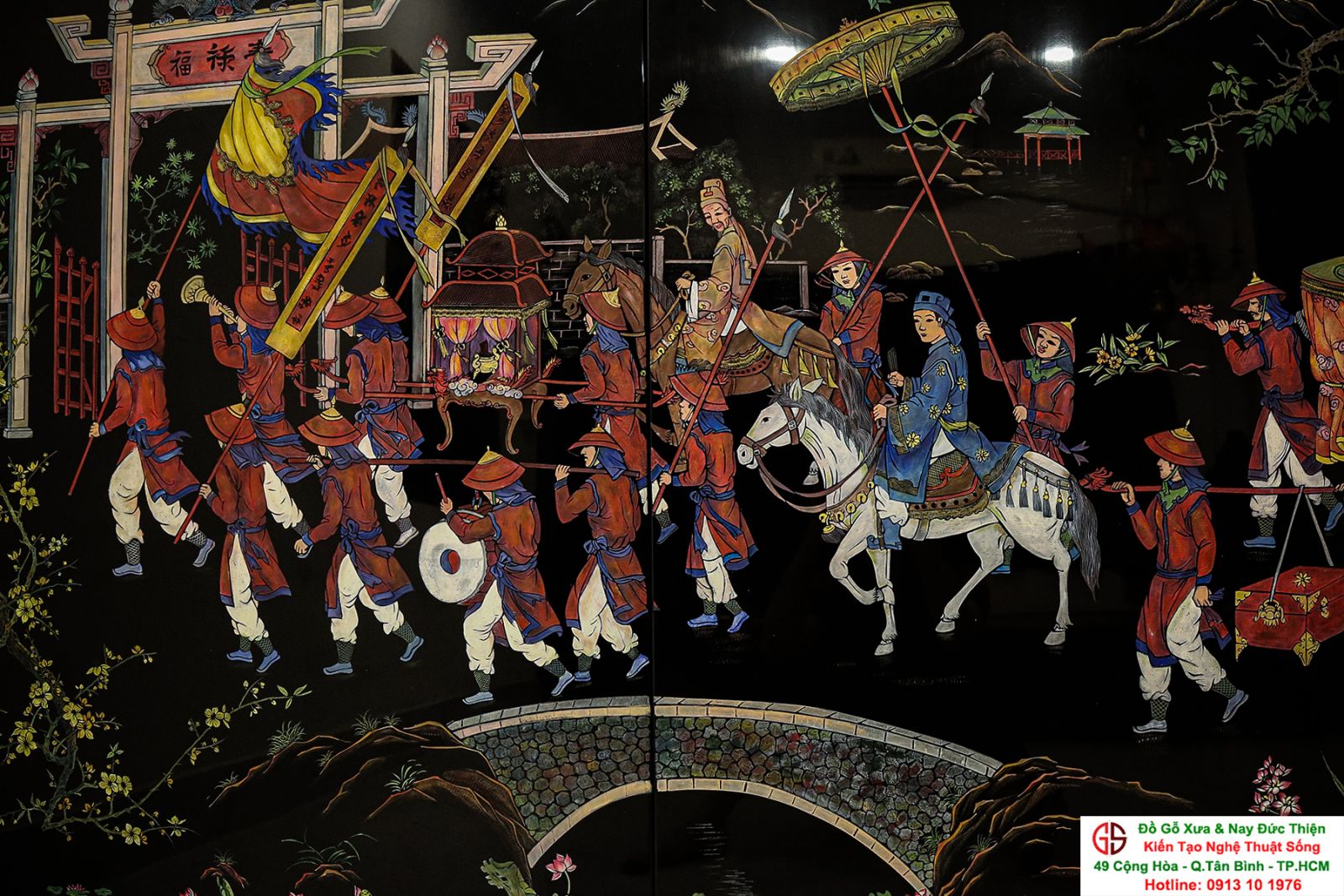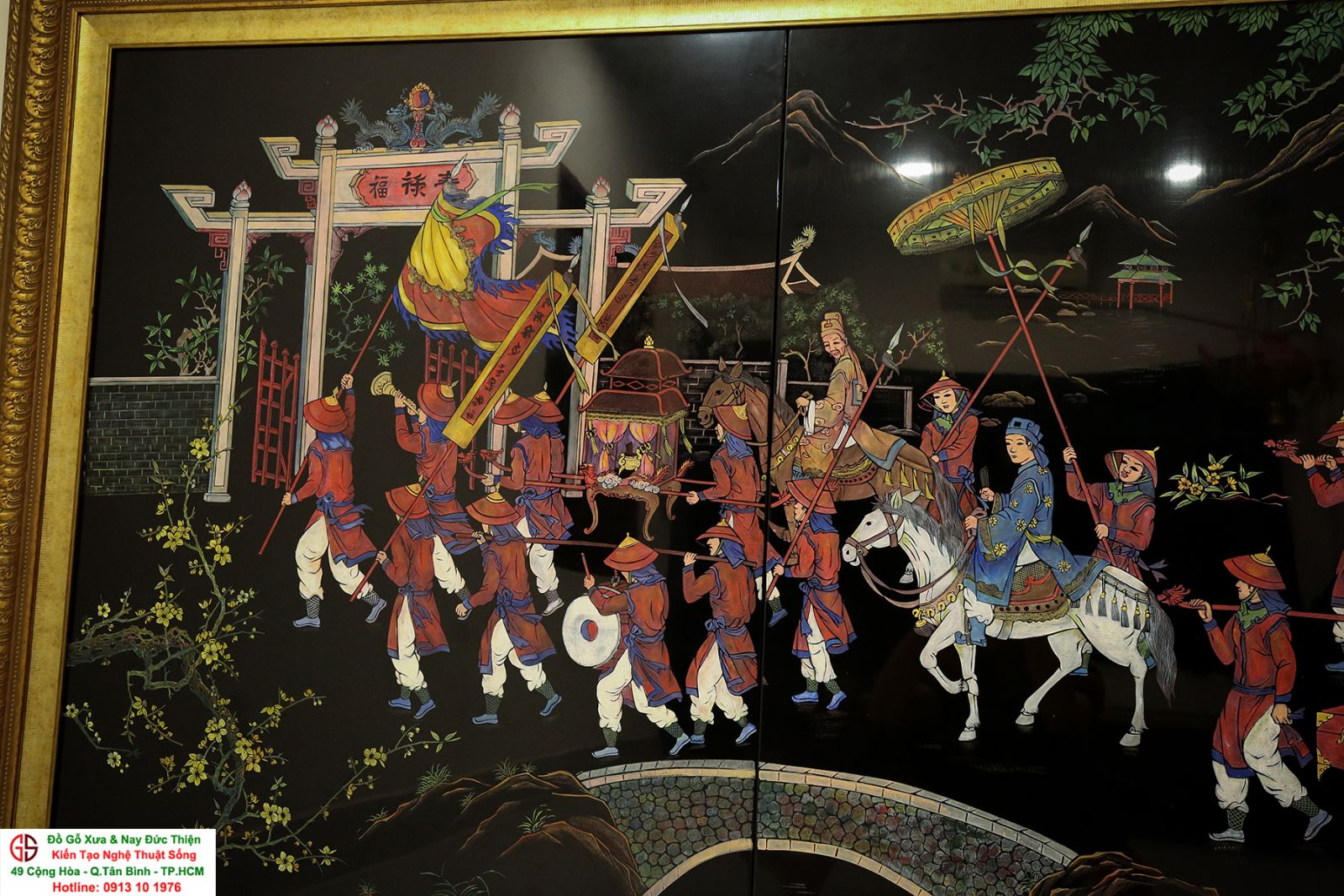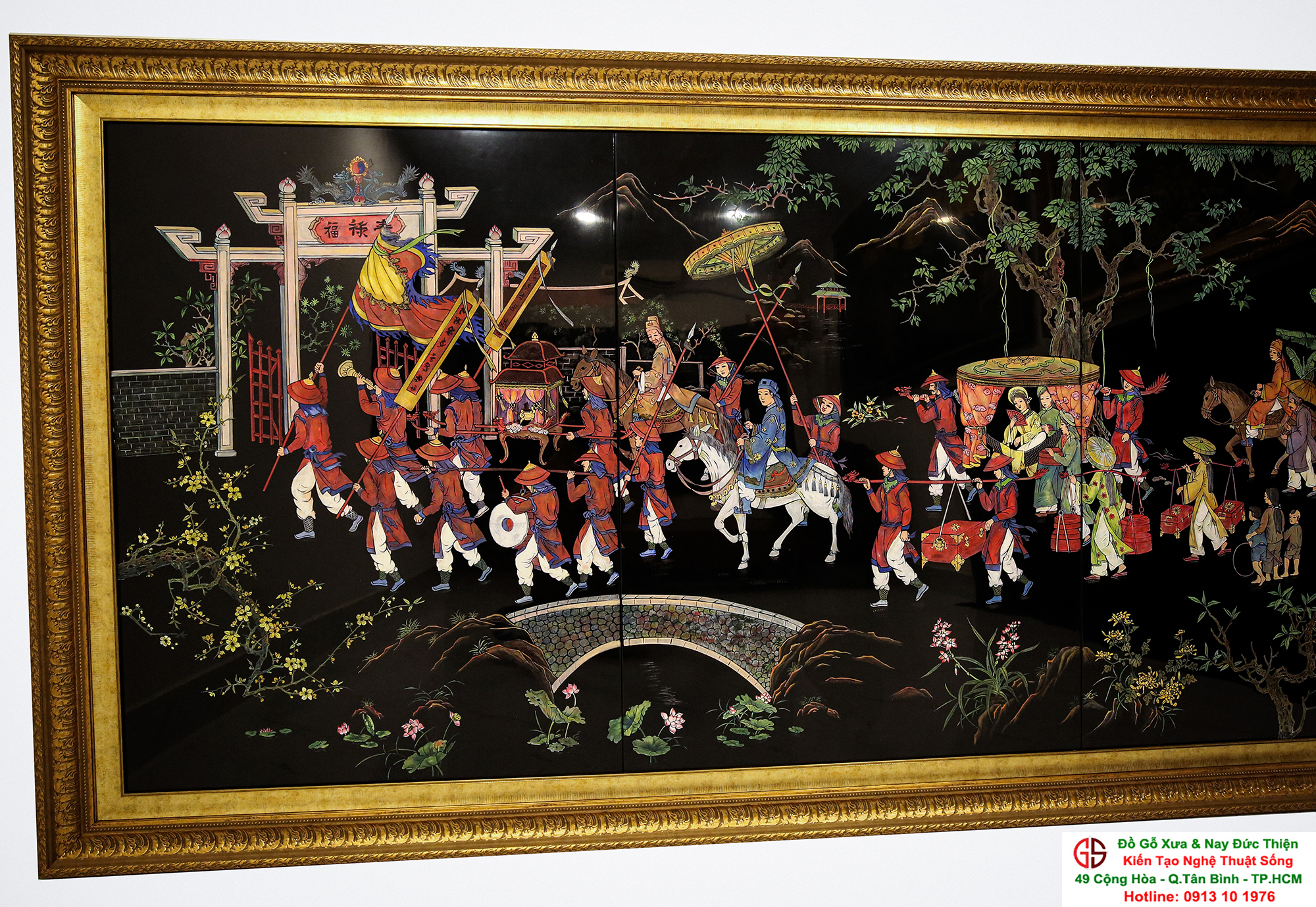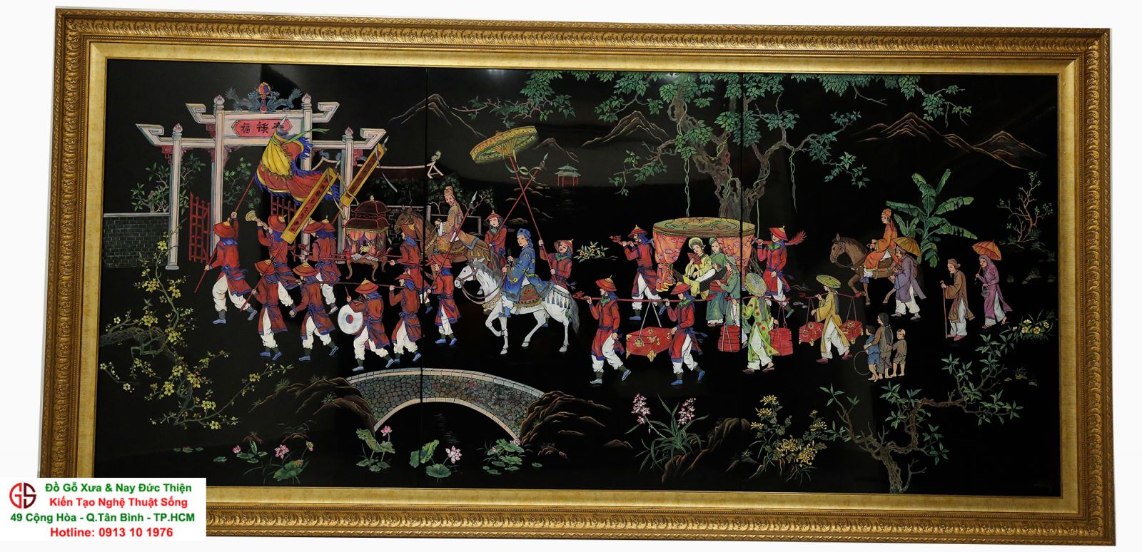 Tấm tranh sơn mài khắc trũng đề tài Vinh Quy Bái Tổ có kích thước lớn đặc biệt: Ngang 290 cm x cao 140 cm