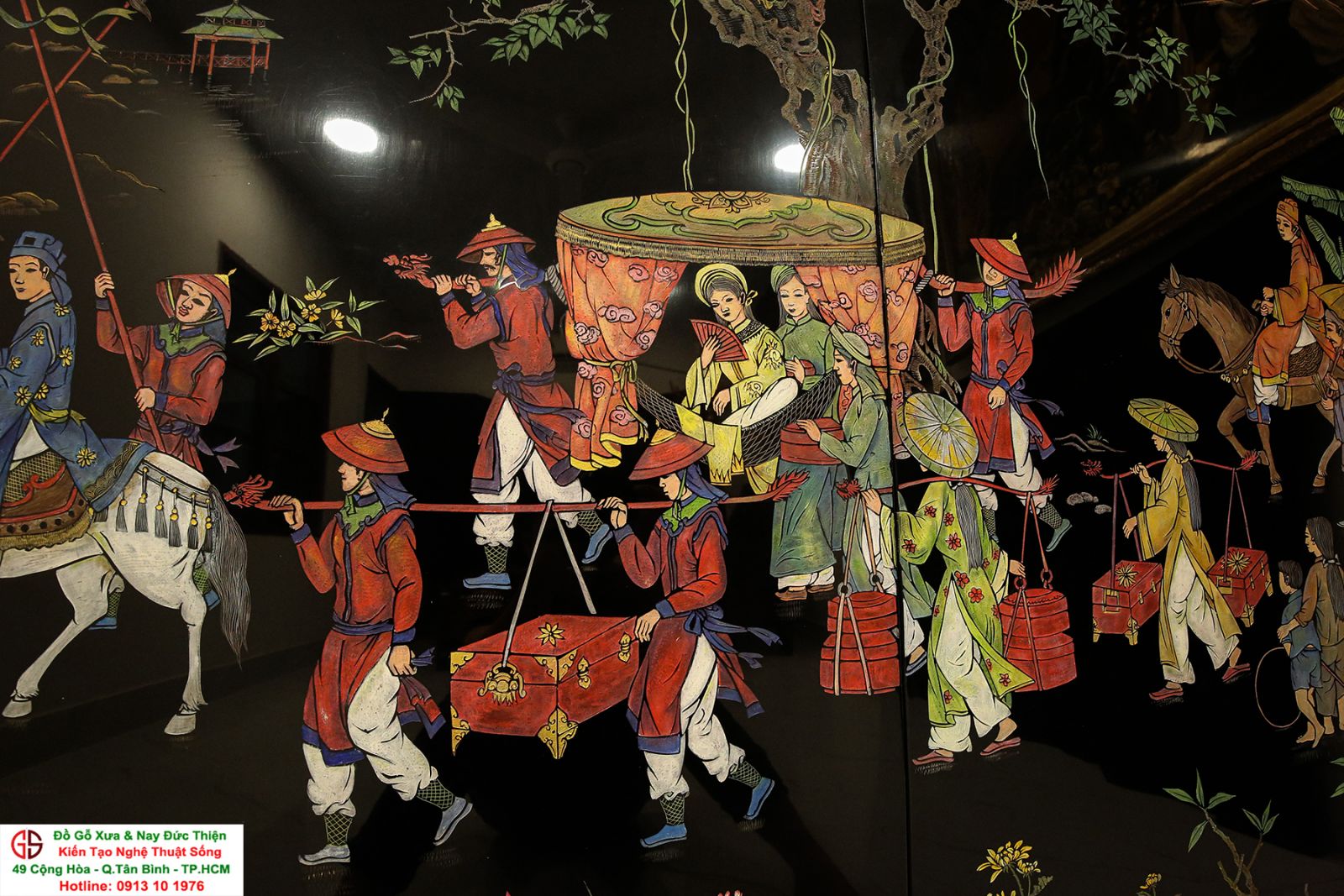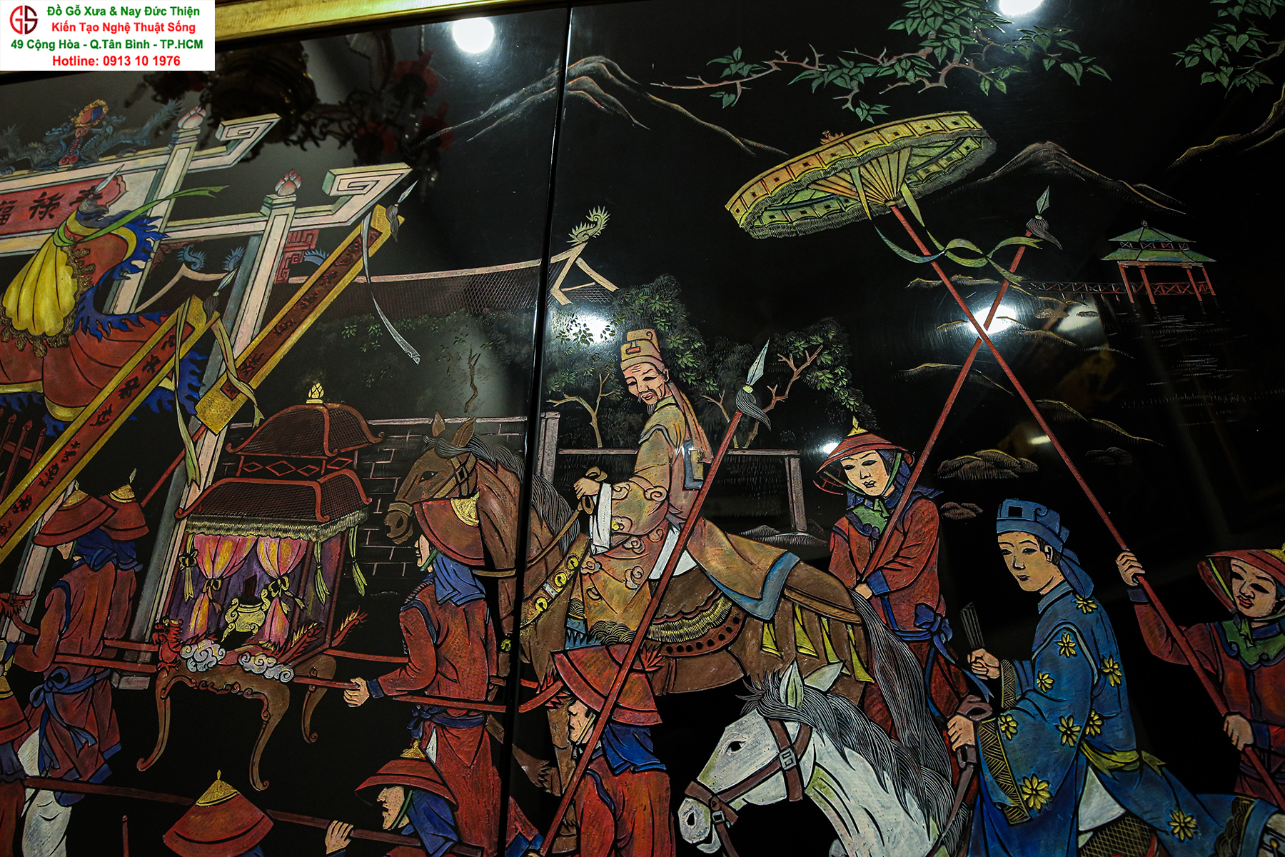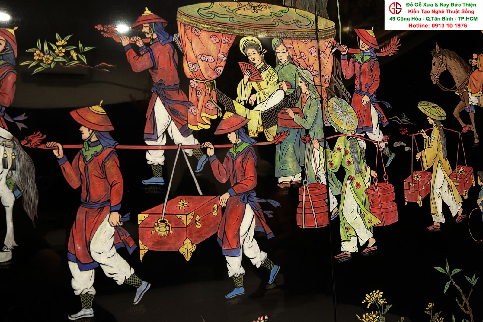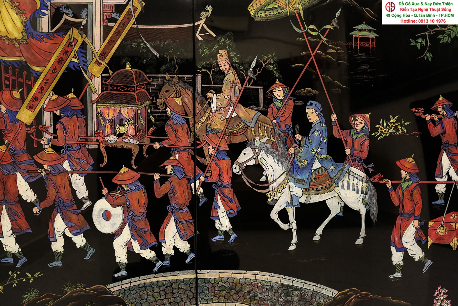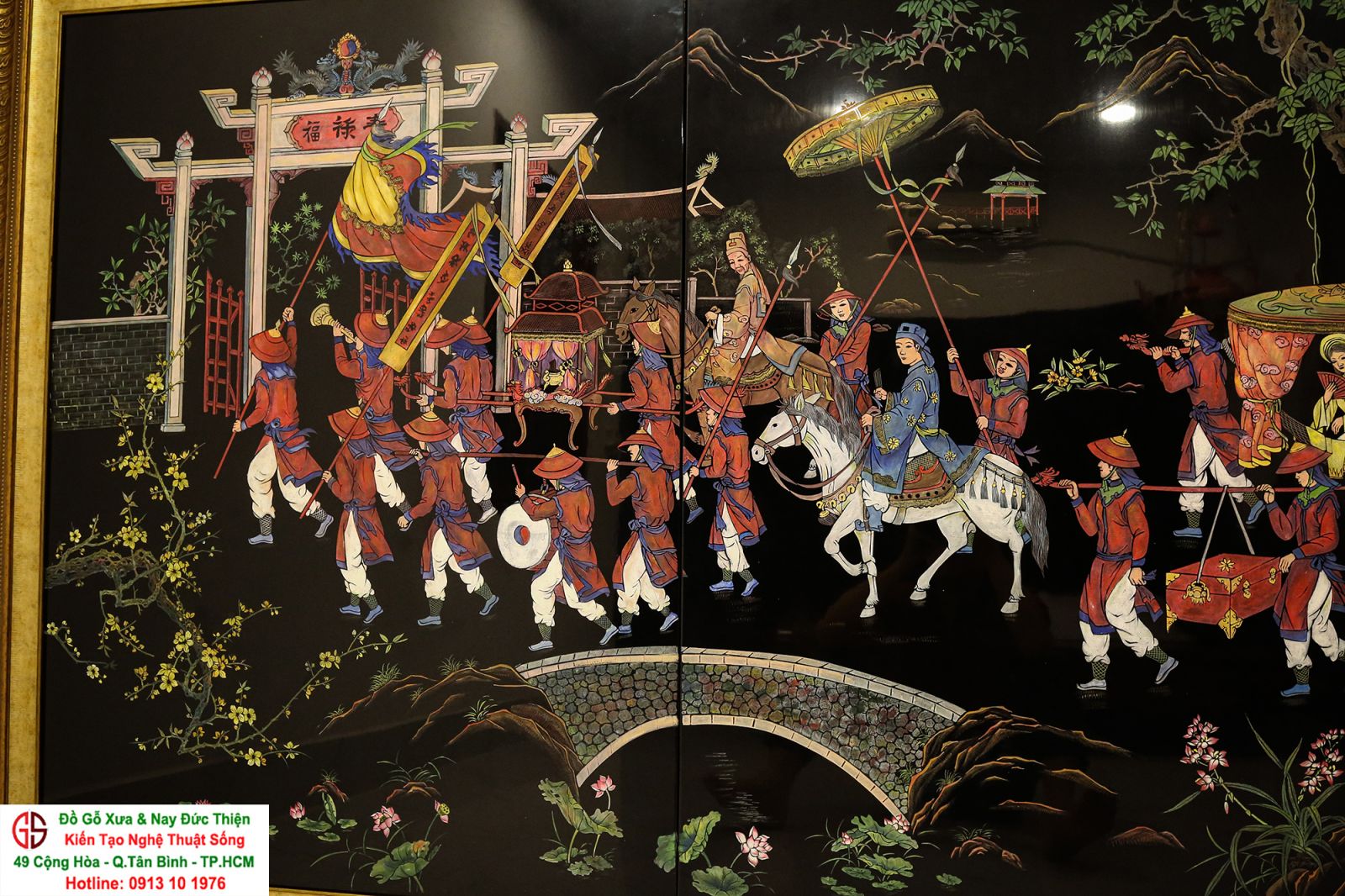 Tấm tranh sơn mài khắc trũng đề tài Vinh Quy Bái Tổ có kích thước lớn đặc biệt: Ngang 290 cm x cao 140 cm