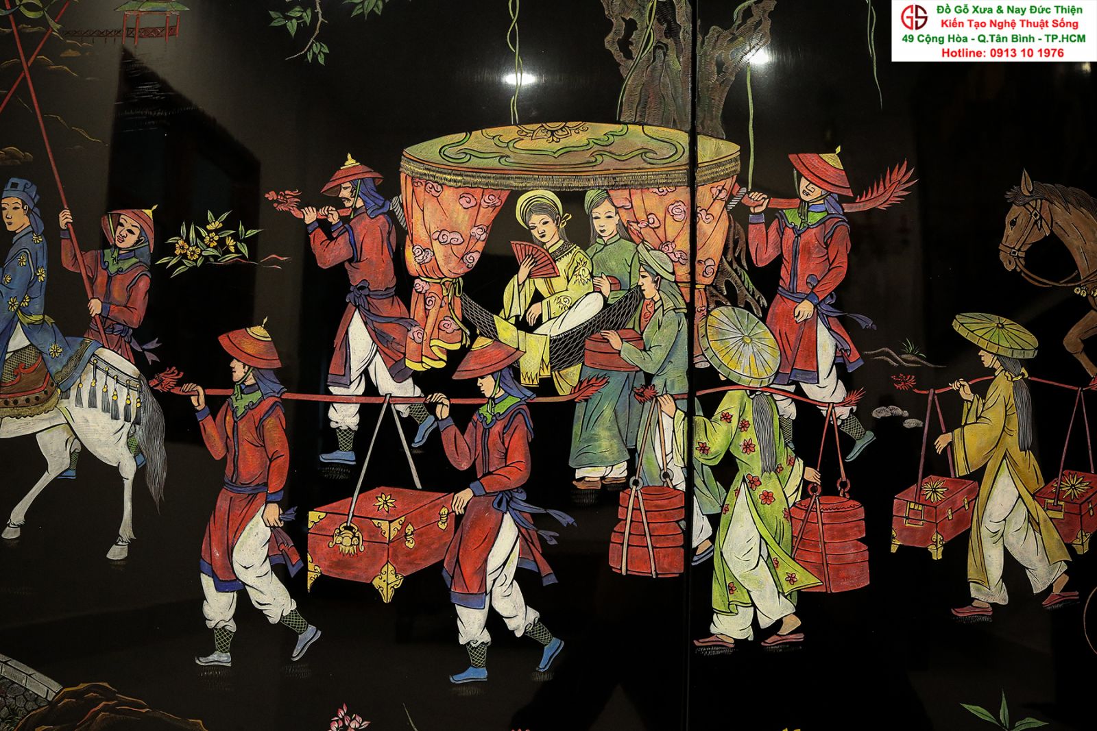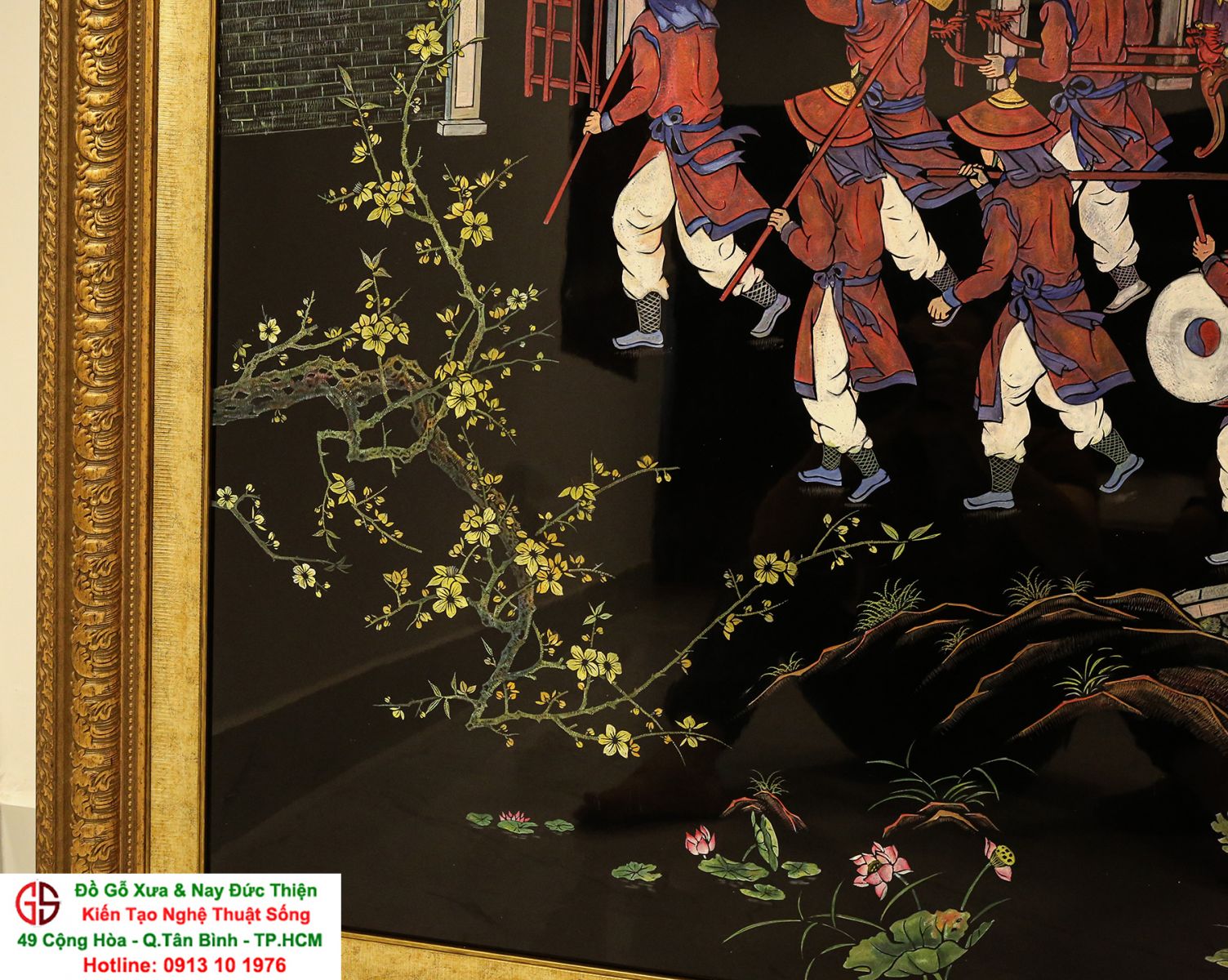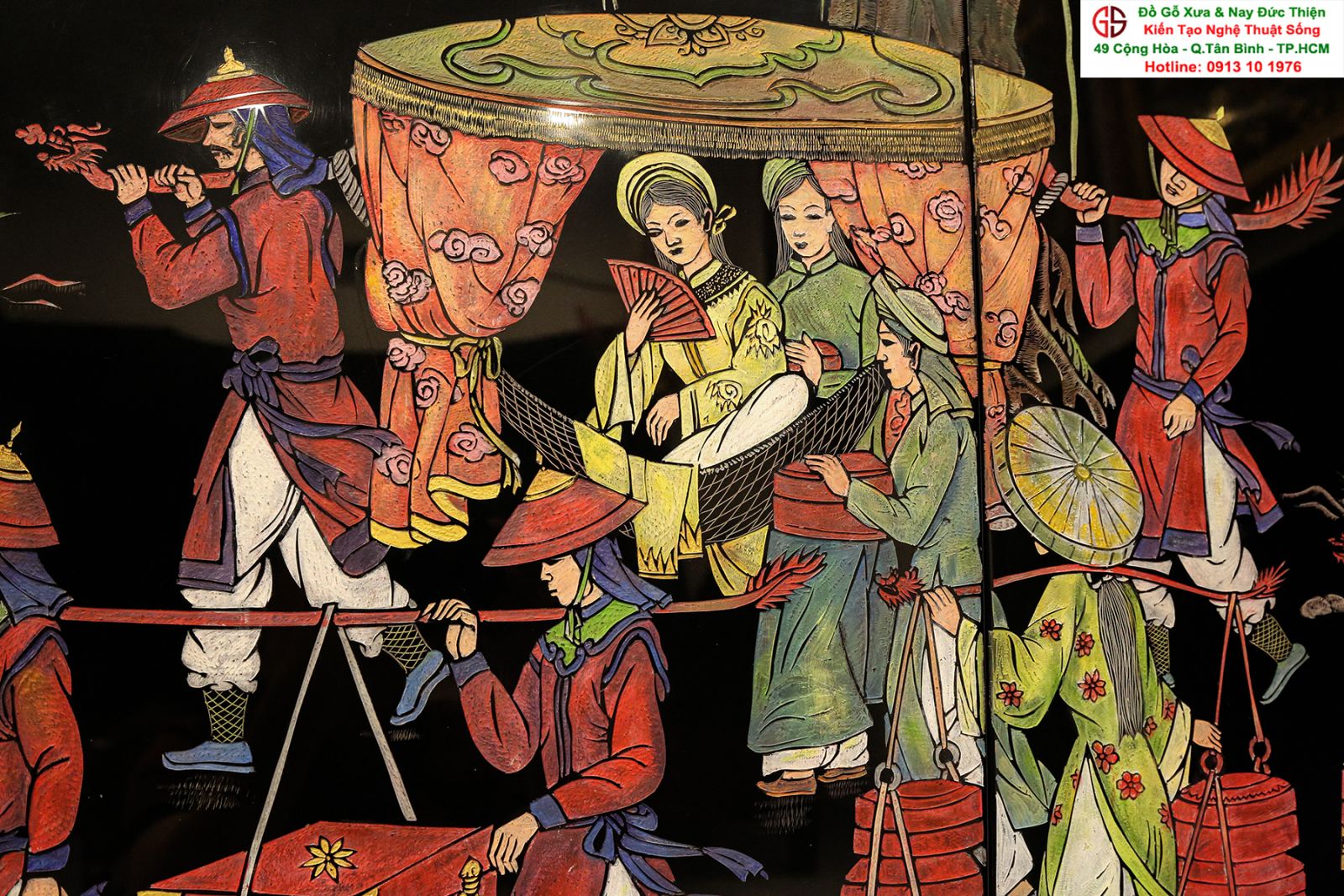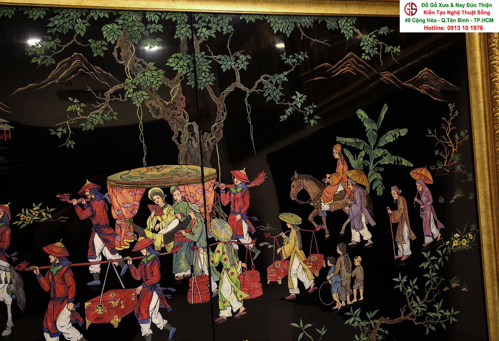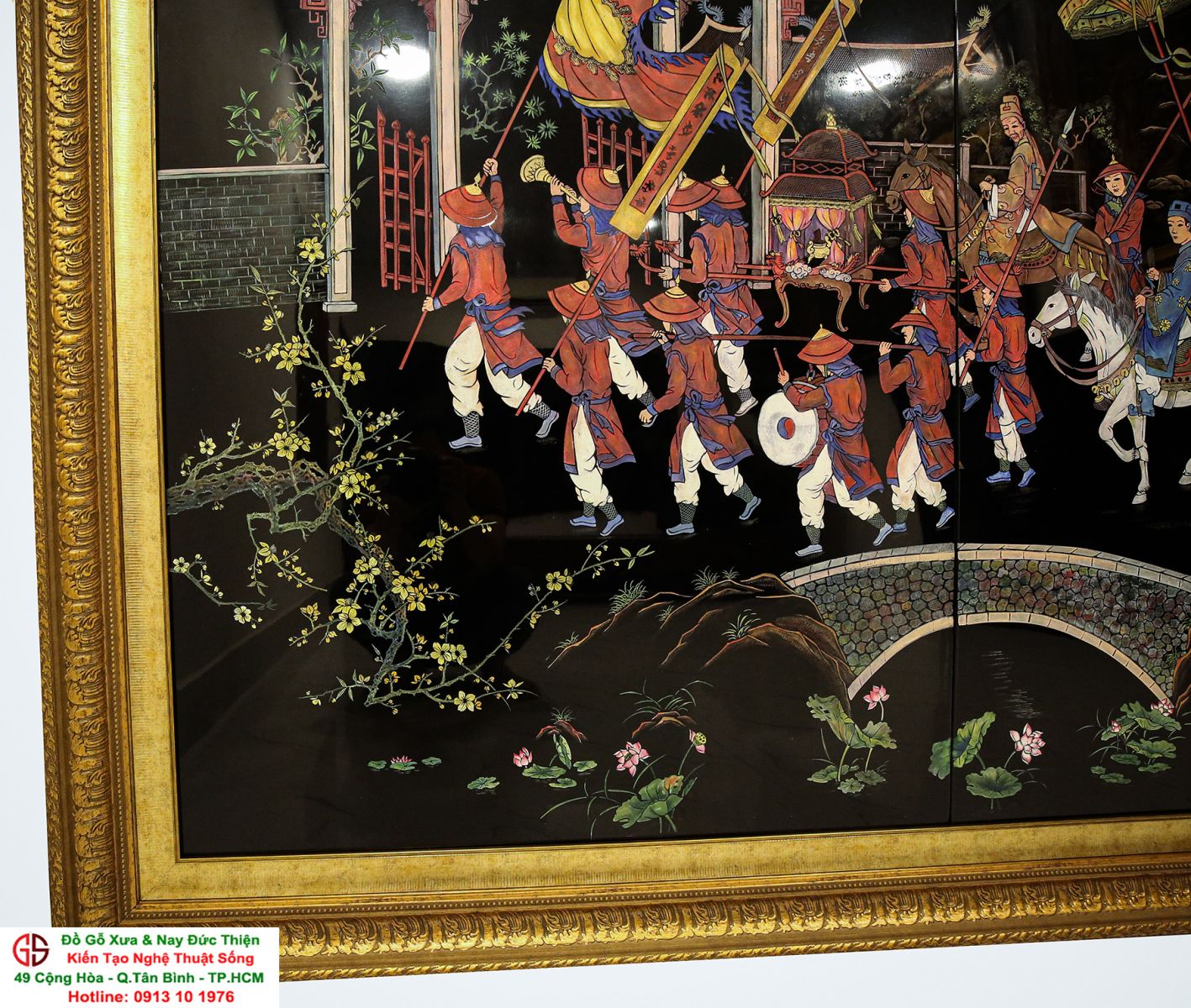 Tấm tranh sơn mài khắc trũng đề tài Vinh Quy Bái Tổ có kích thước lớn đặc biệt: Ngang 290 cm x cao 140 cm
